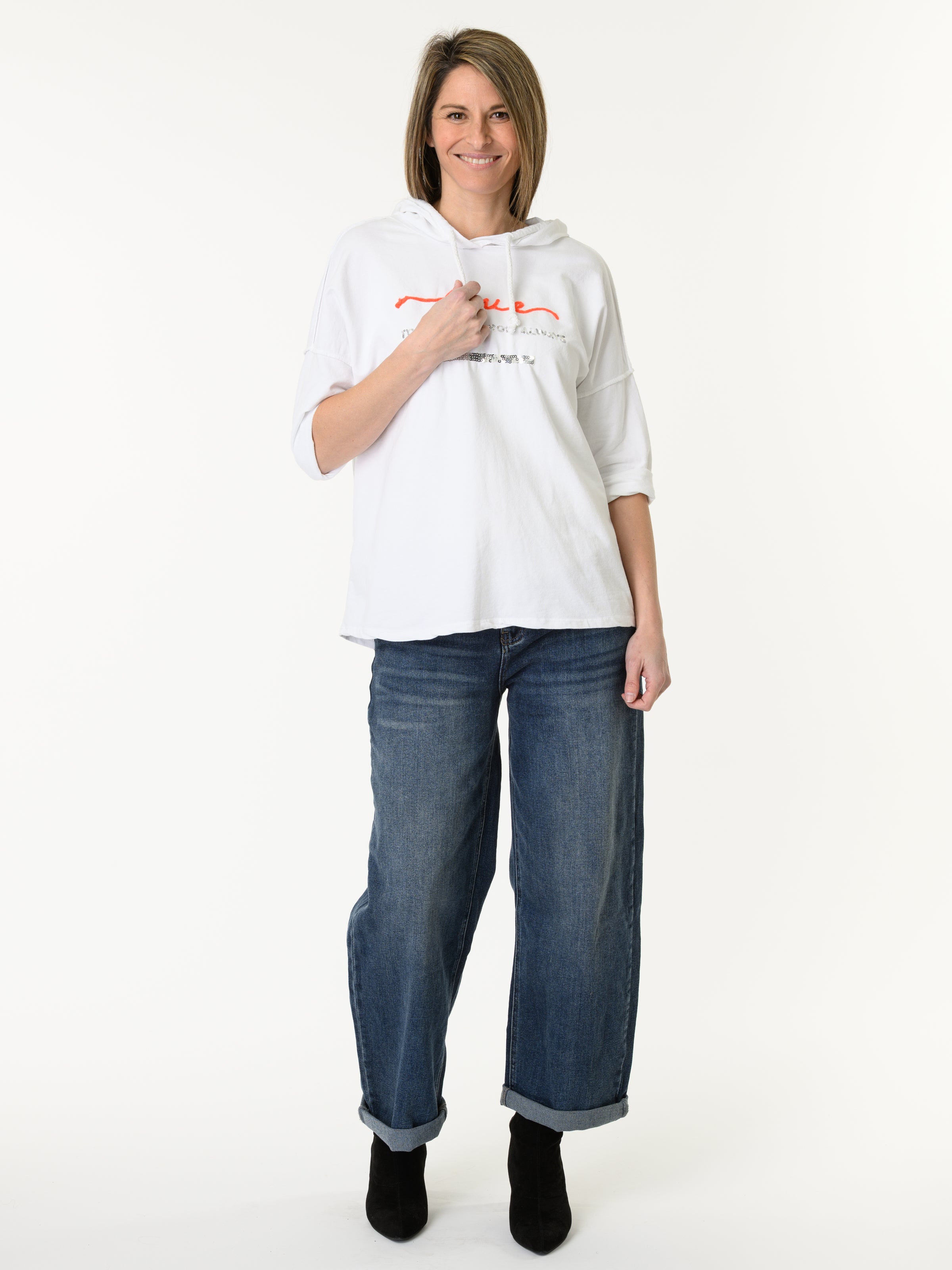 Découvrez notre chandail blanc ''Love'' avec capuchon. Ce modèle à manches 3/4 comporte le mot ''Love'' brodé dans un tissu orange. Il est également orné des mots: ''Today, Tomorrow et Always'' en paillette argentée. Cette pièce ajoute une touche originale et allie style et tendance.