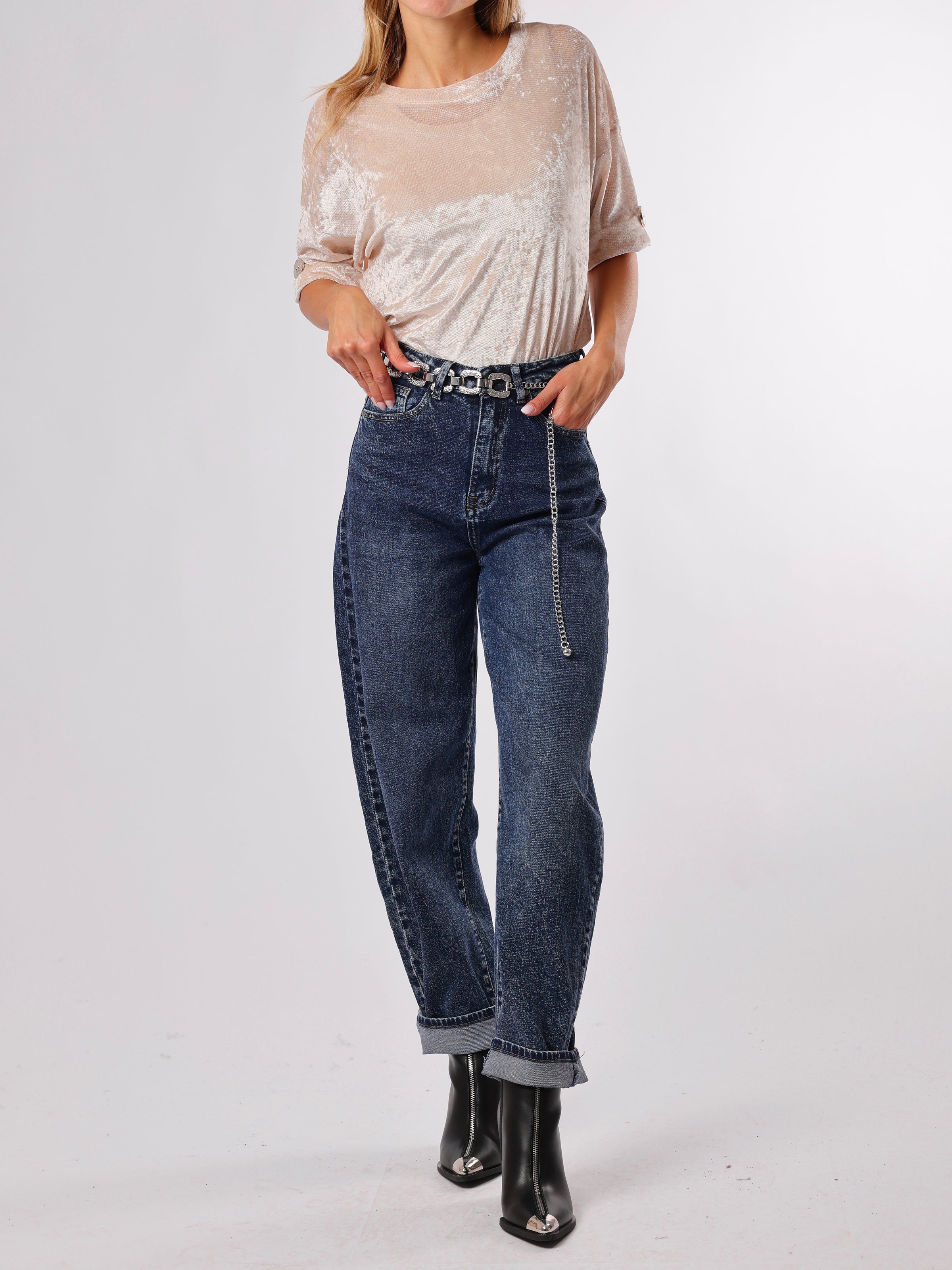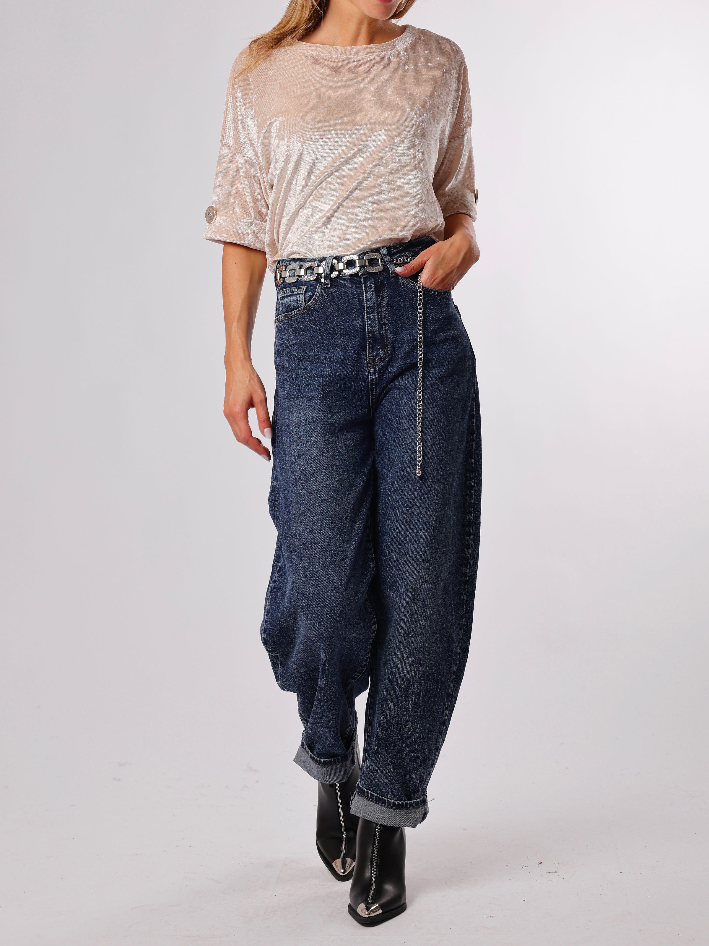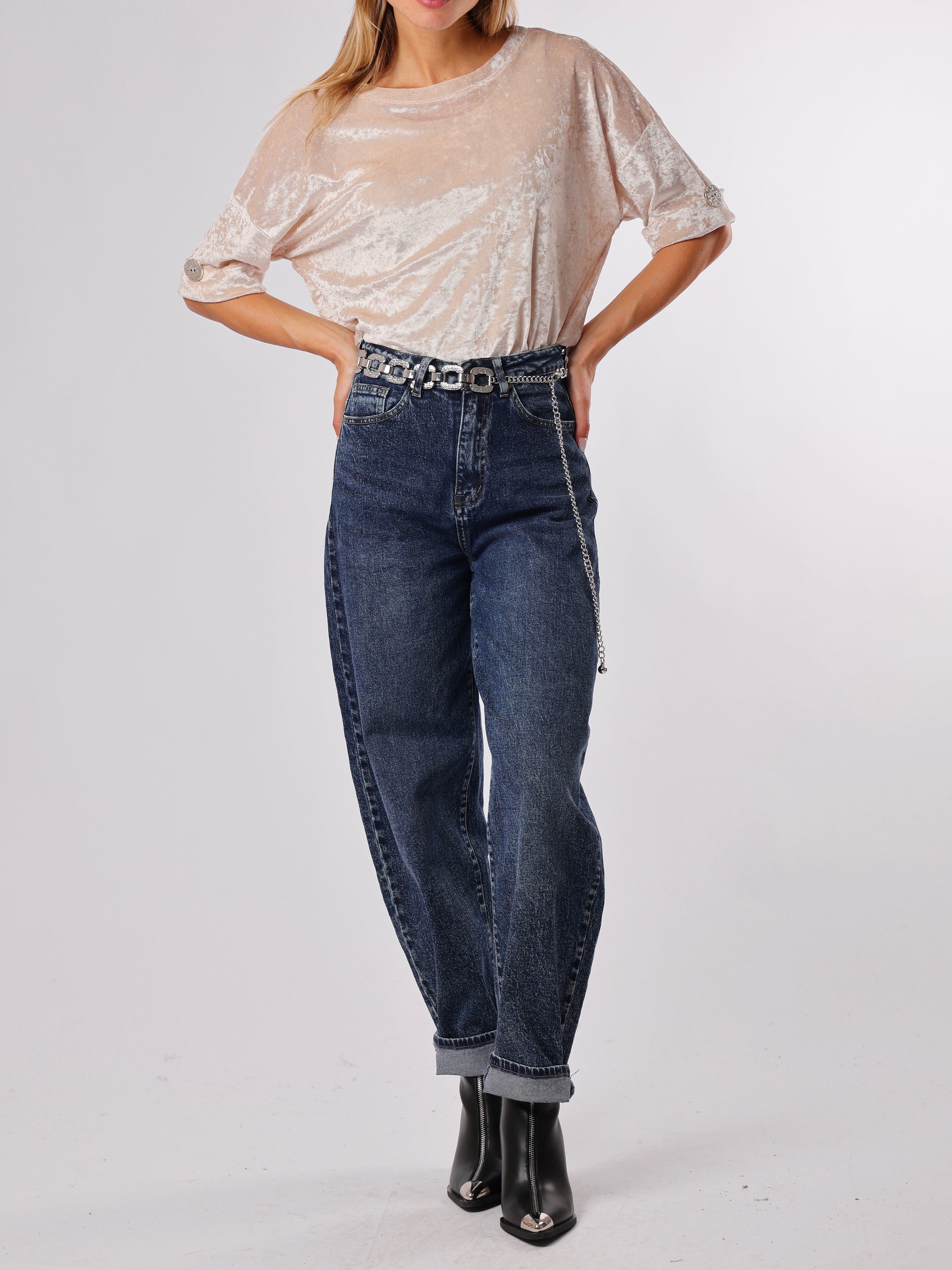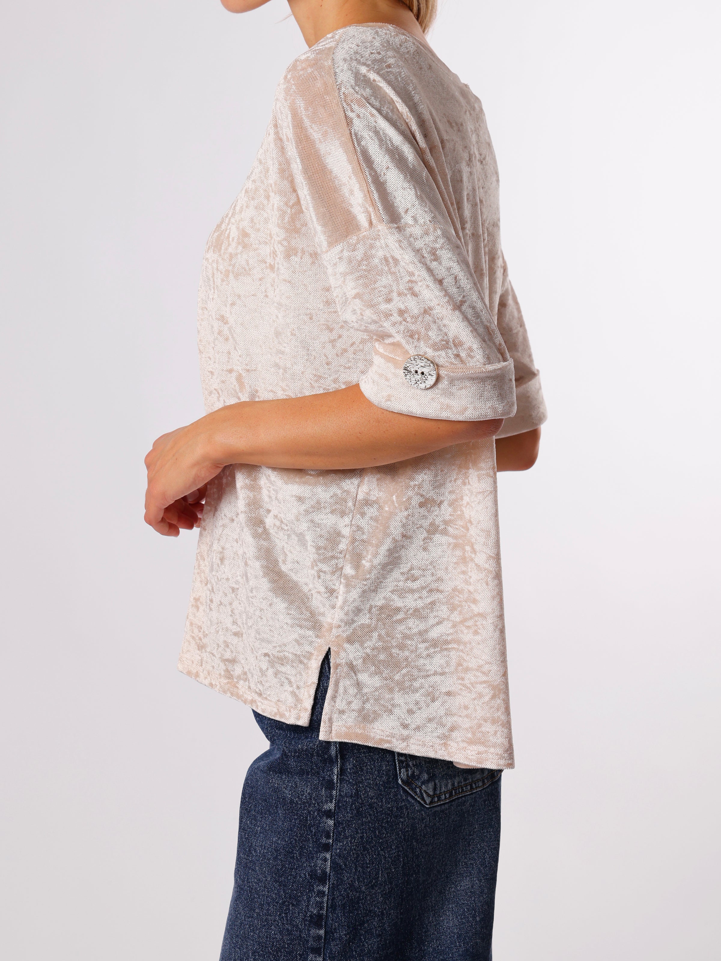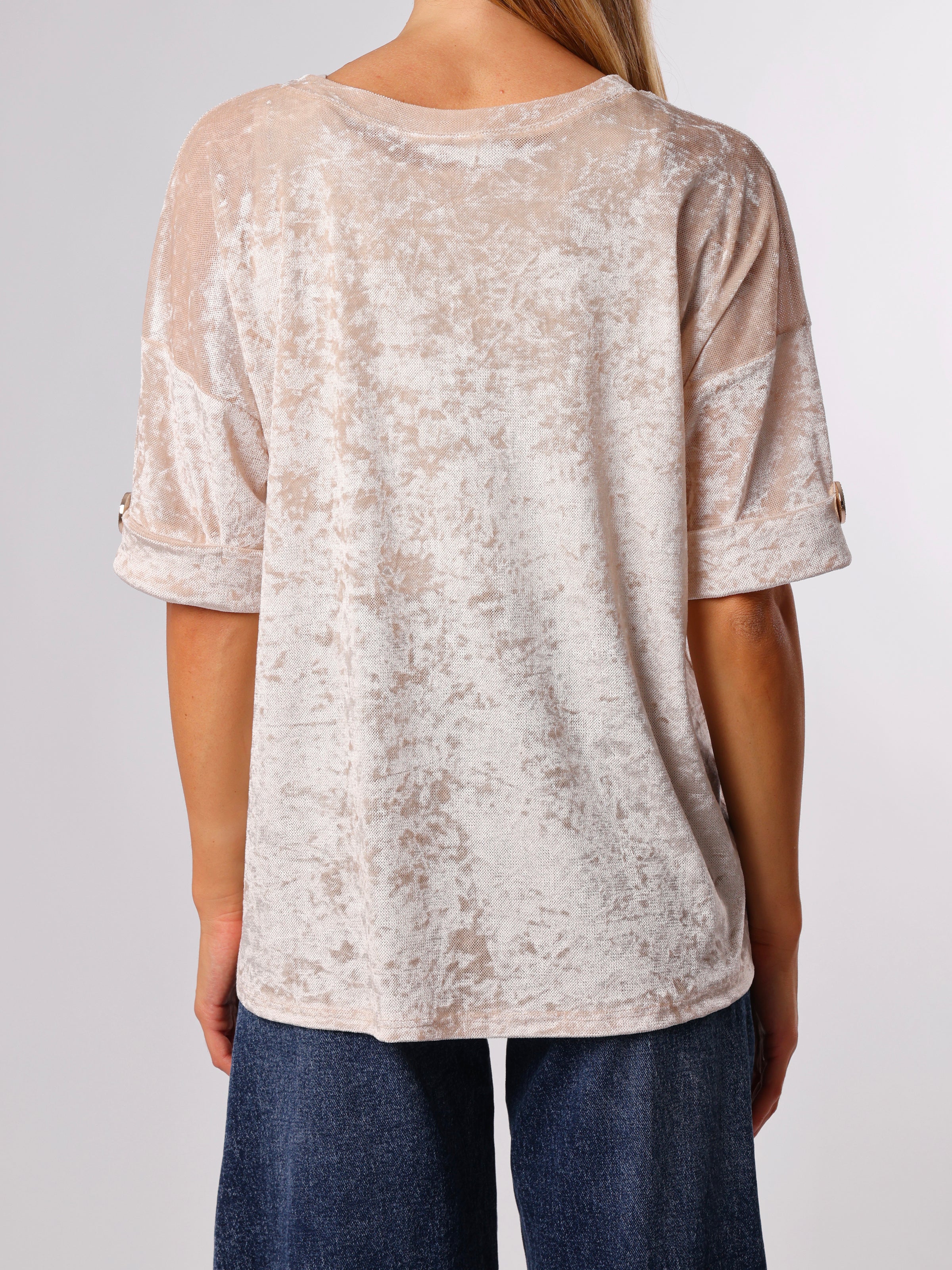 Découvrez notre chandail beige à manches courtes. Ce modèle comporte des boutons décoratifs dorés au niveau des manches. Son tissu possède un effet légèrement marbré et brillant. Il est semi-transparent et idéal pour être porté avec une base en dessous. Il est confortable et allie style et tendance.