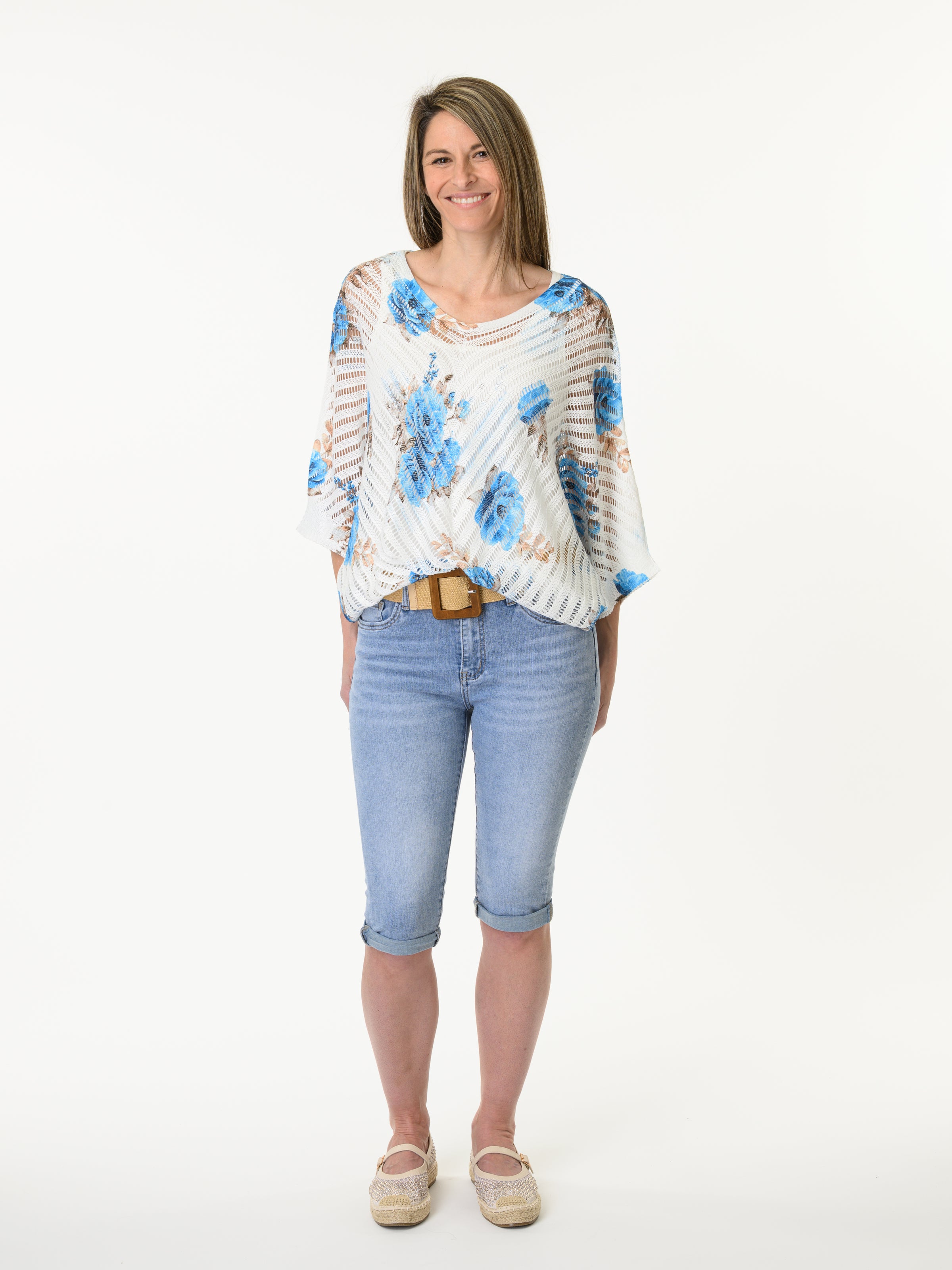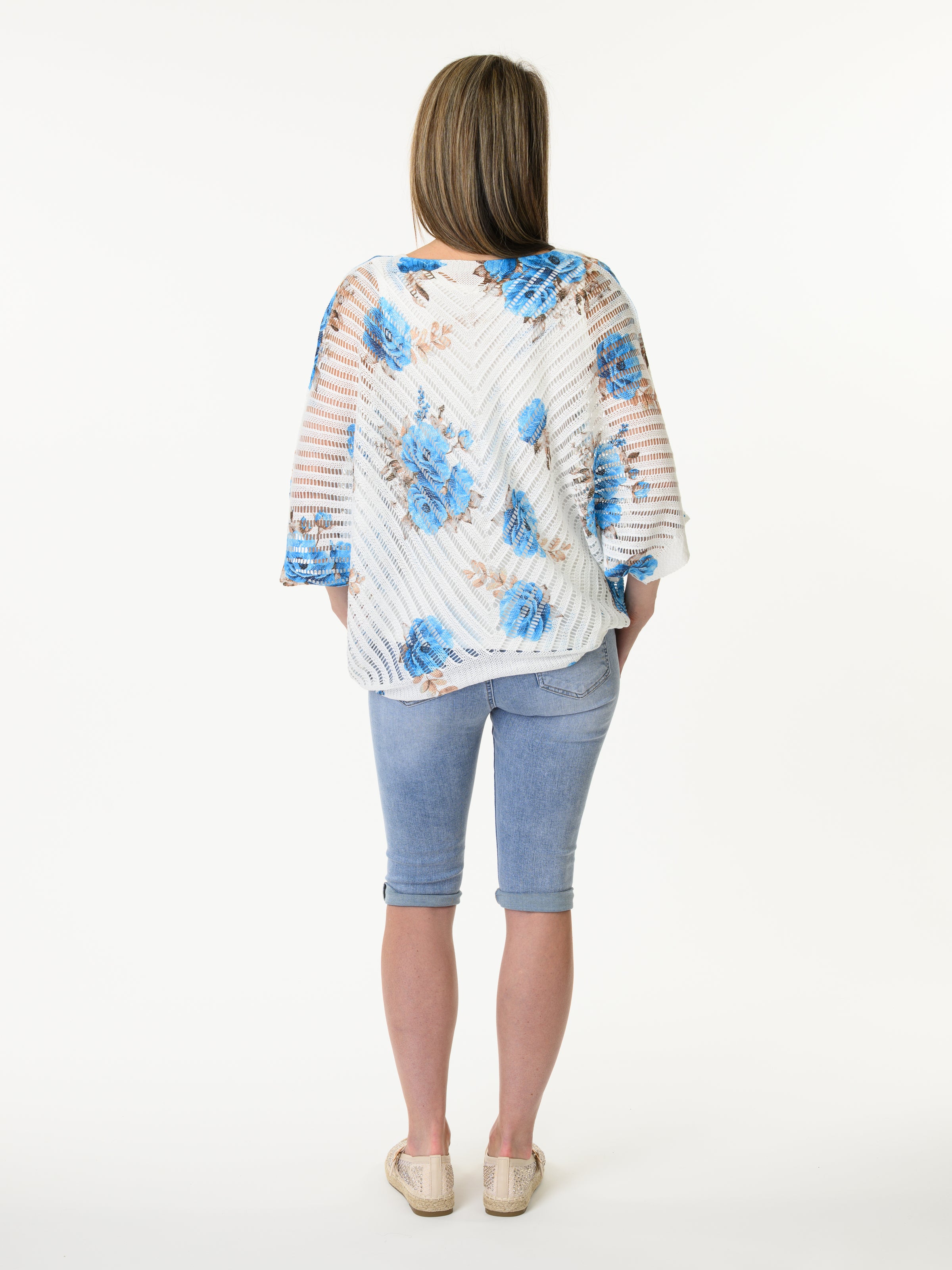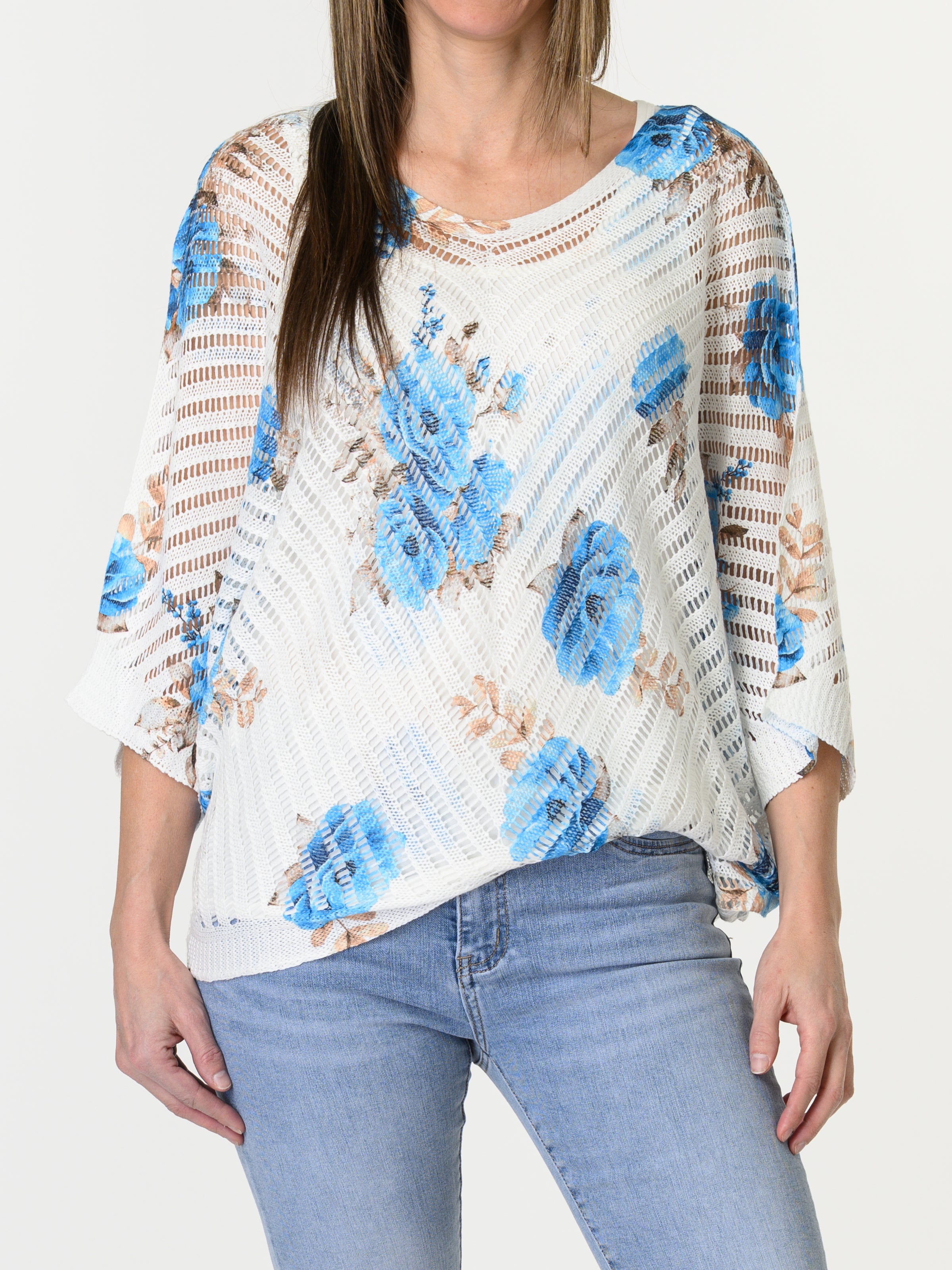 Découvrez notre chandail blanc en mailles avec imprimé floral bleu. Ce modèle de couleur unie est orné d'un imprimé de roses bleues et il est idéal pour être porté en superposition. Cette pièce ajoute une touche classique et allie style et tendance.