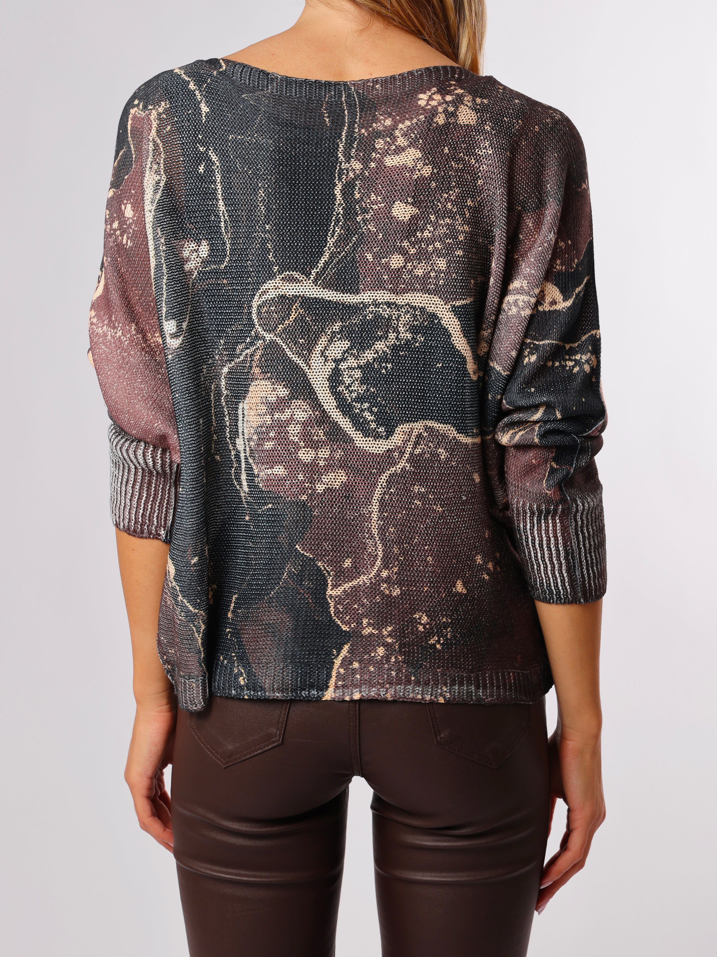 Découvrez notre chandail en mailles avec imprimé abstrait noir et brun. Ce modèle à manches longues est orné d'un imprimé abstrait, avec un effet marbré, dans des tons de noir, brun et beige. Il comporte aussi quelques touches plus foncées qui rappellent un style artistique ou naturel. Ce modèle allie style décontracté et tendance.