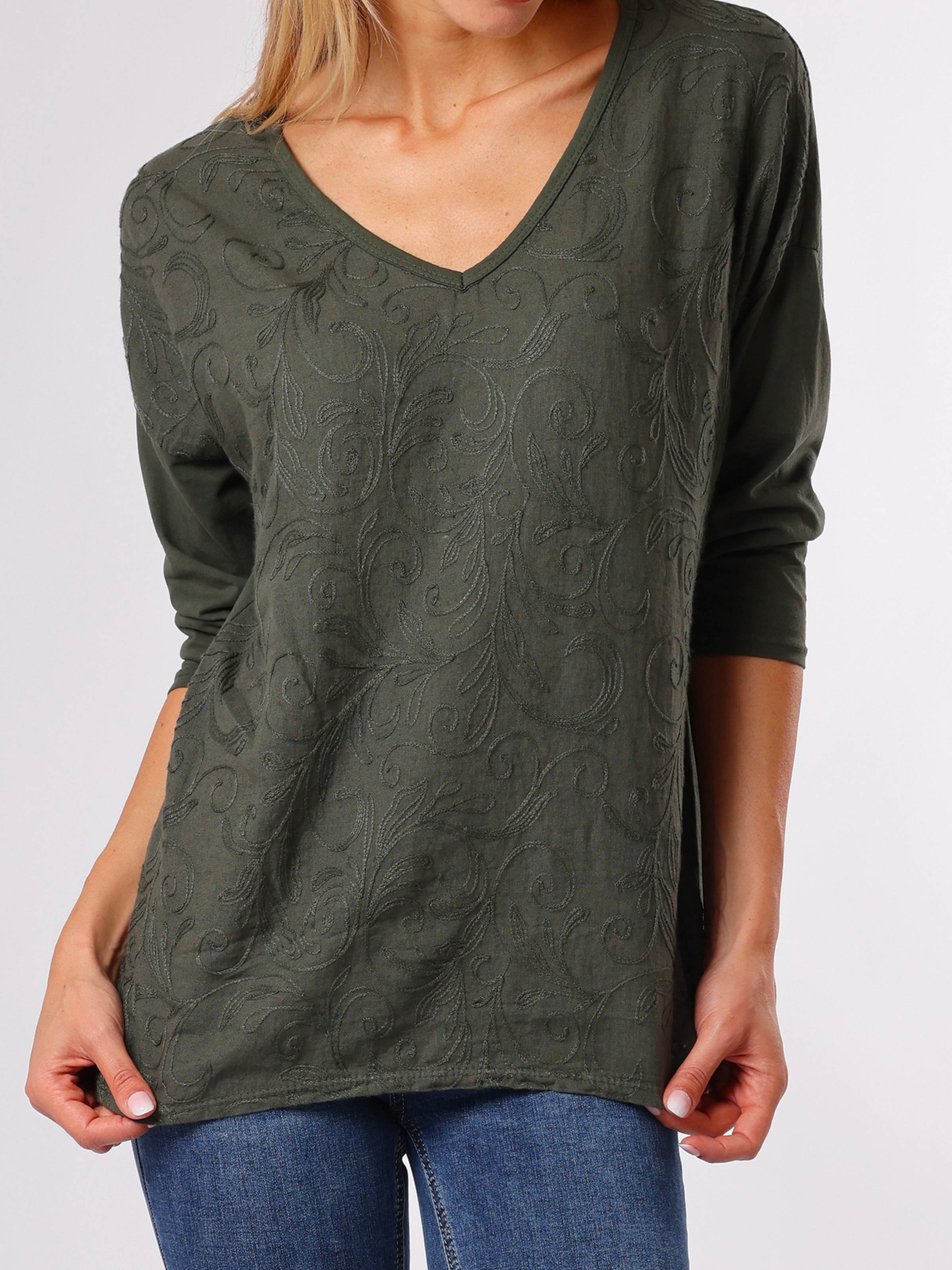 NEW - Chandail kaki foncé avec motifs de feuilles brodées