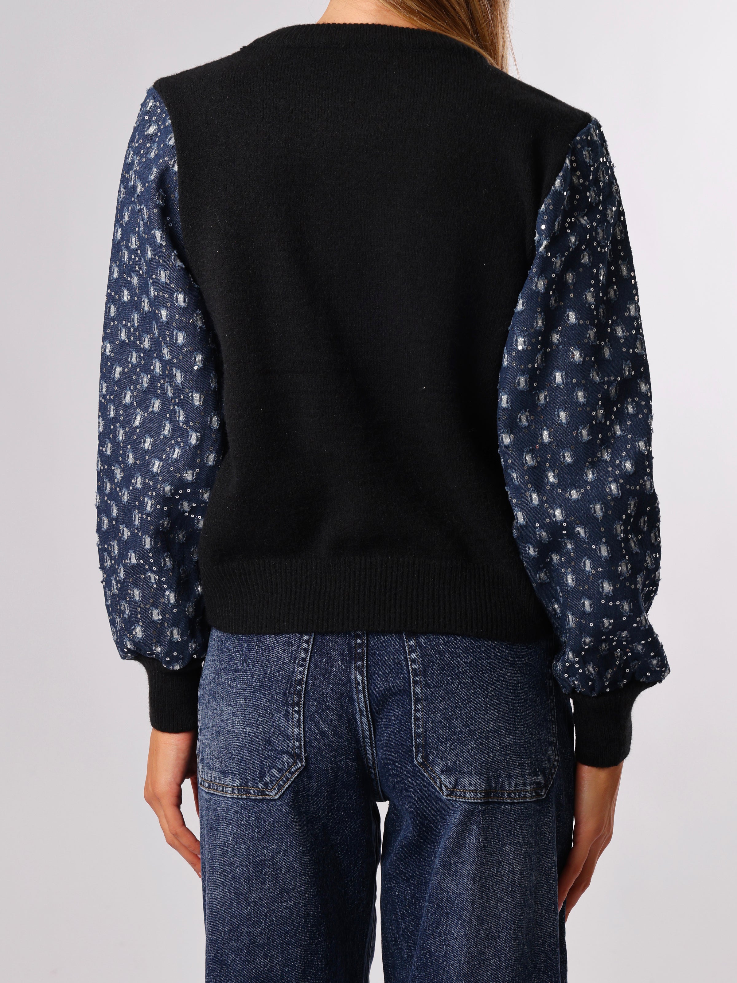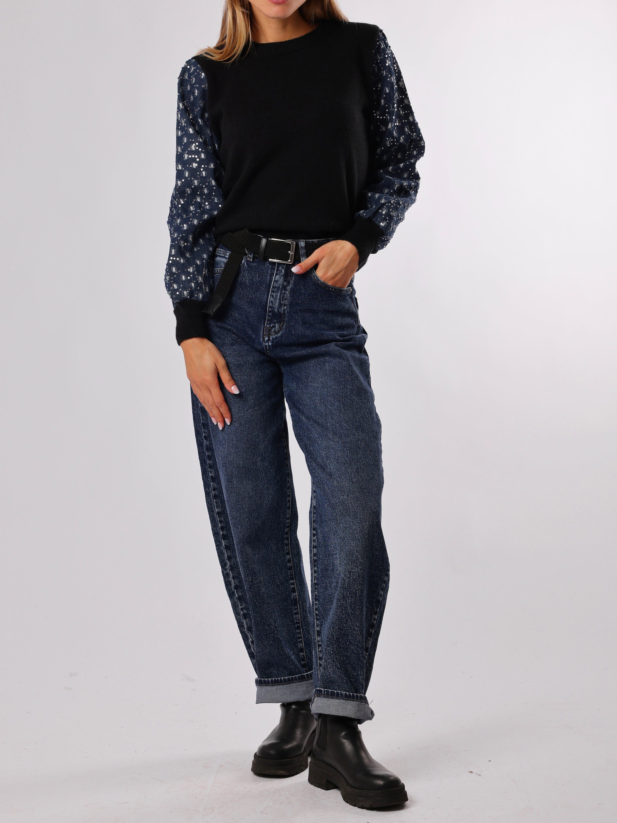 Découvrez notre chandail noir uni à manche ample. Ce modèle comporte des manches de jeans ornées avec des brillants et des paillettes, ainsi que des déchirures de jeans qui viennent apporter une touche décontractée. Cette pièce allie style et tendance.