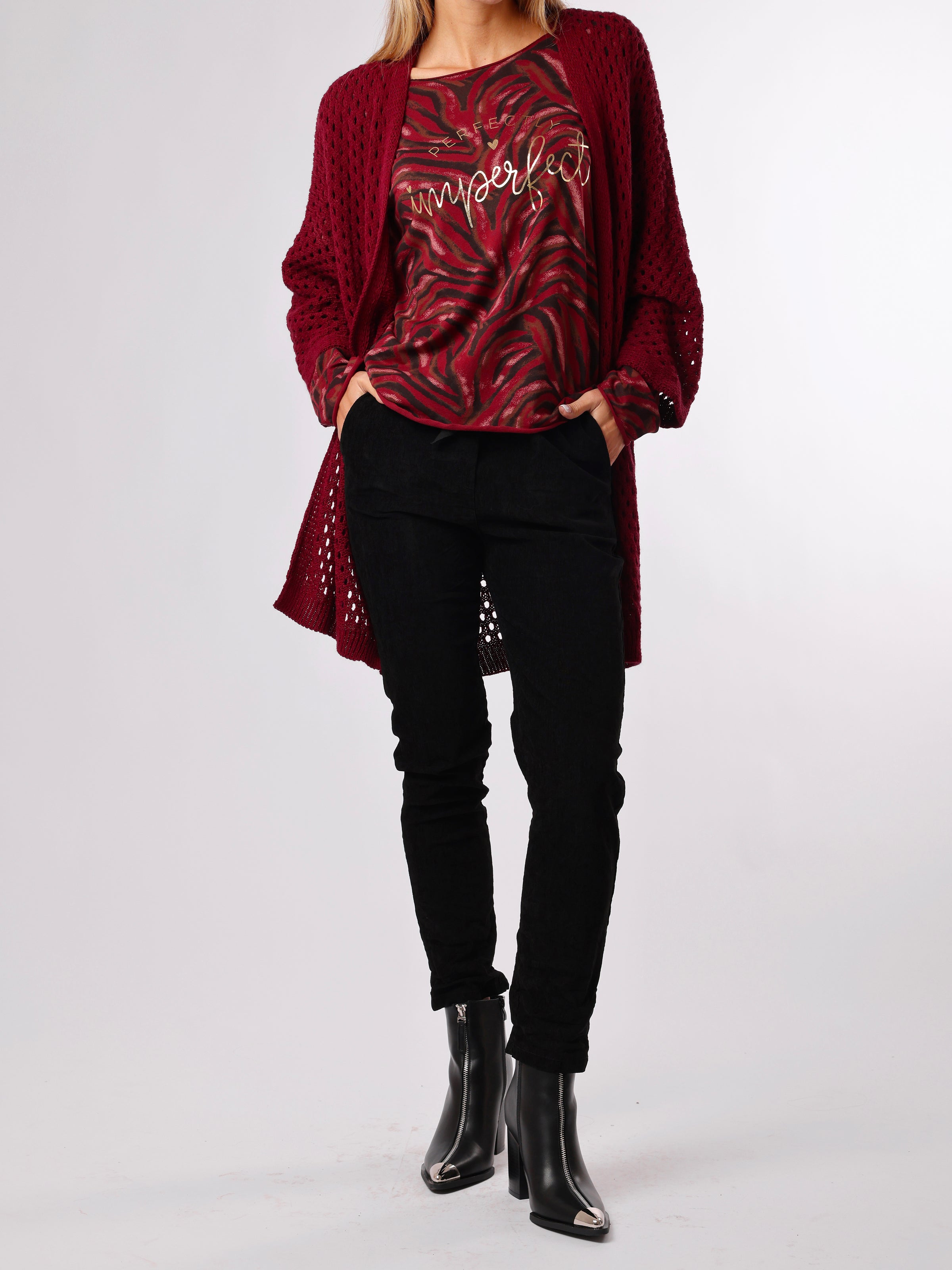 Découvrez notre cardigan bourgogne en mailles. Ce modèle à manches longues est idéal pour apporter de la superposition aux looks. Avec sa couleur unie et sa longueur, cette pièce ajoute une touche sophistiquée aux vêtements. Ce modèle allie style et confort.