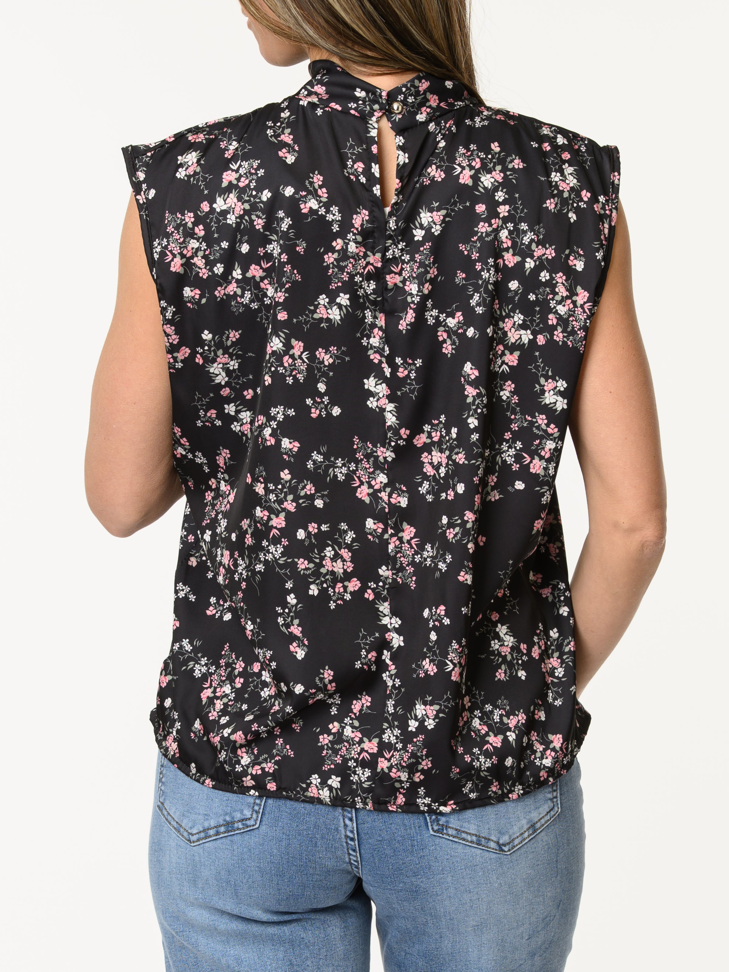 Découvrez notre blouse noire à col montant avec imprimé de fleurs. Ce modèle sans manches est orné d'un imprimé floral rose et blanc. Avec sa texture satinée, cette pièce allie style et tendance.