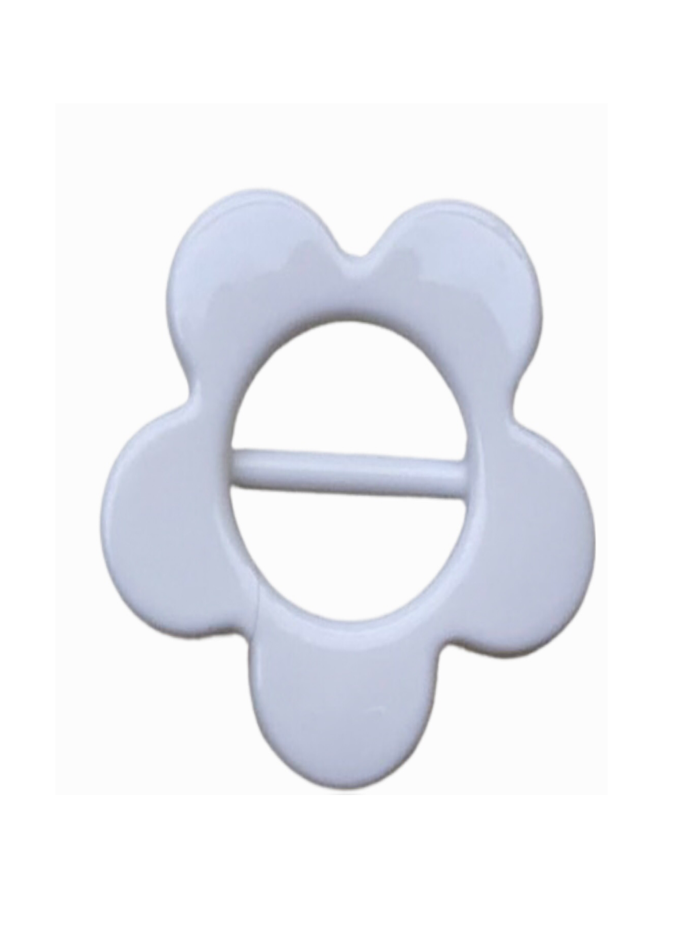 Découvrez notre boucle d'ajustement blanche en plastique. Elle mesure 1 1/2 pouce de diamètre. Cette boucle en forme de fleur apporte un style décontracté et une note d'originalité.