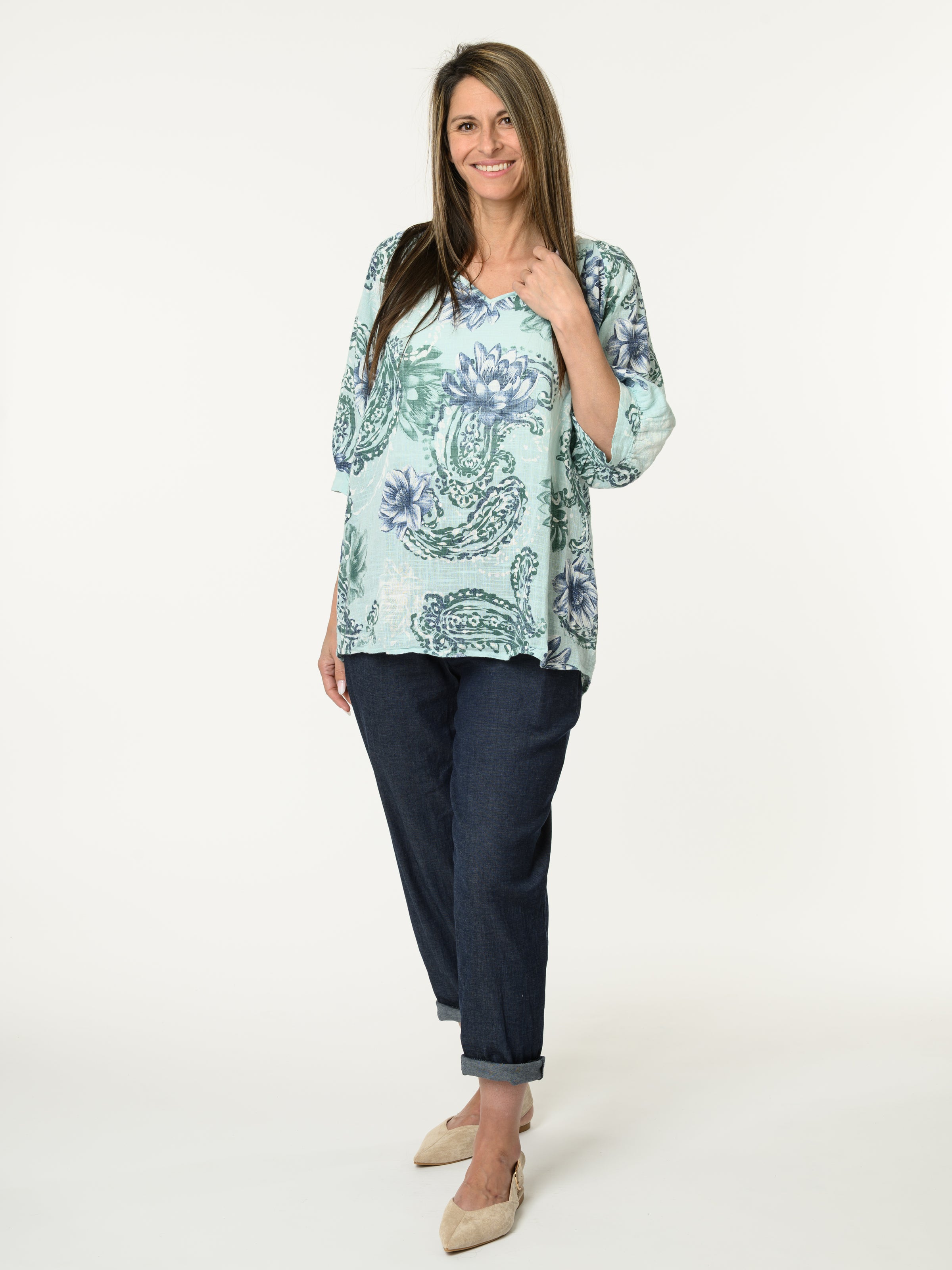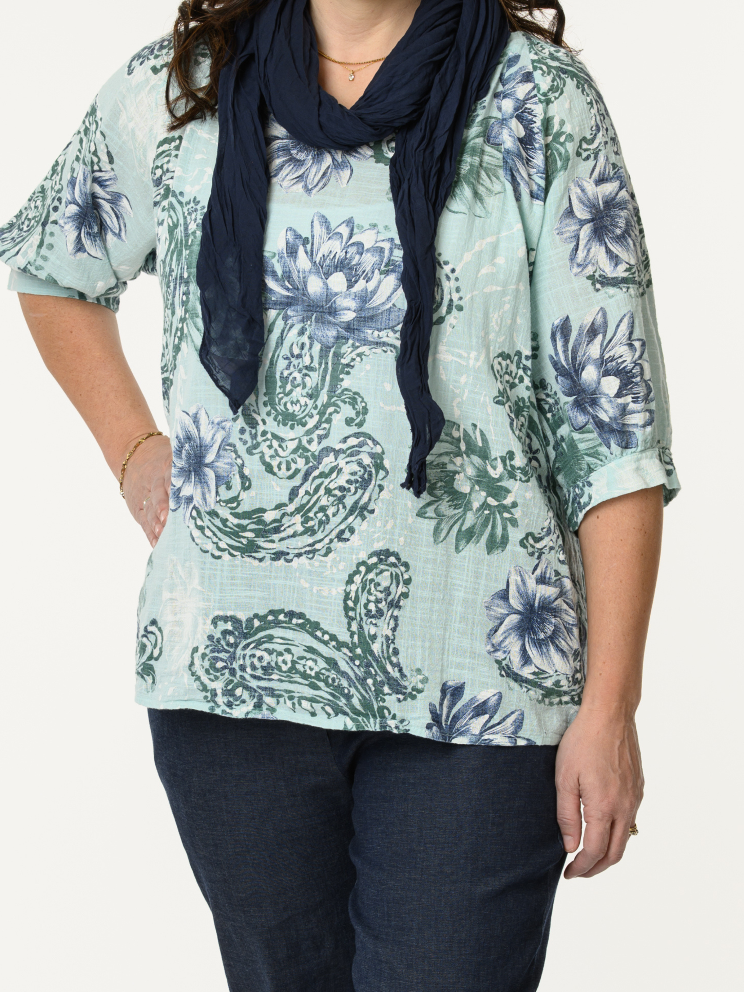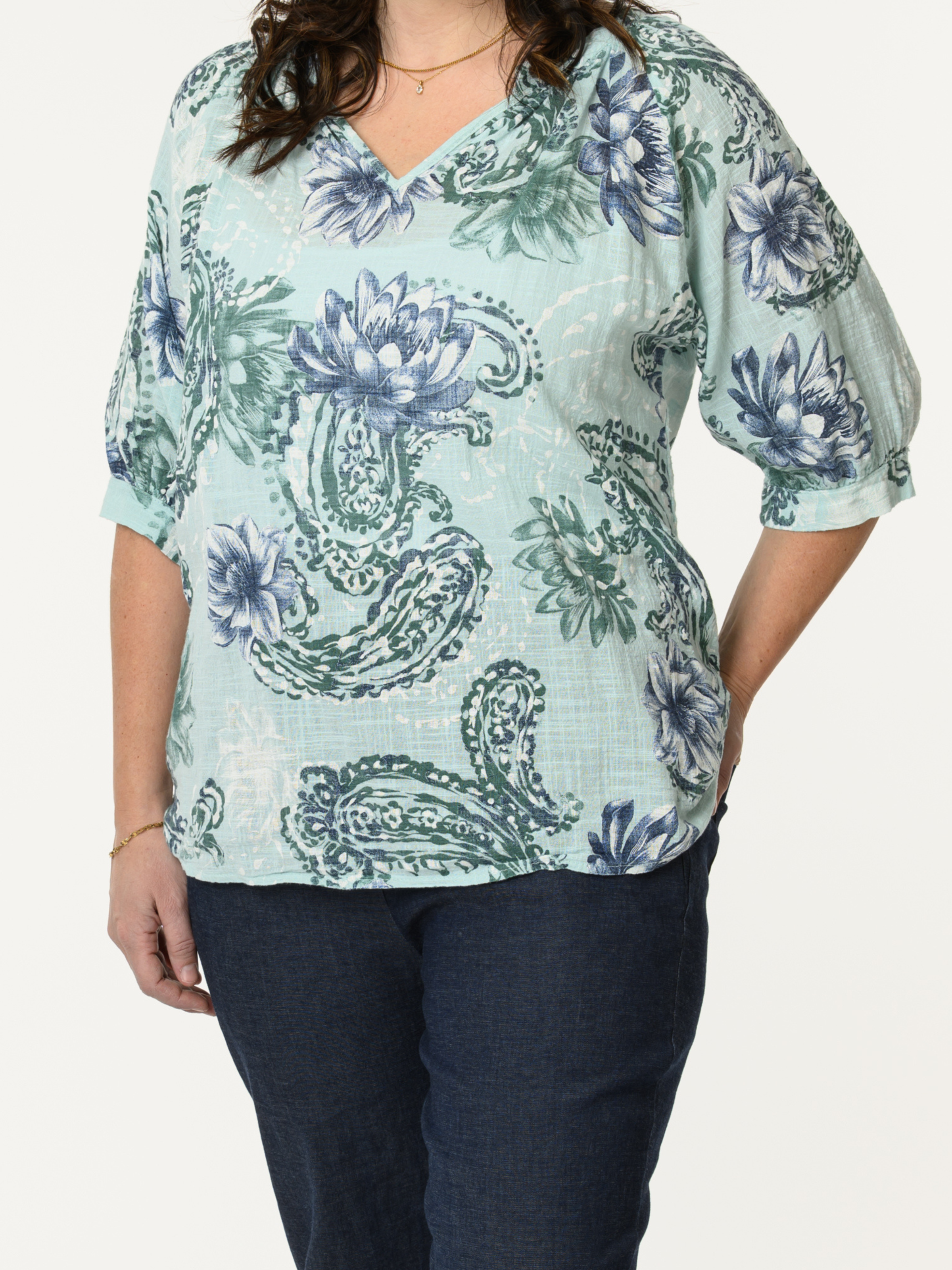 Découvrez notre chandail aqua avec imprimé de fleurs et paisleys. Ce modèle à manches courtes est orné de motifs de fleurs et de paisleys marines et verts. Cette pièce en coton est légère et offre un style décontracté et confortable.