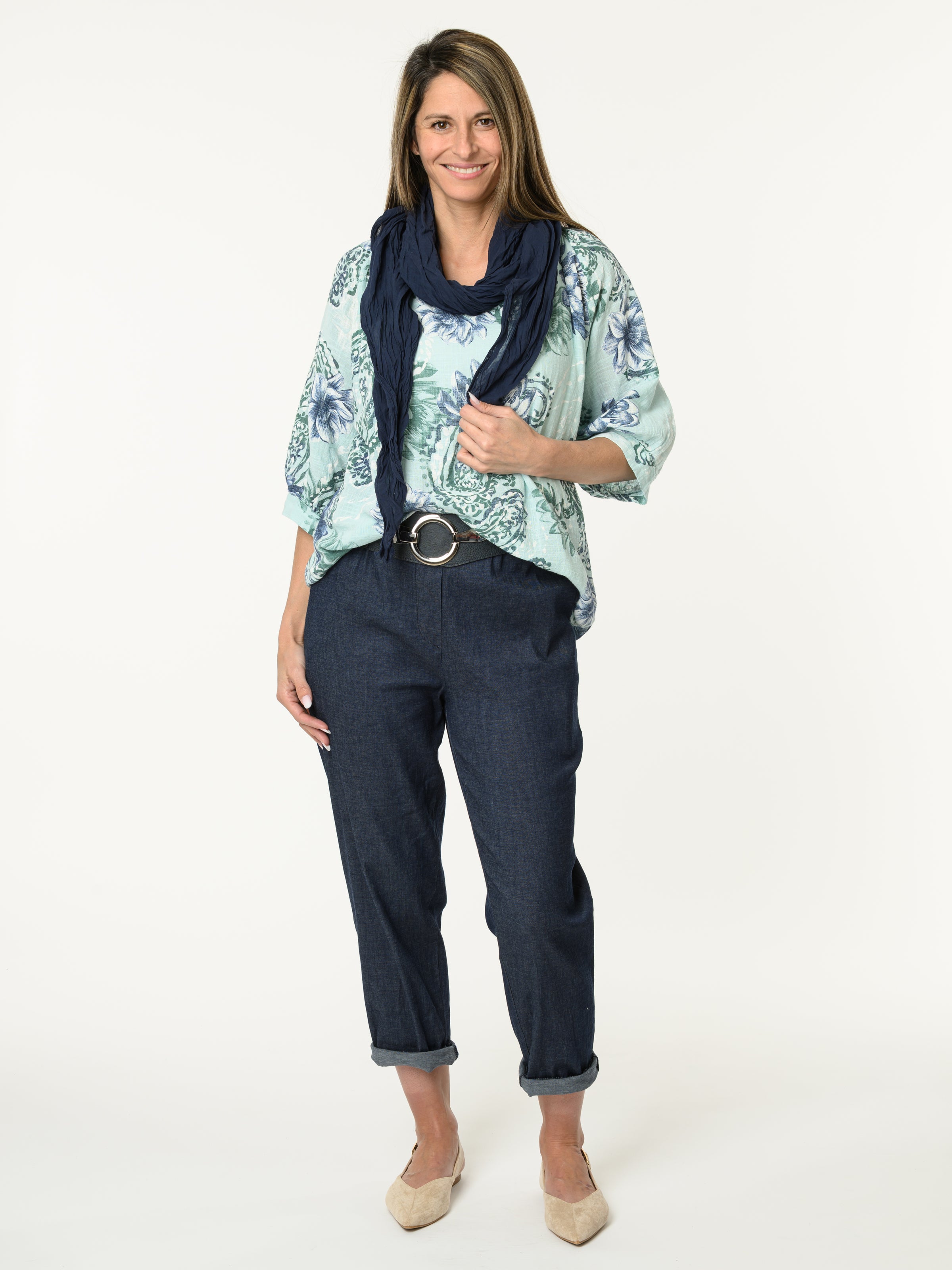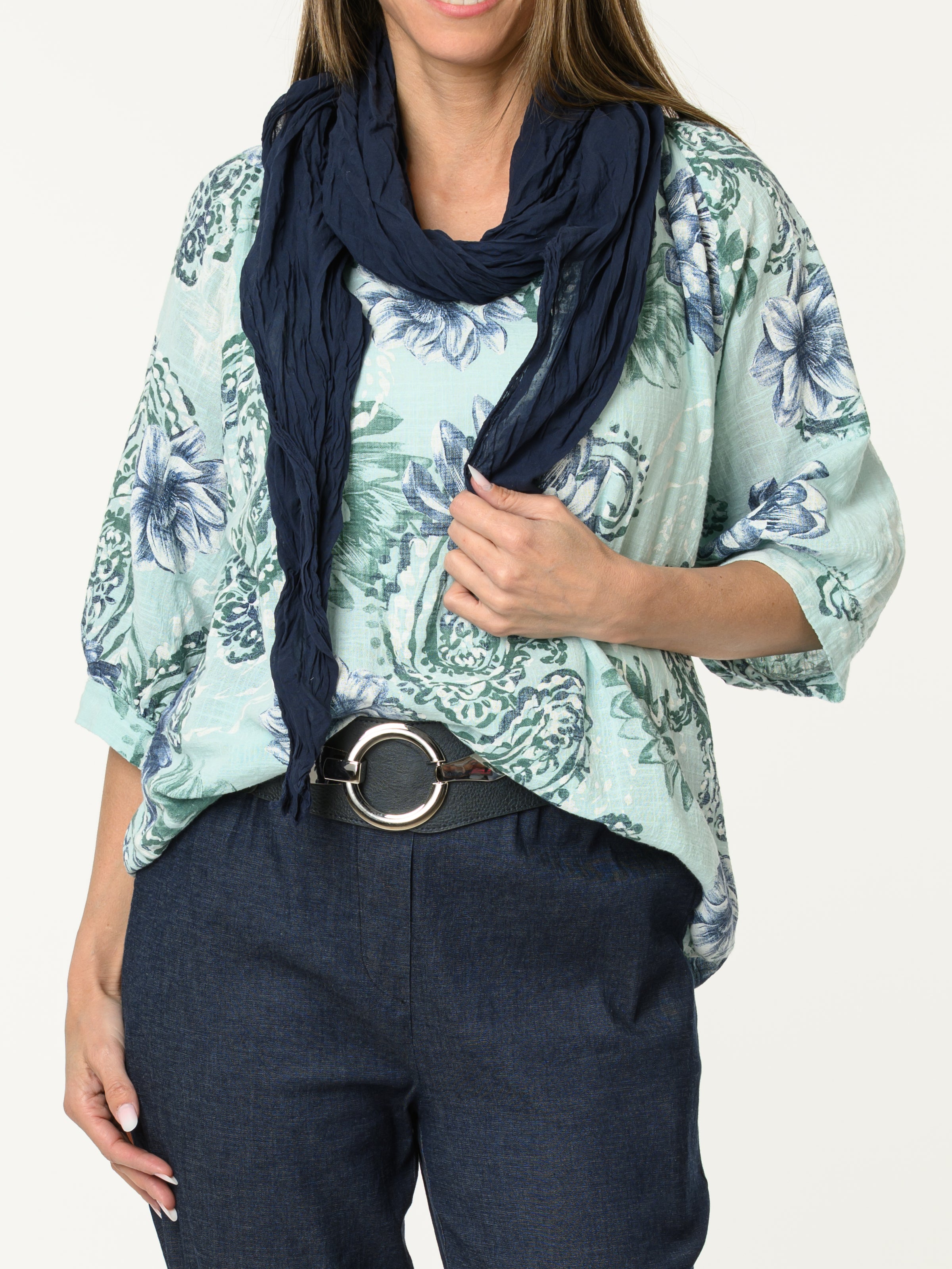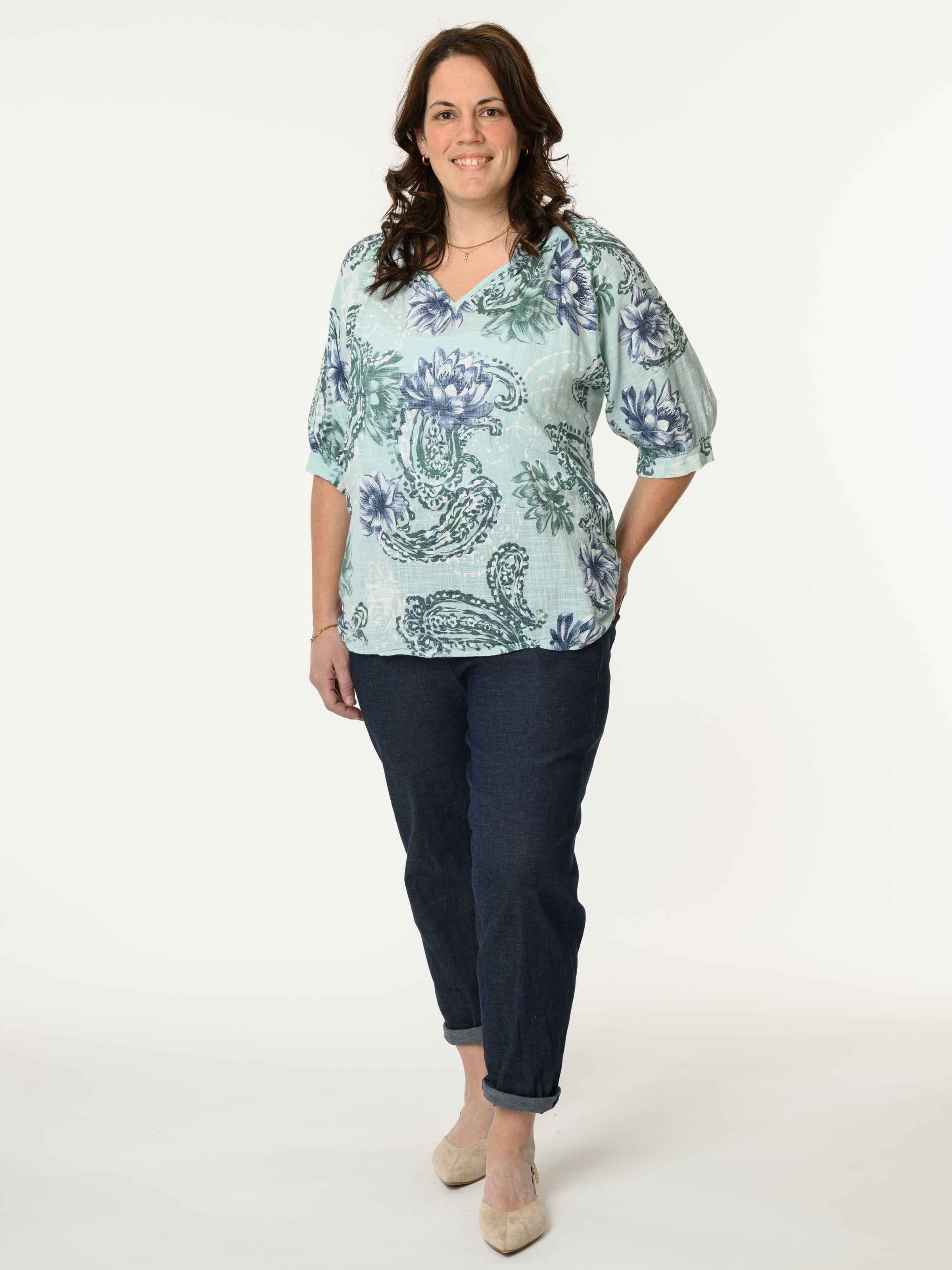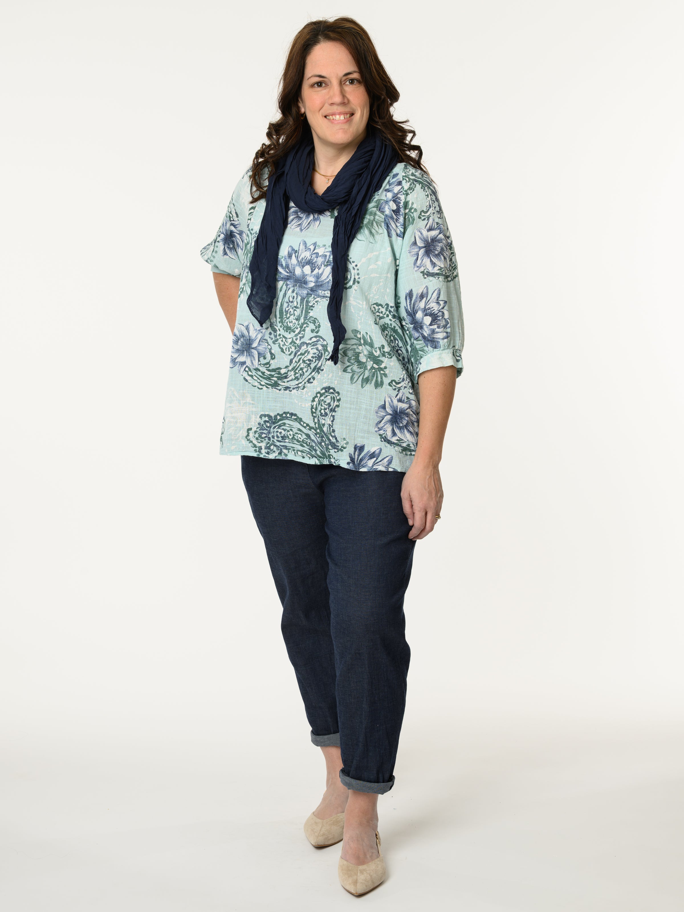 Découvrez notre chandail aqua avec imprimé de fleurs et paisleys. Ce modèle à manches courtes est orné de motifs de fleurs et de paisleys marines et verts. Cette pièce en coton est légère et offre un style décontracté et confortable.