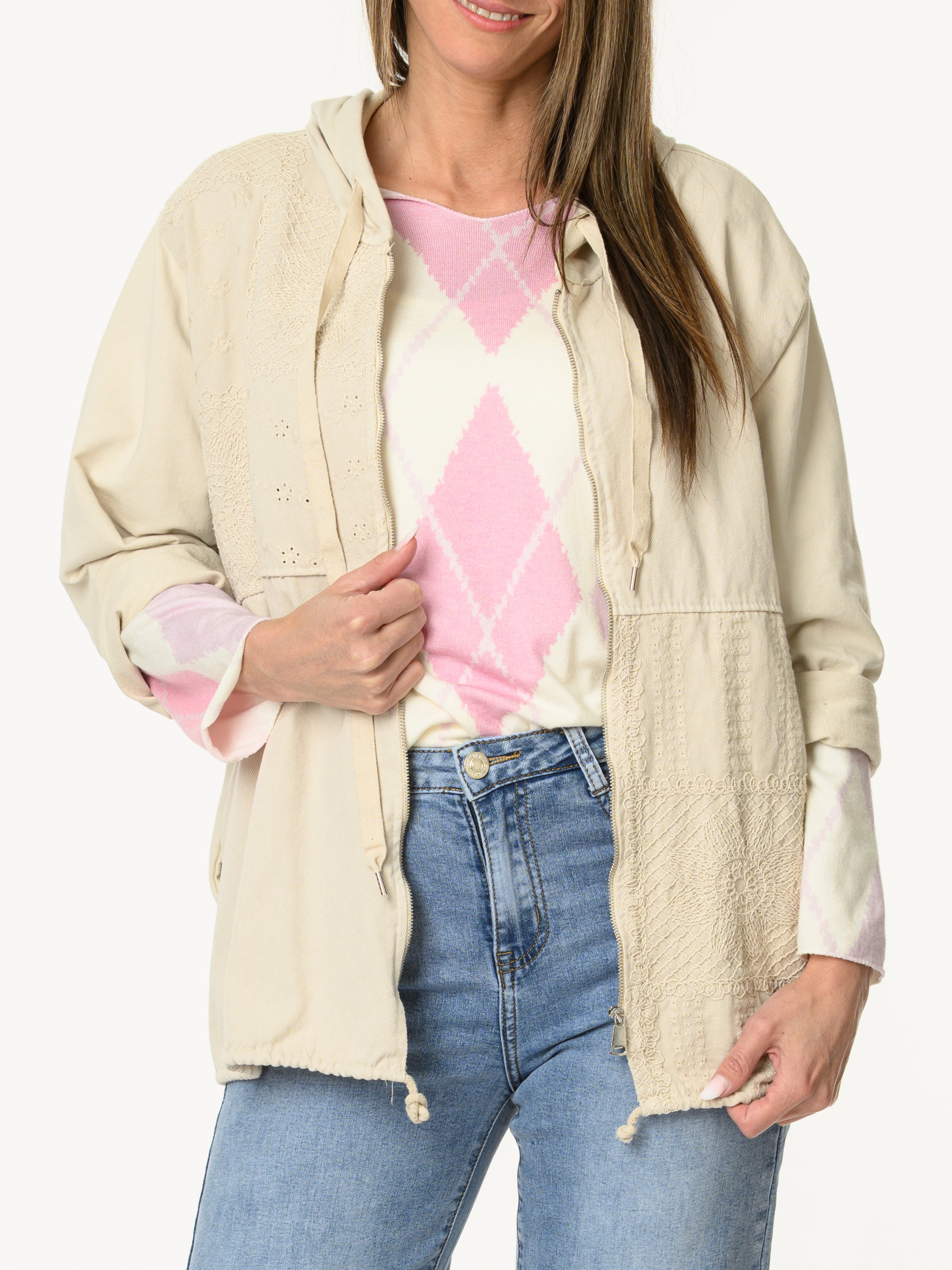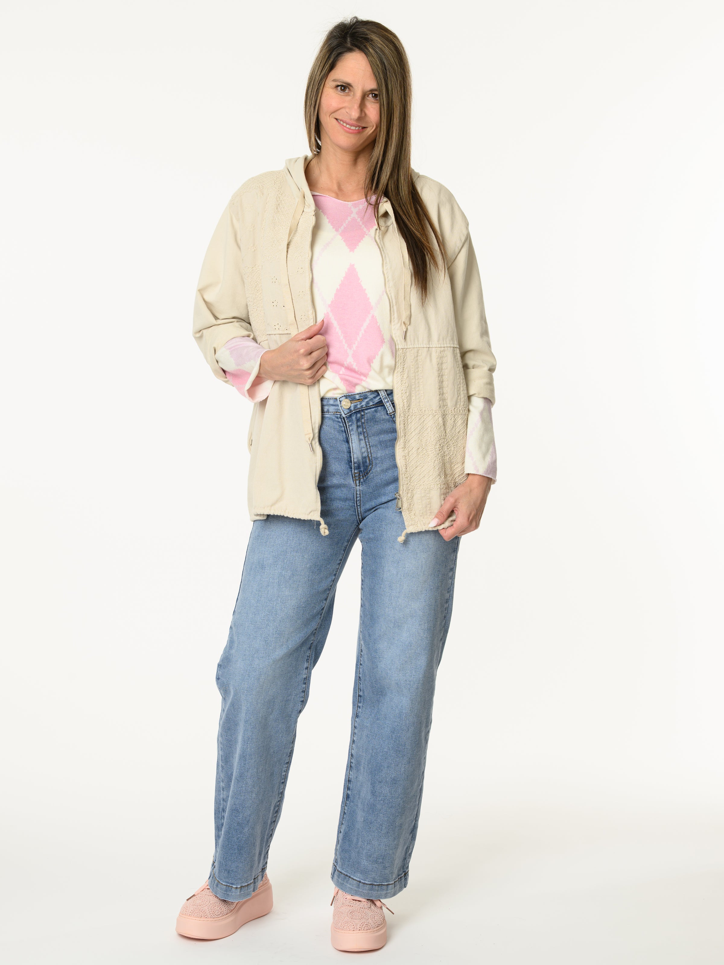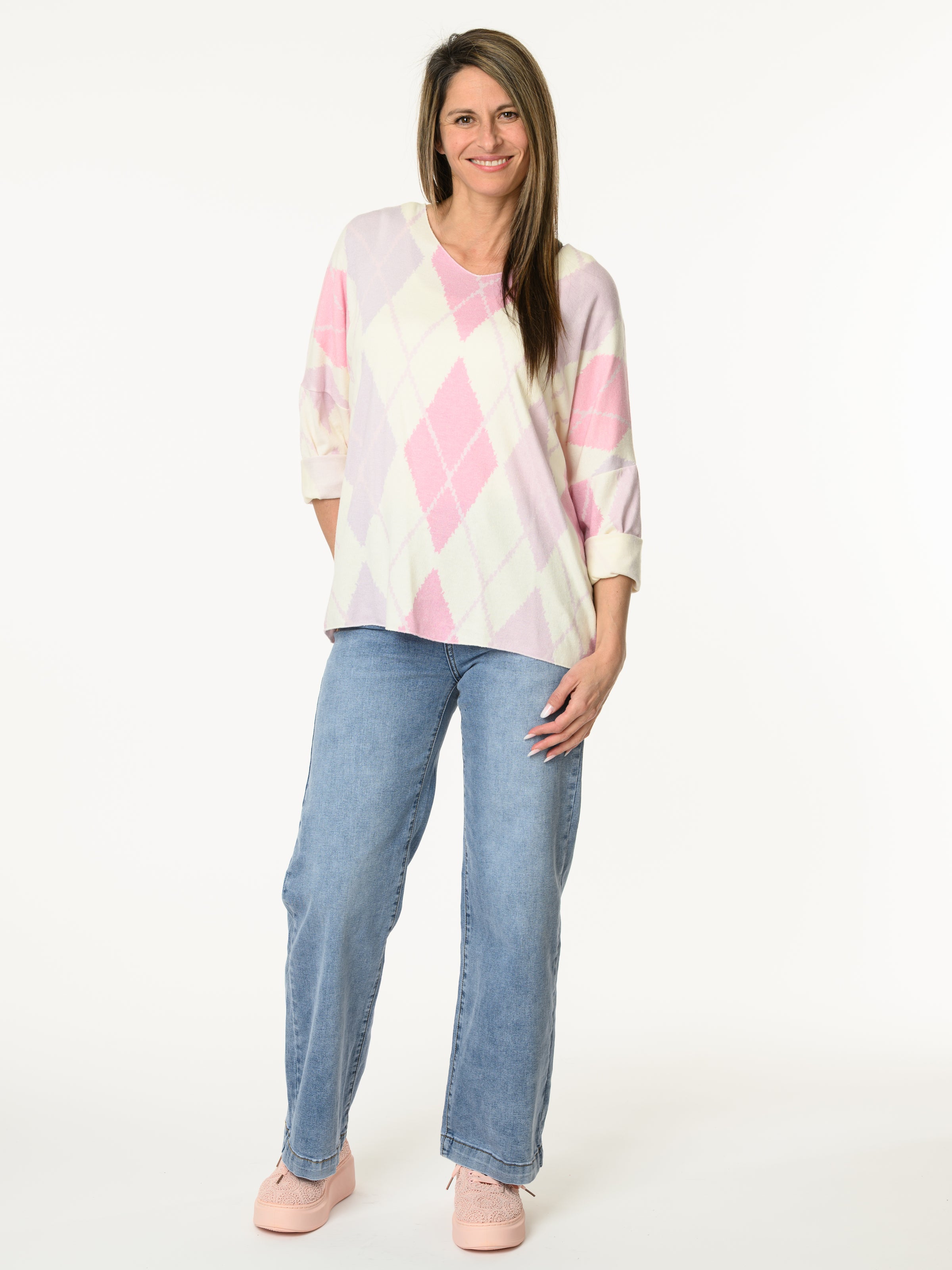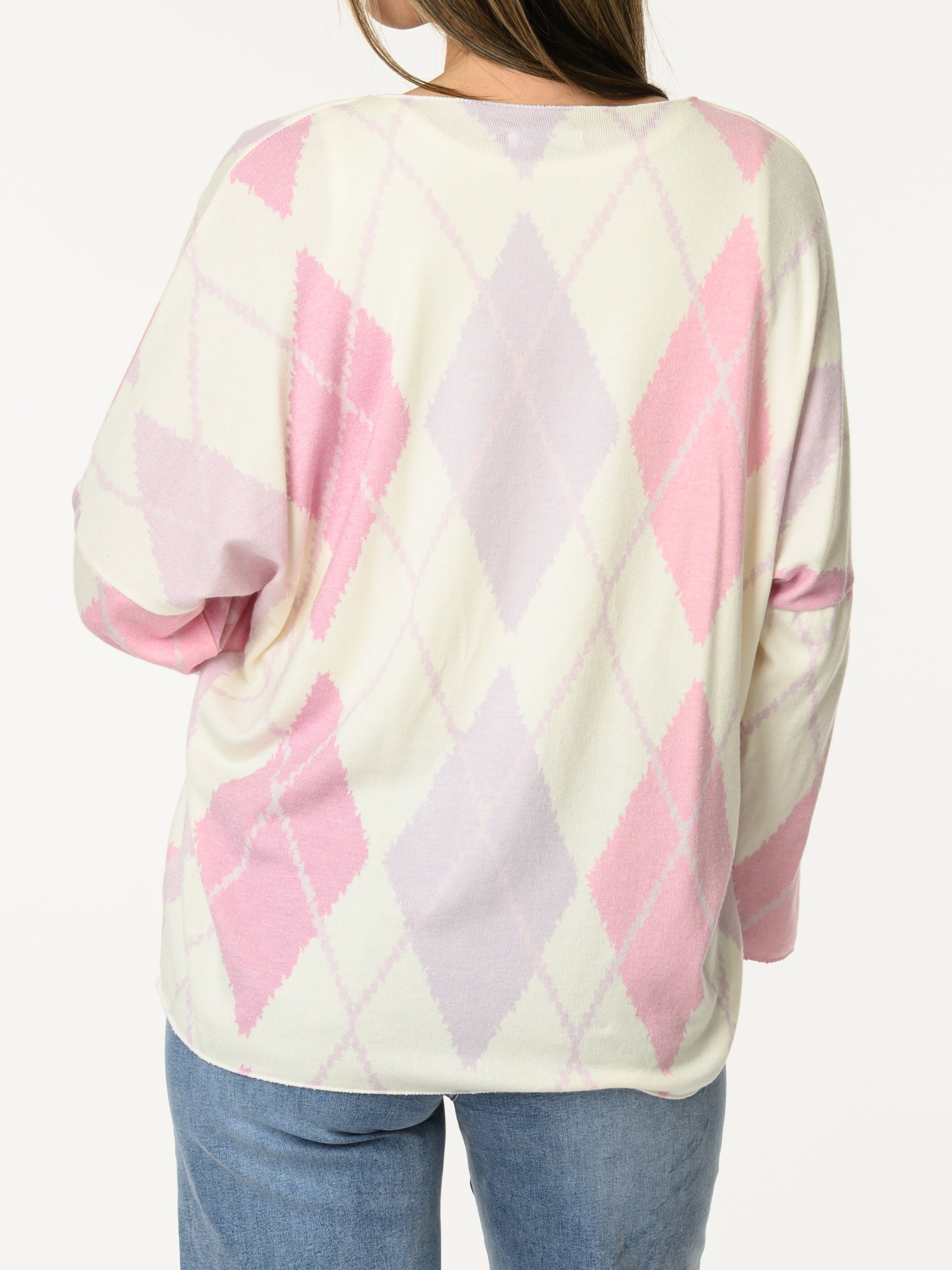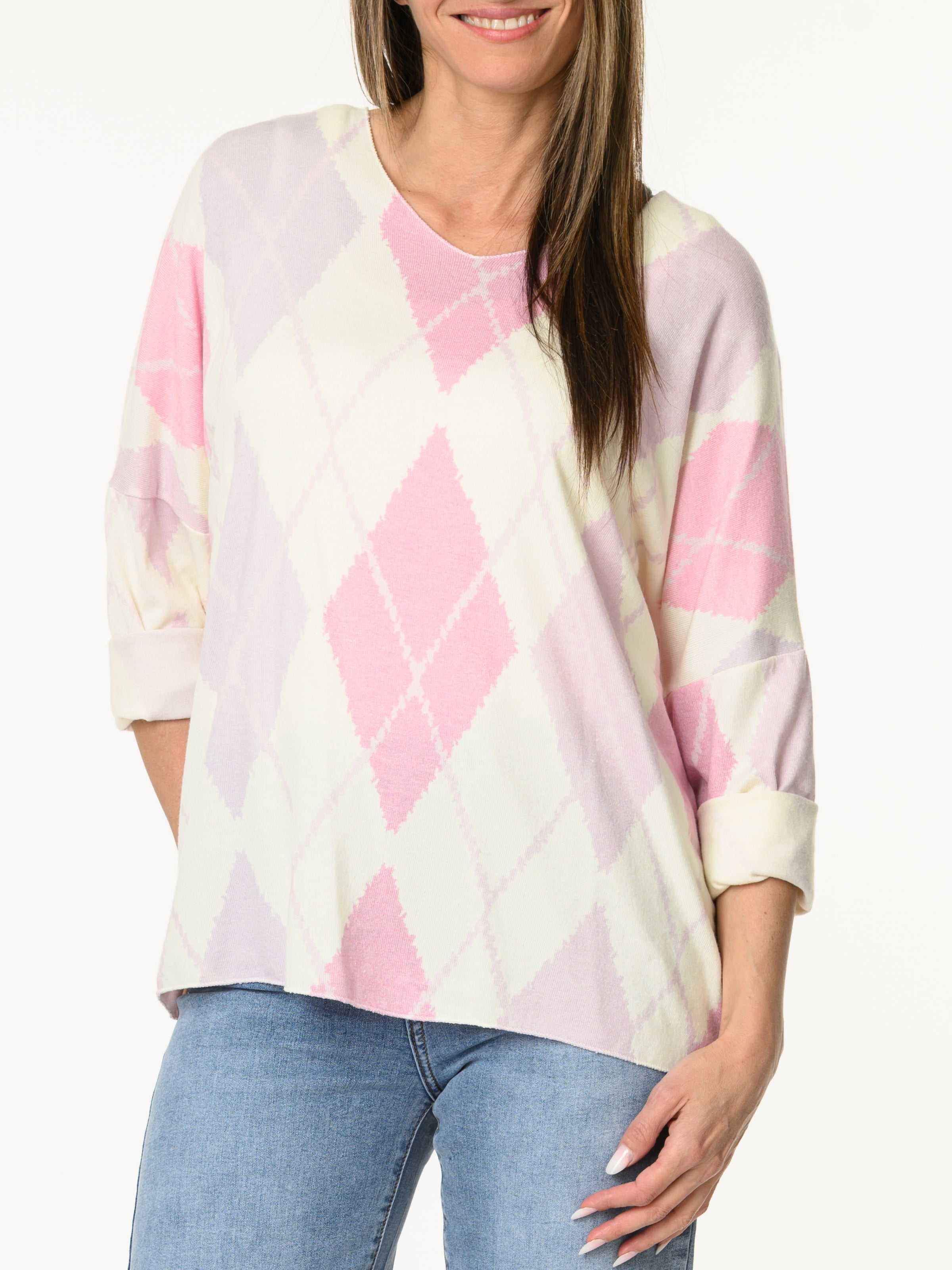 Découvrez notre chandail blanc crème à motifs de losanges lilas et rose. Ce chandail à manches longues est orné de motifs de losanges dans des tons de lilas et rose. Il s'agence bien avec les looks et il apporte un style classique et décontracté.