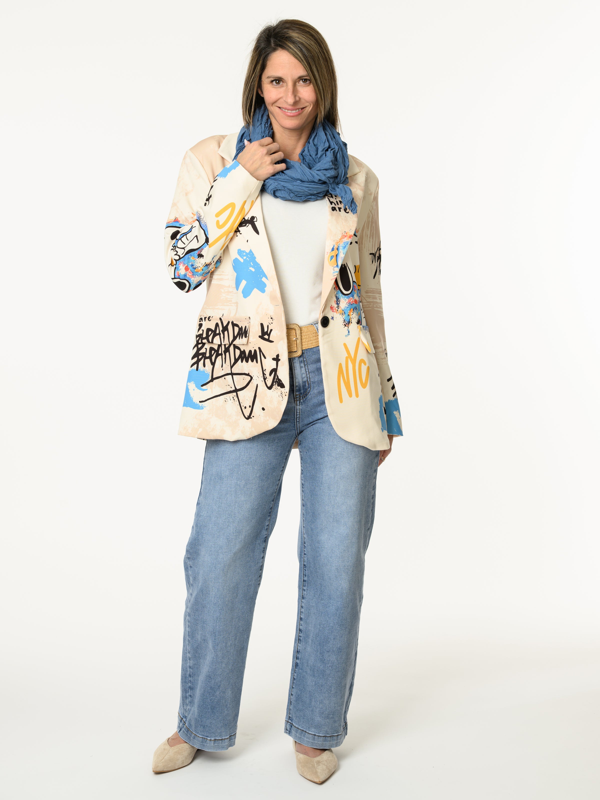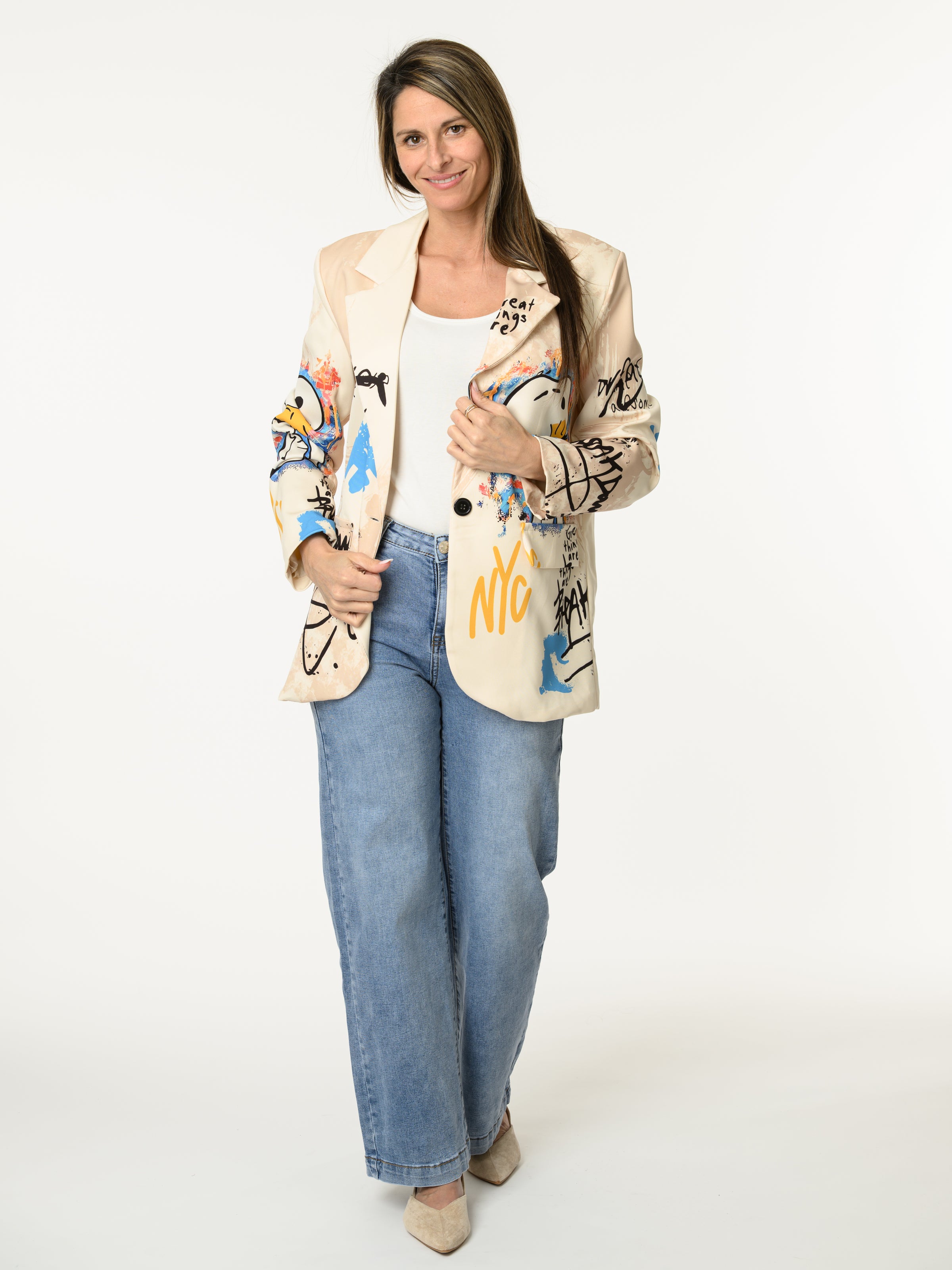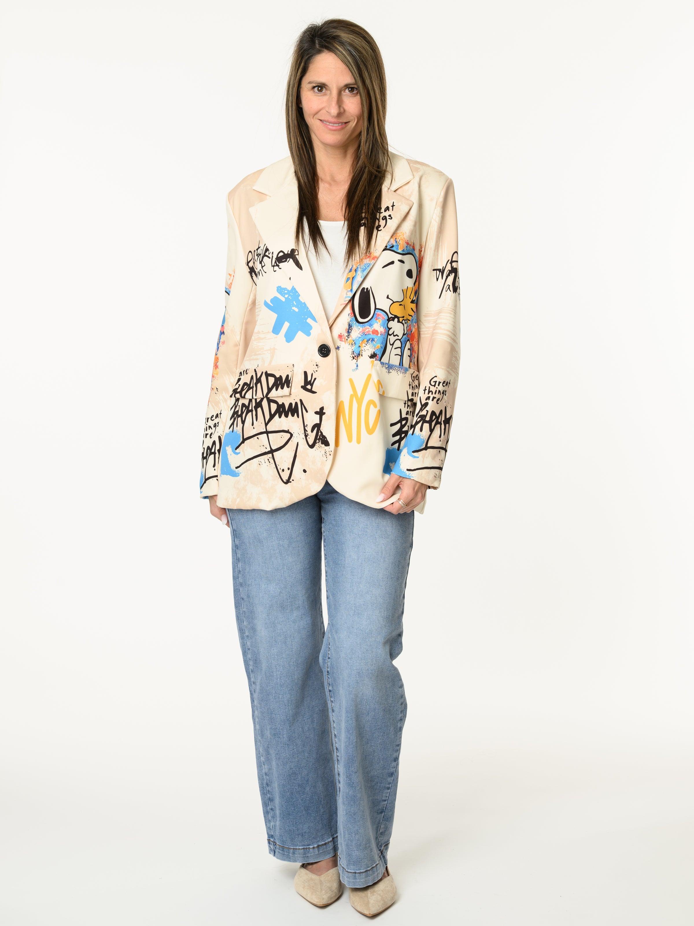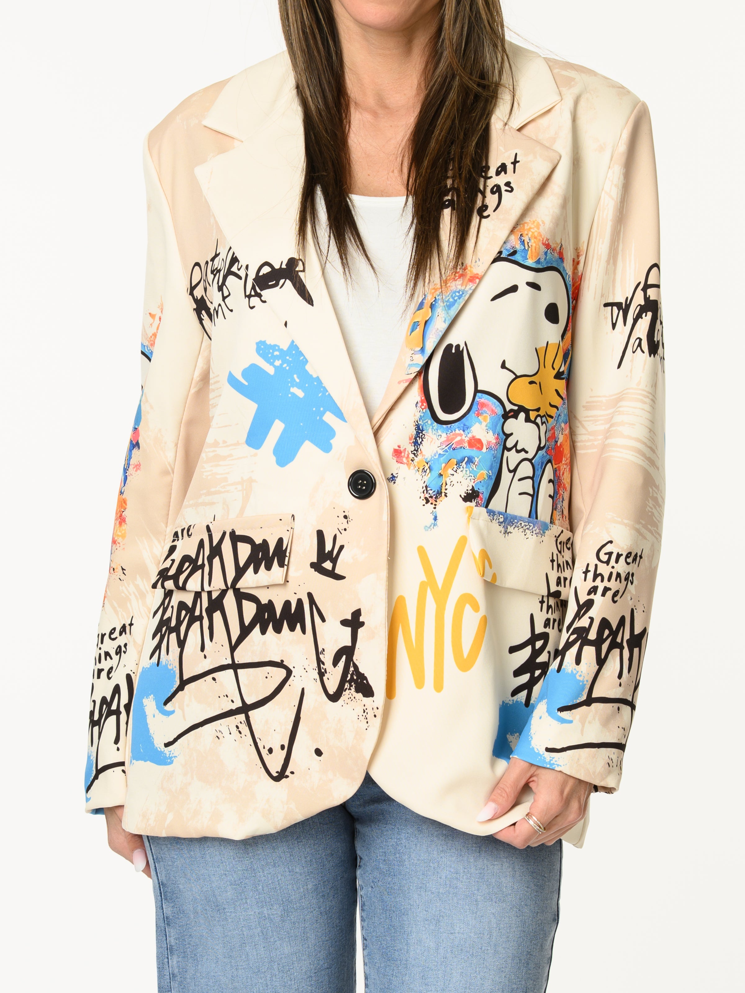 Découvrez notre veston beige artiste avec imprimé de Snoopy. Ce modèle à manches longues avec col à revers est léger. Il comporte des tons beiges, bleus et jaunes. Et, il est orné d'écritures de style graffiti. Cette pièce allie style créatif et tendance.