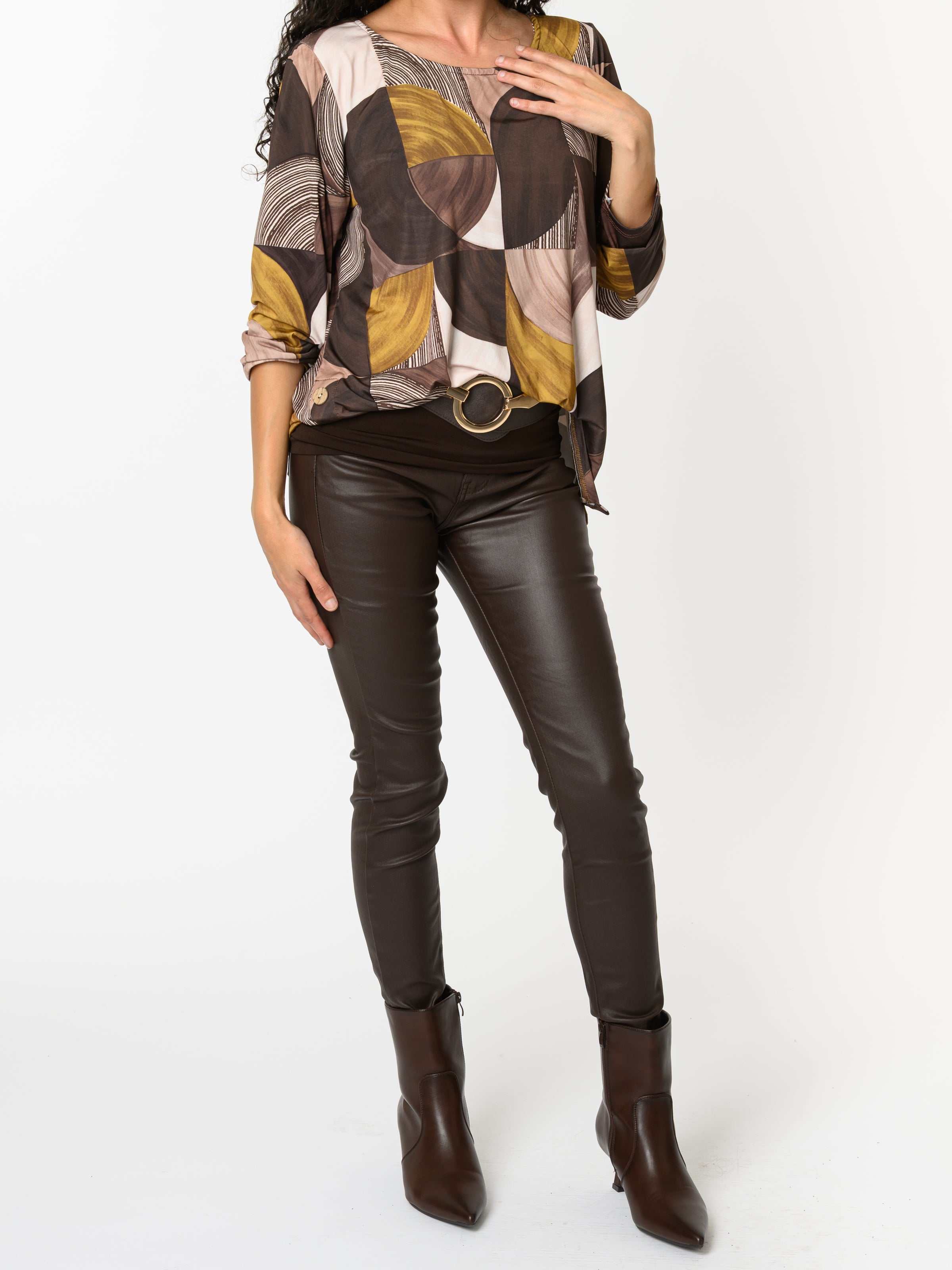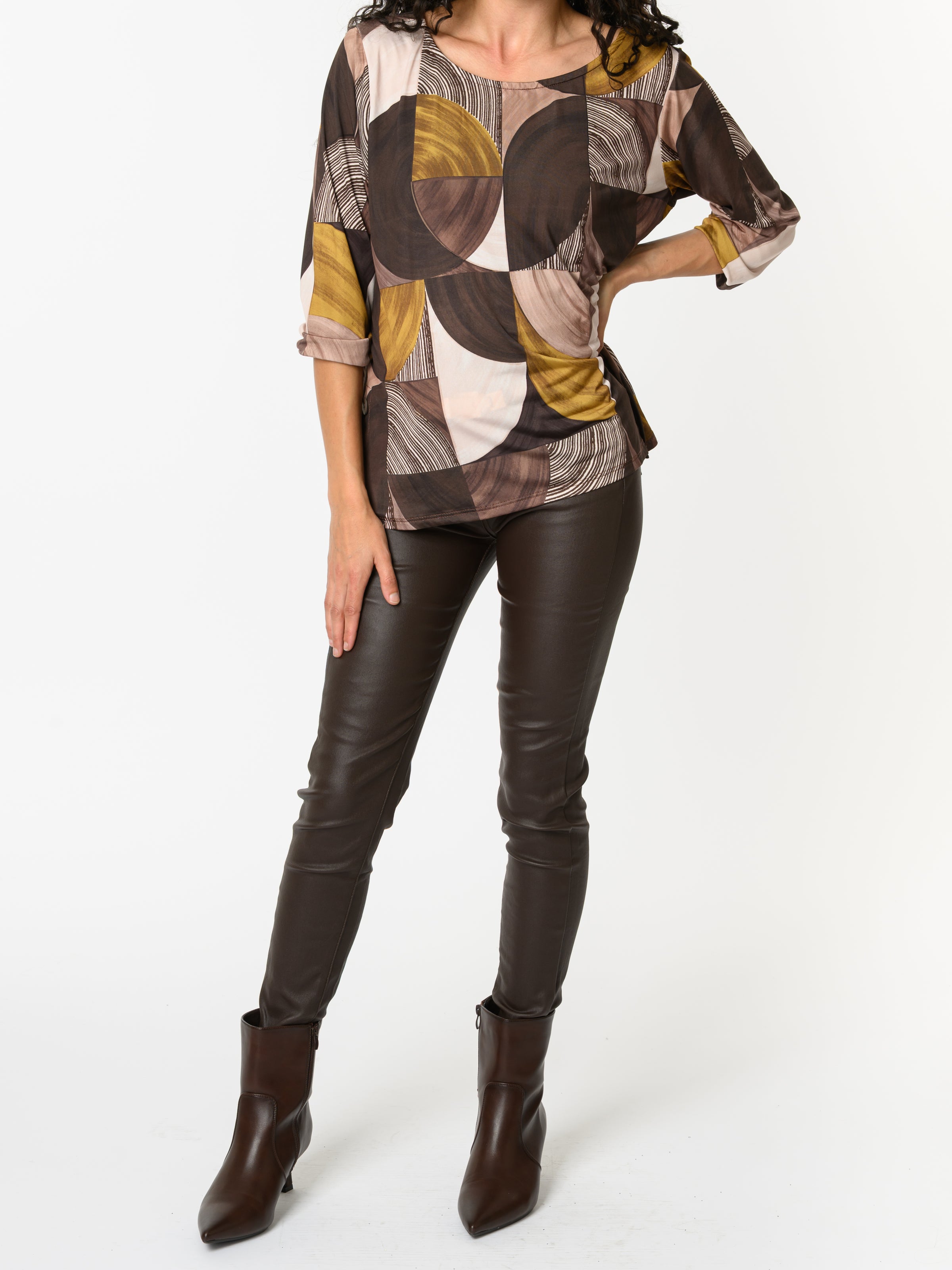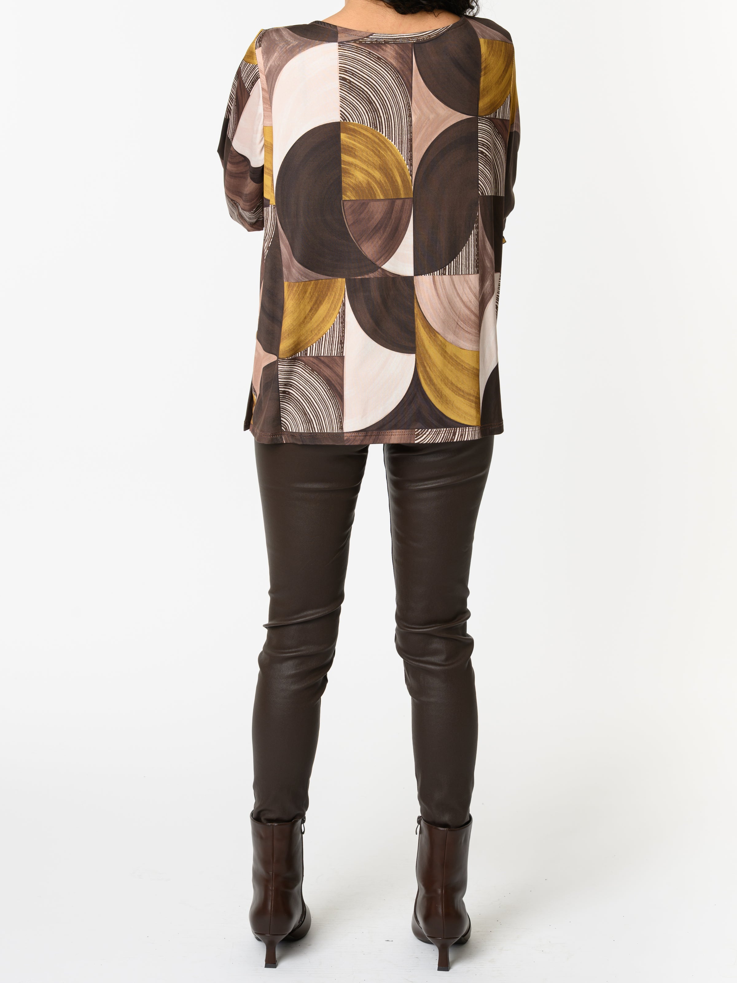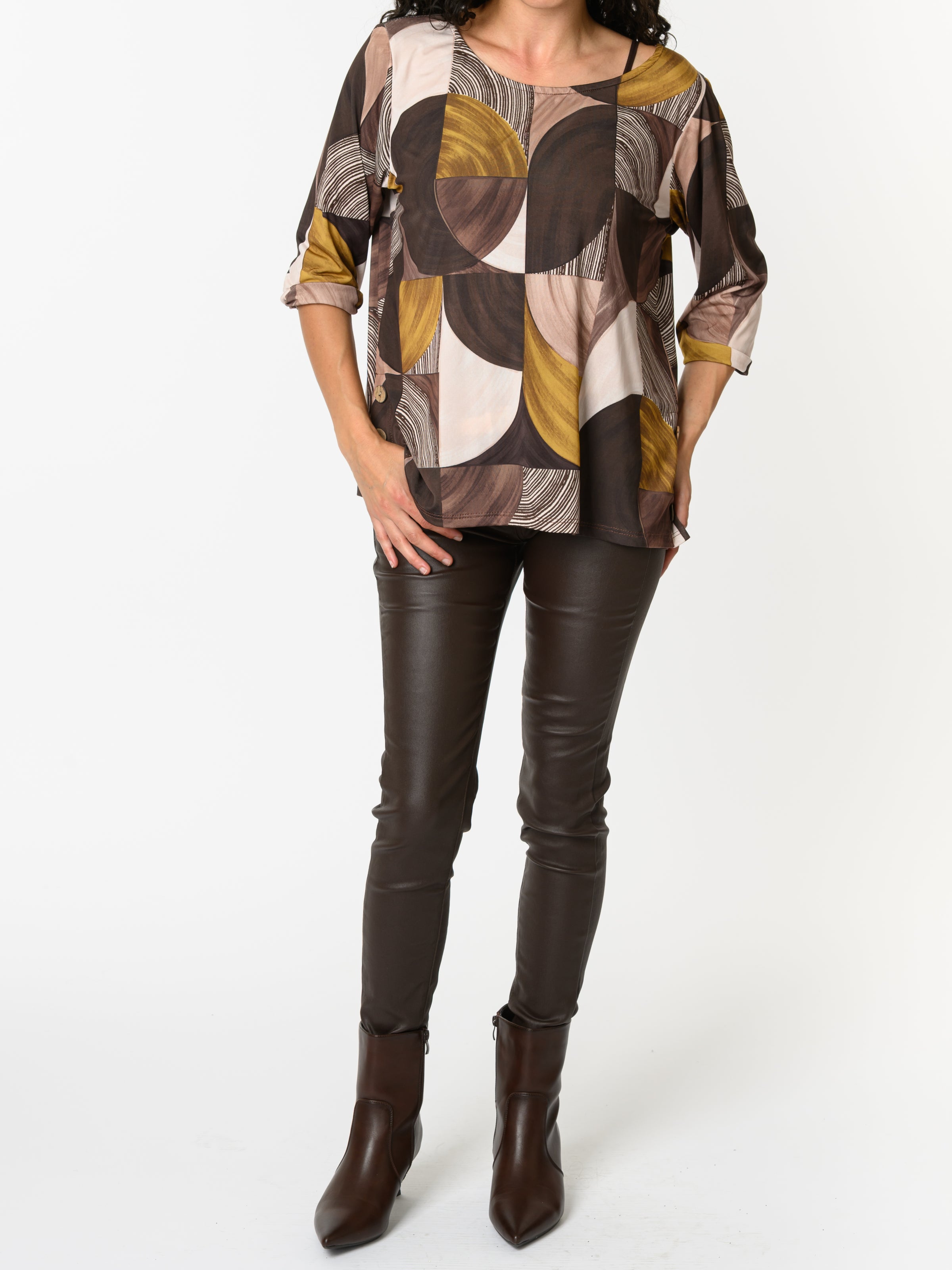 Découvrez notre chandail avec imprimé géométrique multicolore. Ce modèle à manches longues comporte un imprimé géométrique jaune, brun & beige. Il est orné de trois boutons de bois sur les côtés. Avec son design original, cette pièce allie style décontracté et tendance.