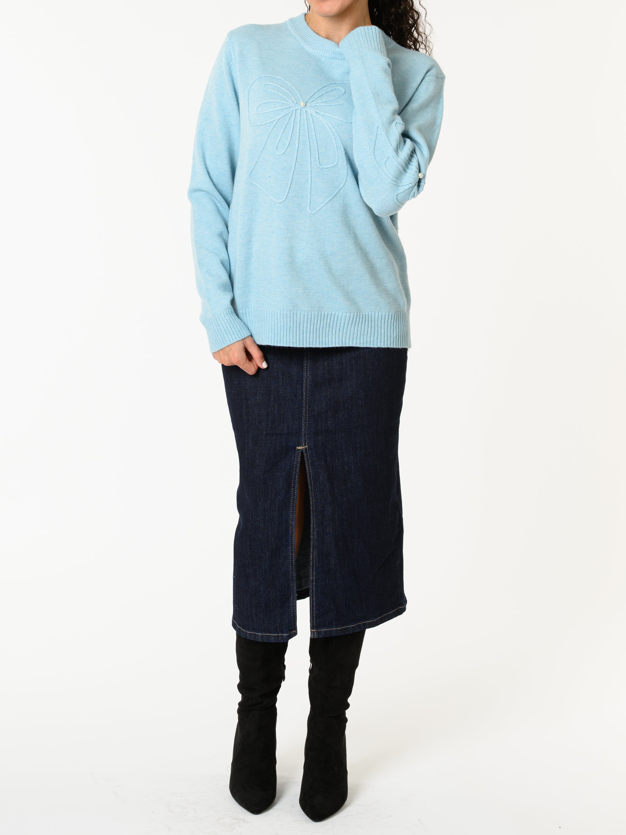 Découvrez notre chandail bleu ciel avec boucle. Ce modèle à manches longues comporte une forme d'une grande boucle sur le devant, ornée d'une perle blanche au centre. Il est doux et il allie style et confort.
