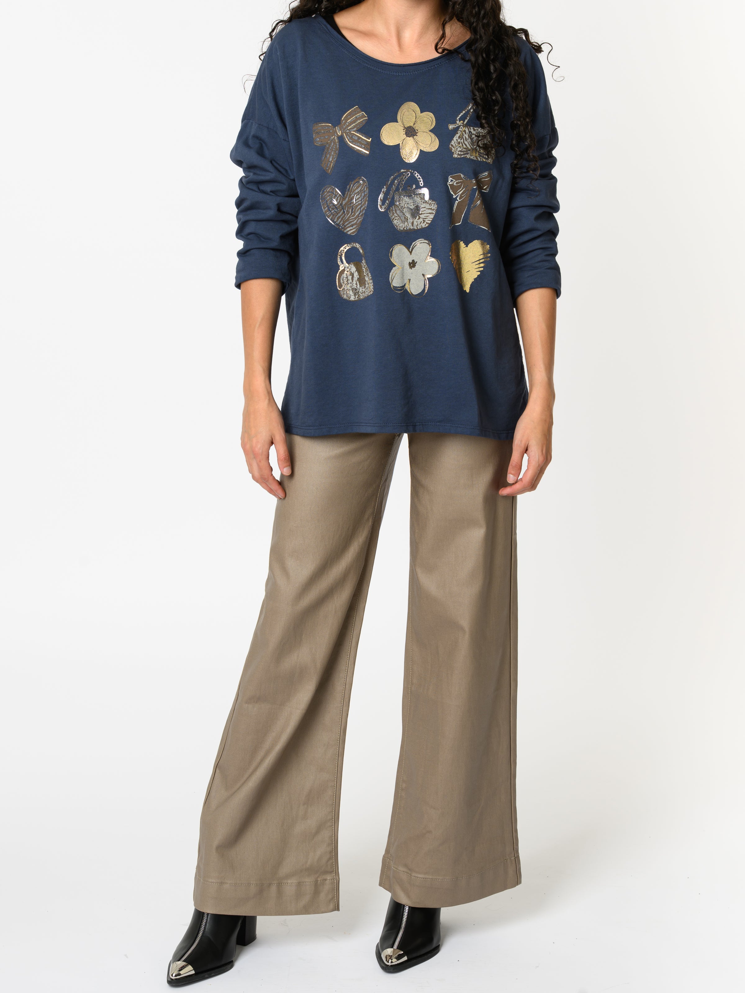 Découvrez notre chandail bleu jean avec imprimé doré et argenté. Ce modèle à manches longues est orné de motifs de fleurs, boucles, cœurs et sacs à main. Il s'agit d'une pièce originale et féminine. Ce modèle allie style décontracté et confort.