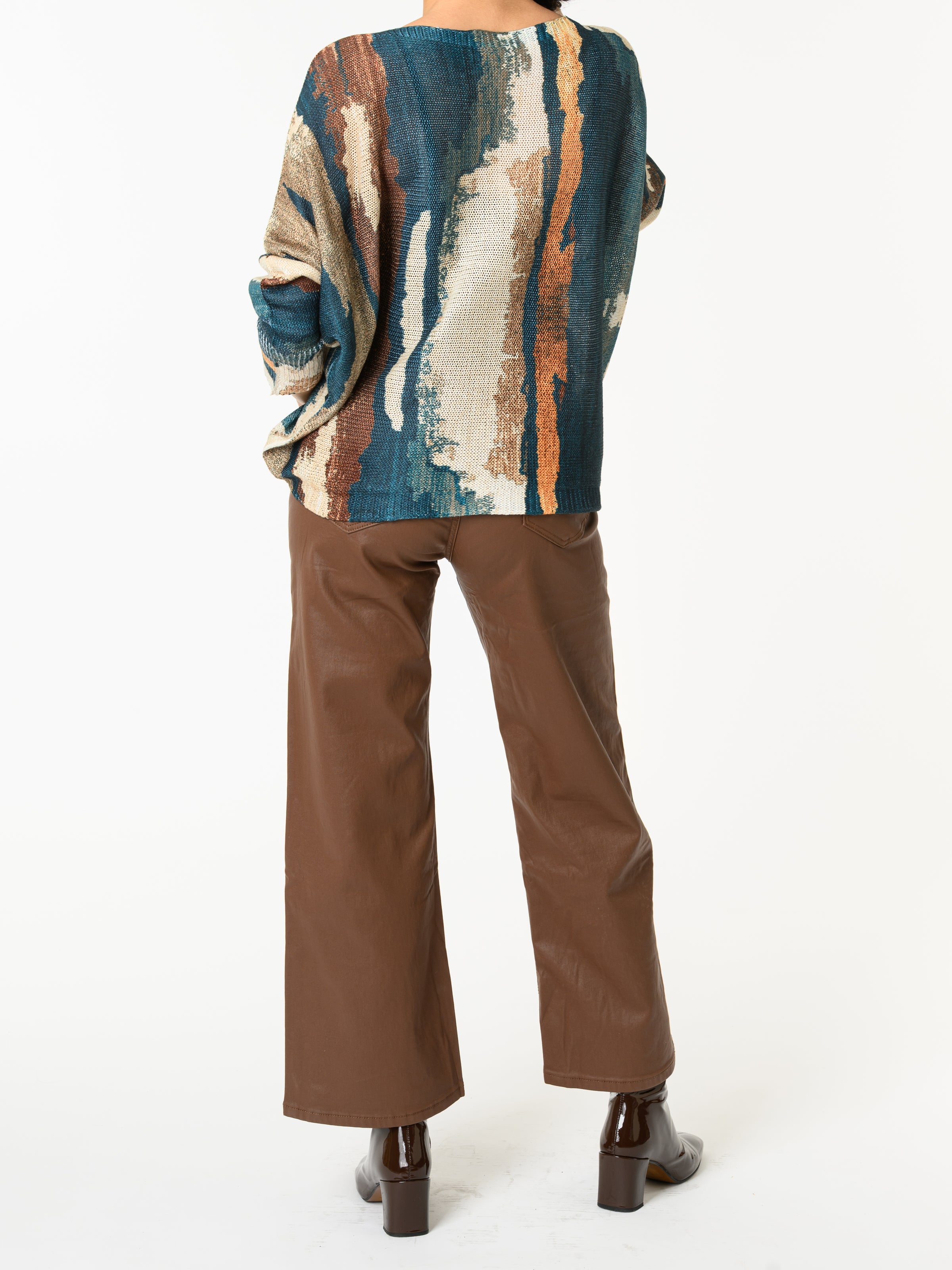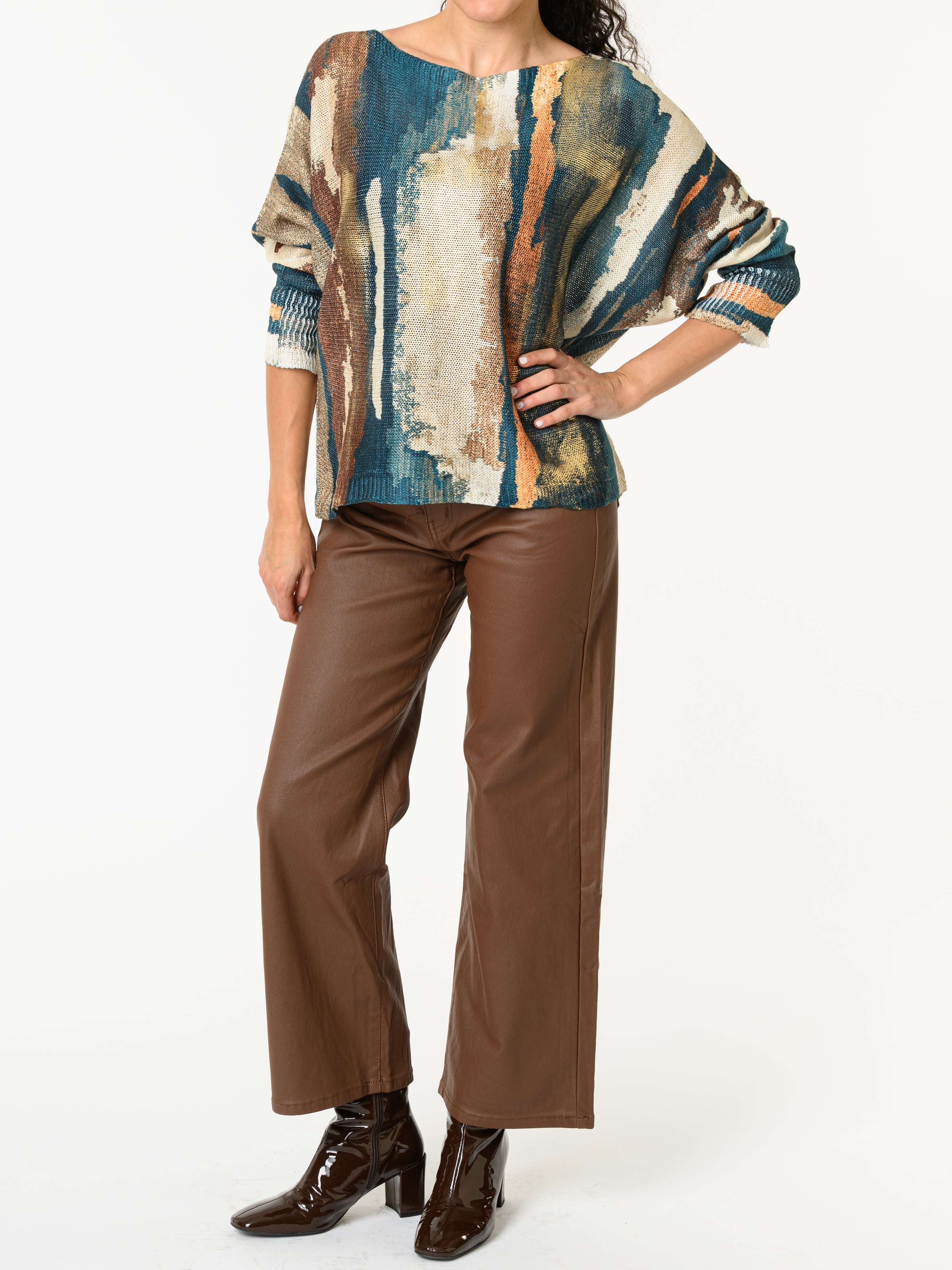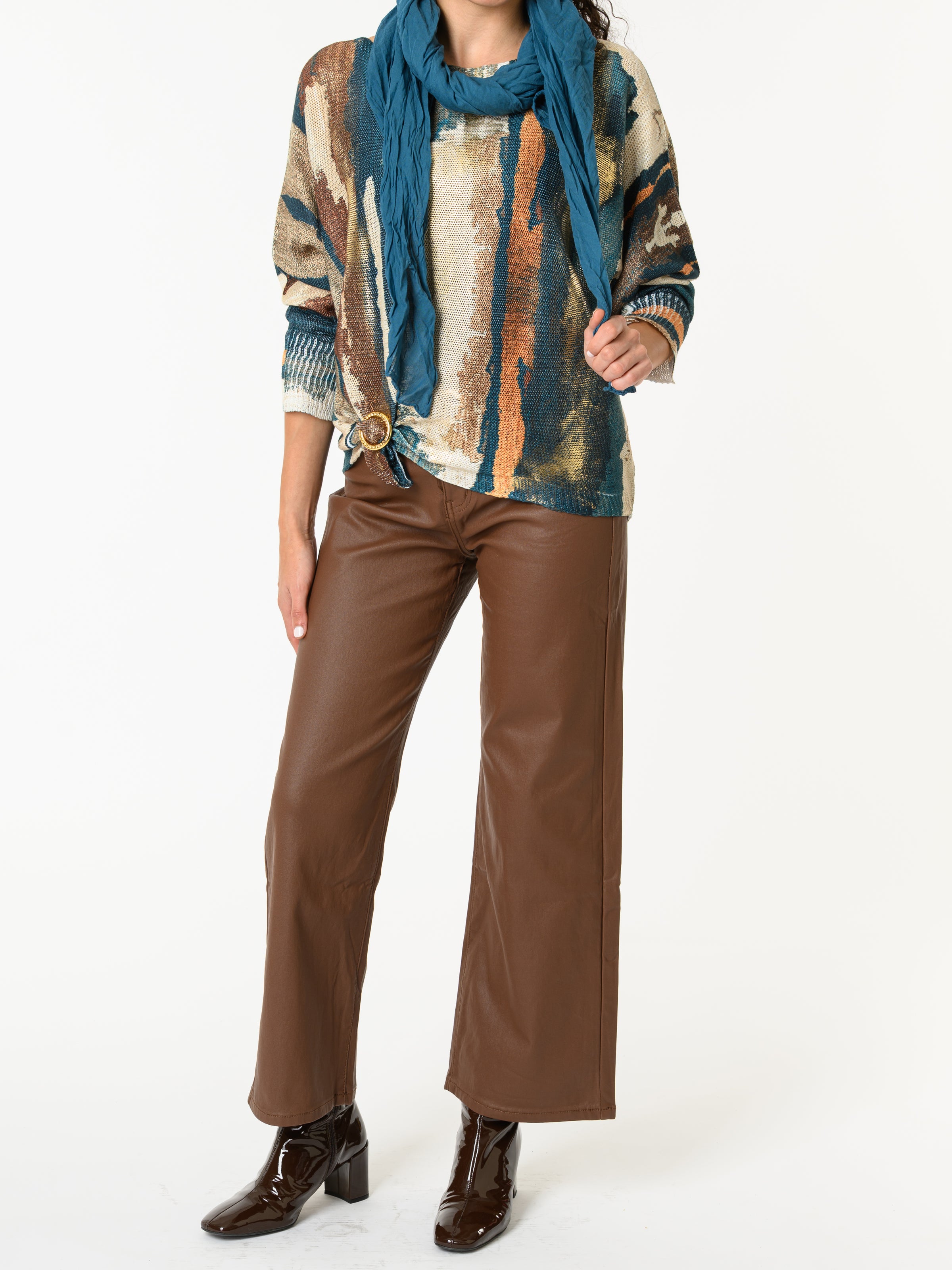 Découvrez notre chandail bleu sarcelle et beige avec dorures. Ce modèle à manches longues est orné d'un imprimé abstrait bleu sarcelle, beige, brun et orange avec des dorures. Cette pièce est légère et idéale pour être portée en superposition. Ce chandail allie style et élégance.