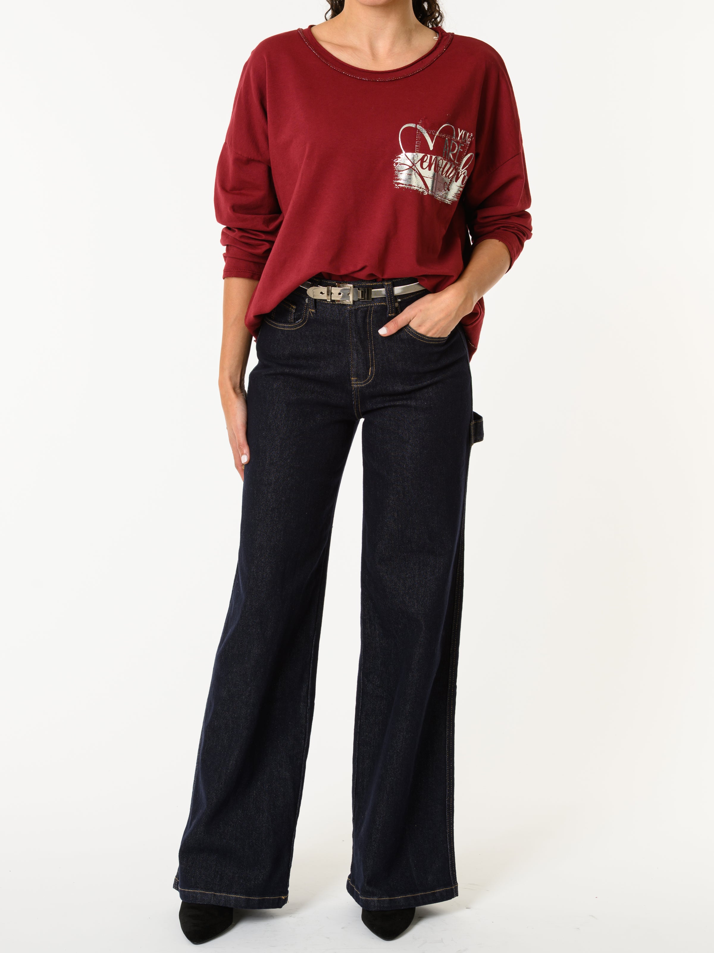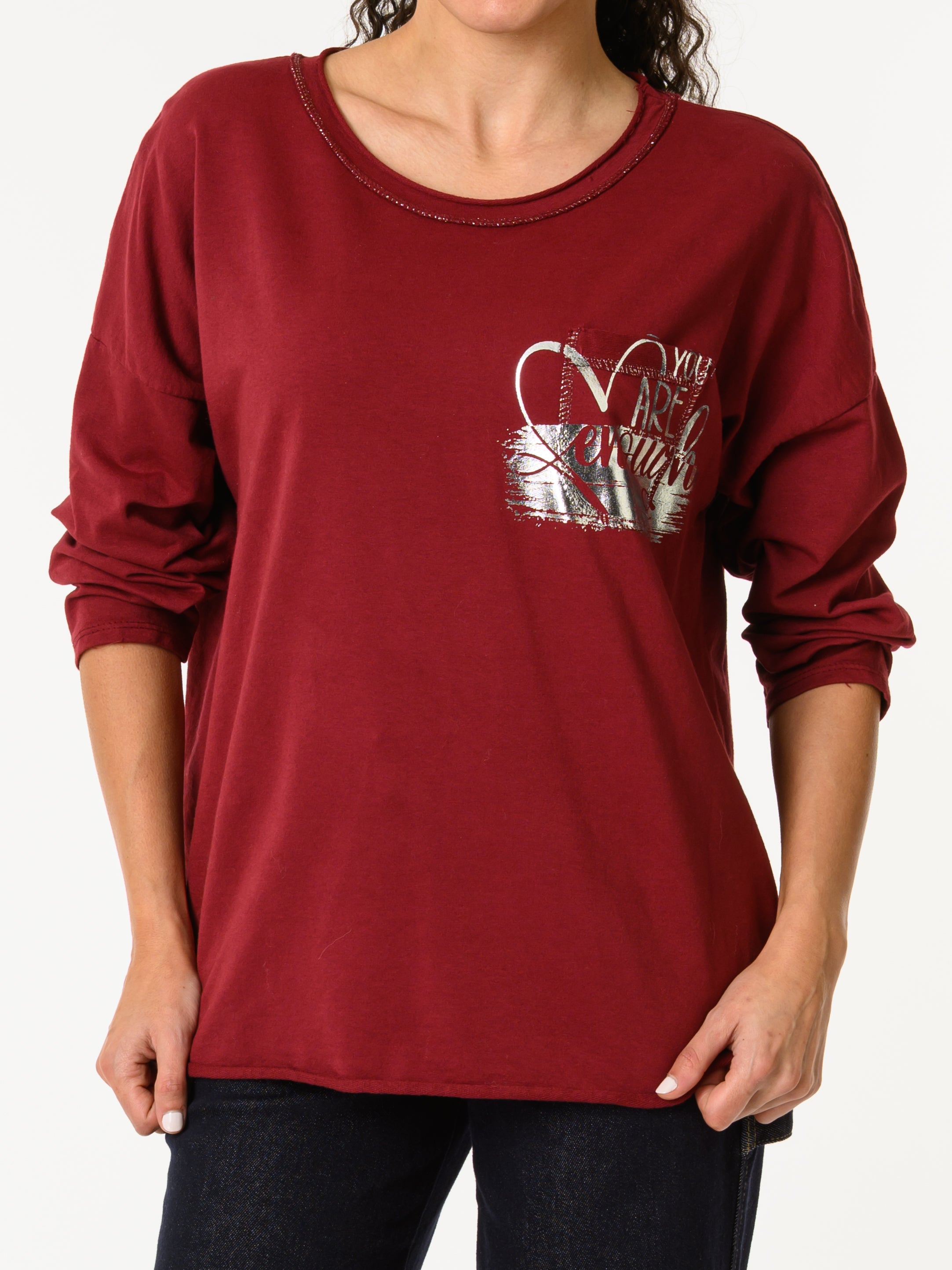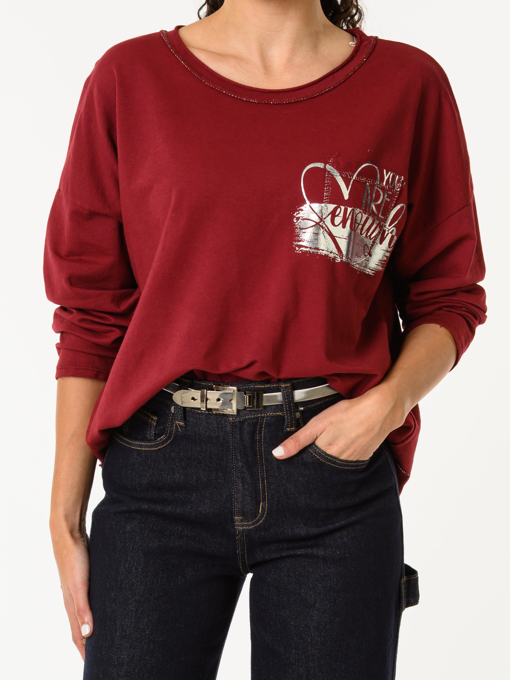 Découvrez notre chandail bourgogne avec imprimé argenté. Ce modèle à manches longues est orné d'un imprimé d'un cœur argenté, ainsi que la phrase ''You are enough''. Avec son imprimé et sa poche pratique, ce chandail allie style décontracté et confort.