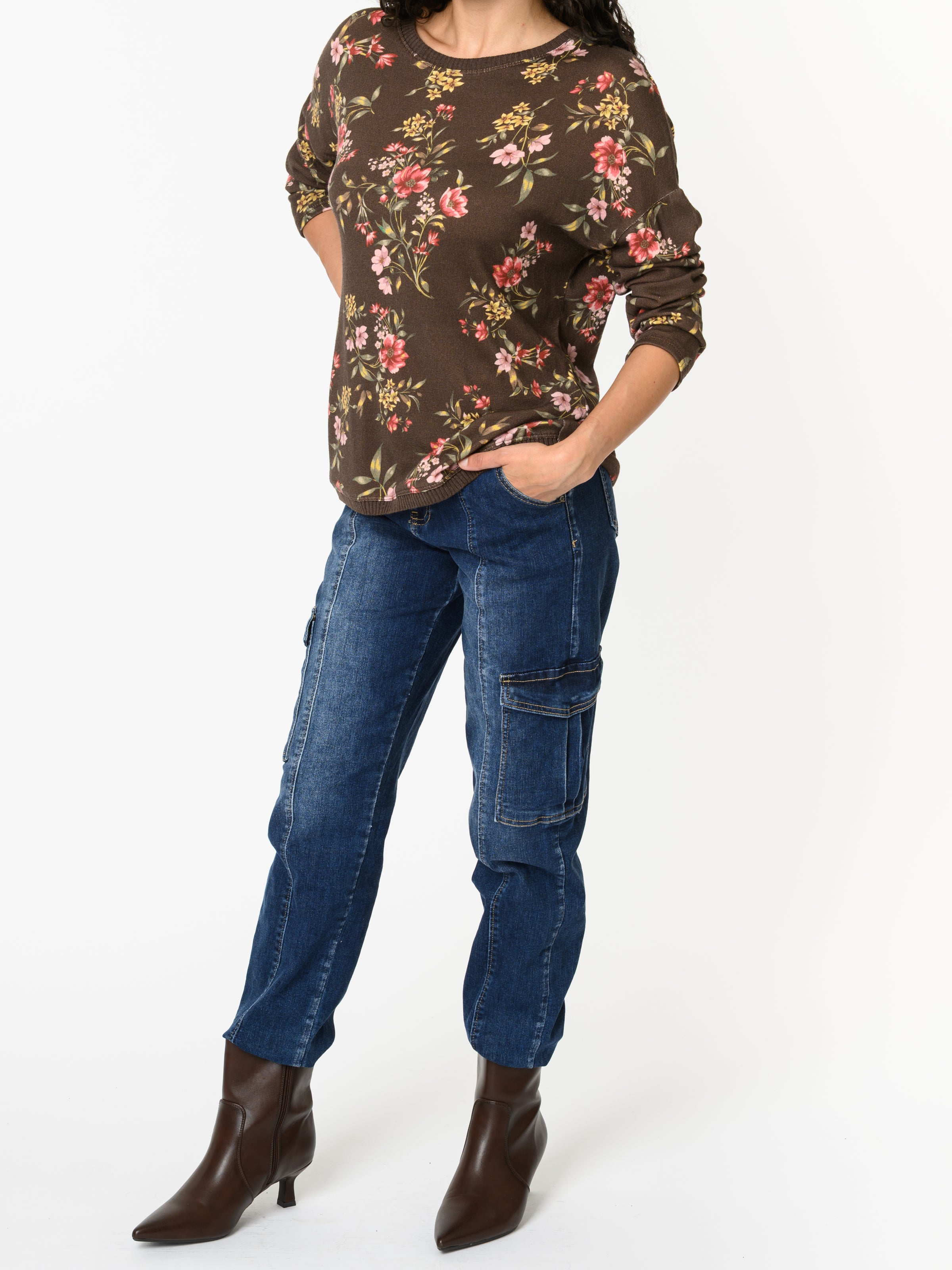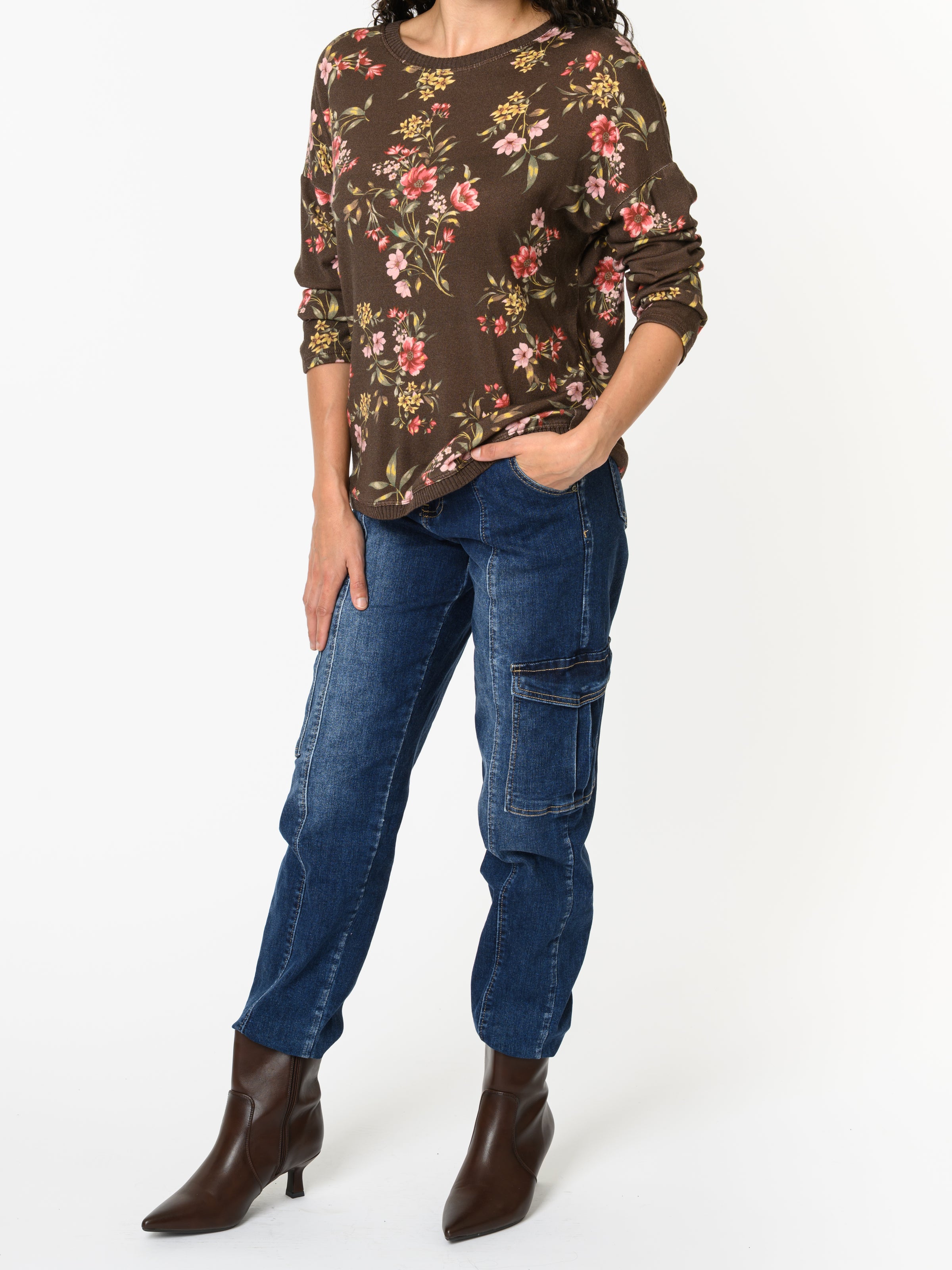 Découvrez notre chandail brun à manche longue avec imprimé floral. Ce modèle à manches longues est orné d'un imprimé floral rose, rouge, jaune et vert. Avec son design féminin, cette pièce allie style et confort.