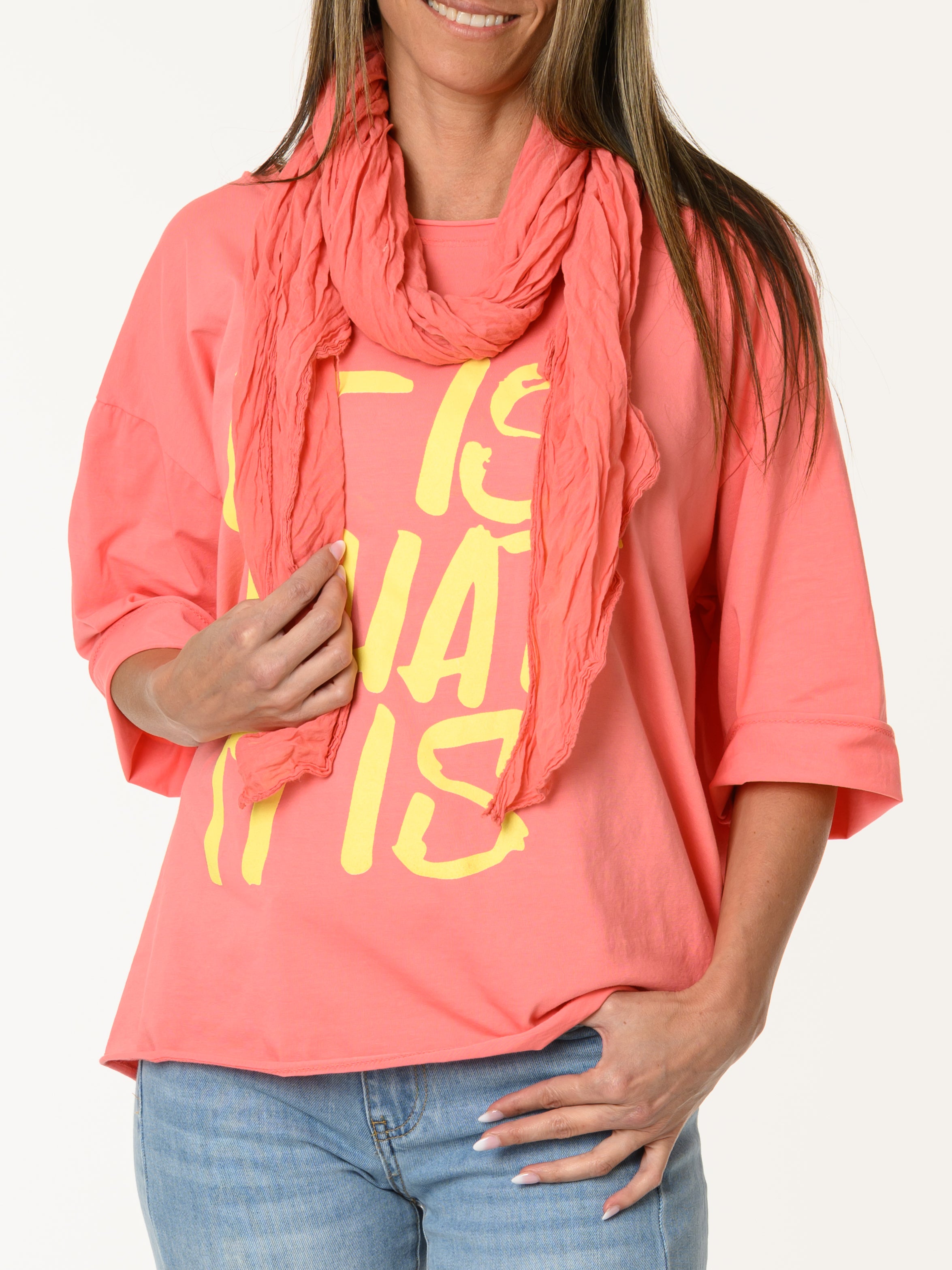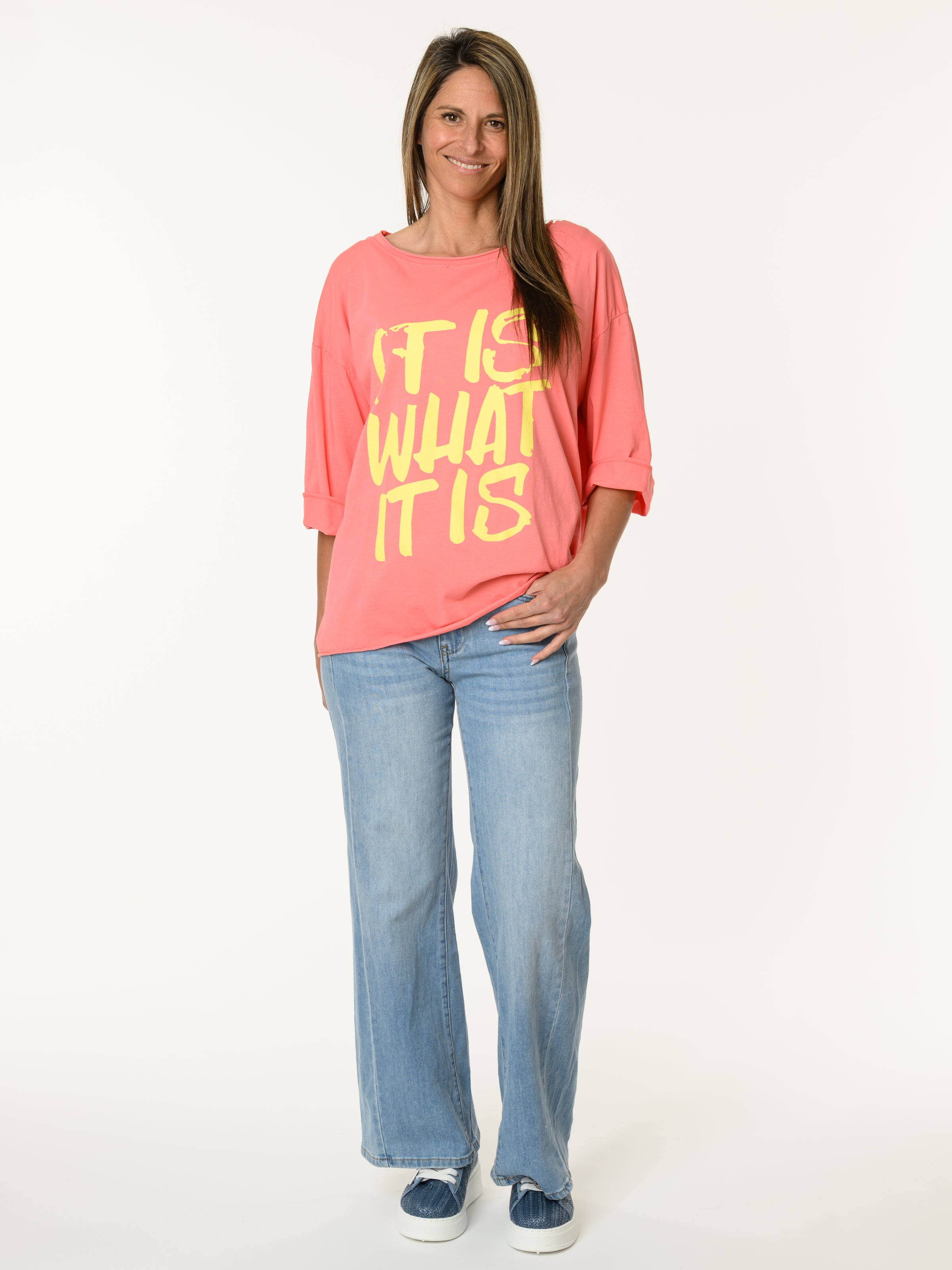 Découvrez notre chandail corail avec imprimé jaune. Ce chandail à manches 3/4 comporte la phrase ''It is what it is'' imprimée en jaune. Cette pièce allie style décontracté et tendance.