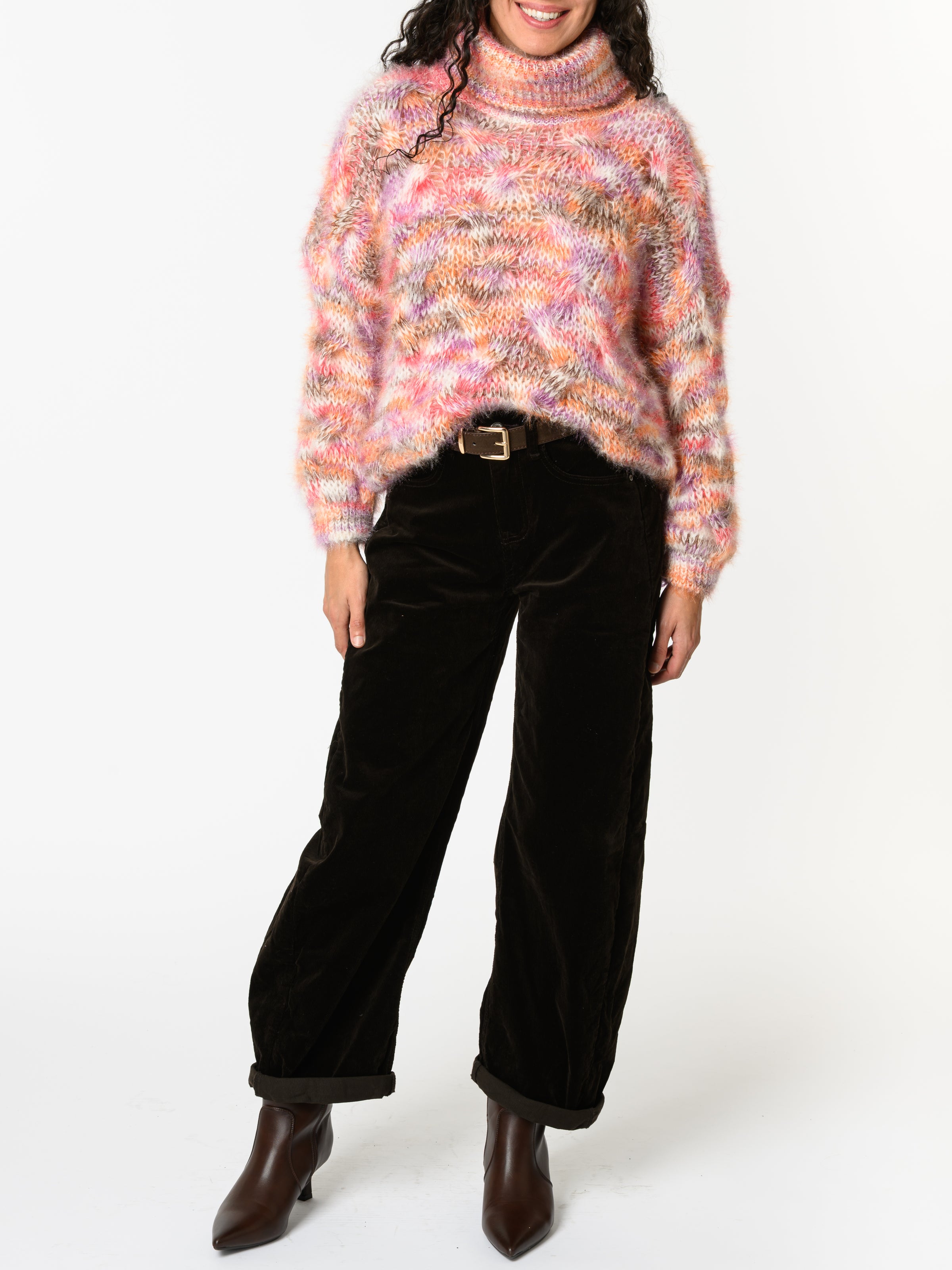 Découvrez notre chandail en tricot orange et rouge. Ce modèle à manches longues comporte un imprimé multicolore, orange, rouge, mauve, brun et blanc. Avec son col roulé et sa texture, ce tricot est chaud et idéal pour les journées froides. Cette pièce allie style et confort.
