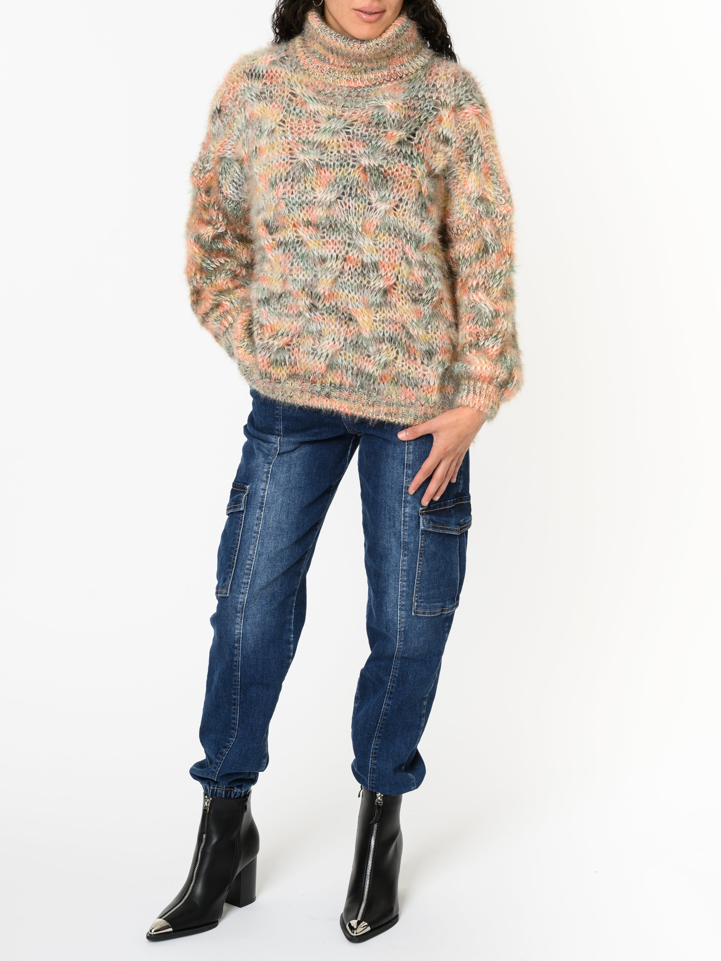 Découvrez notre chandail en tricot orange et vert. Ce modèle à manches longues comporte un imprimé multicolore, orange, jaune, brun et vert. Avec son col roulé et sa texture, ce tricot est chaud et idéal pour les journées froides. Cette pièce allie style et confort.