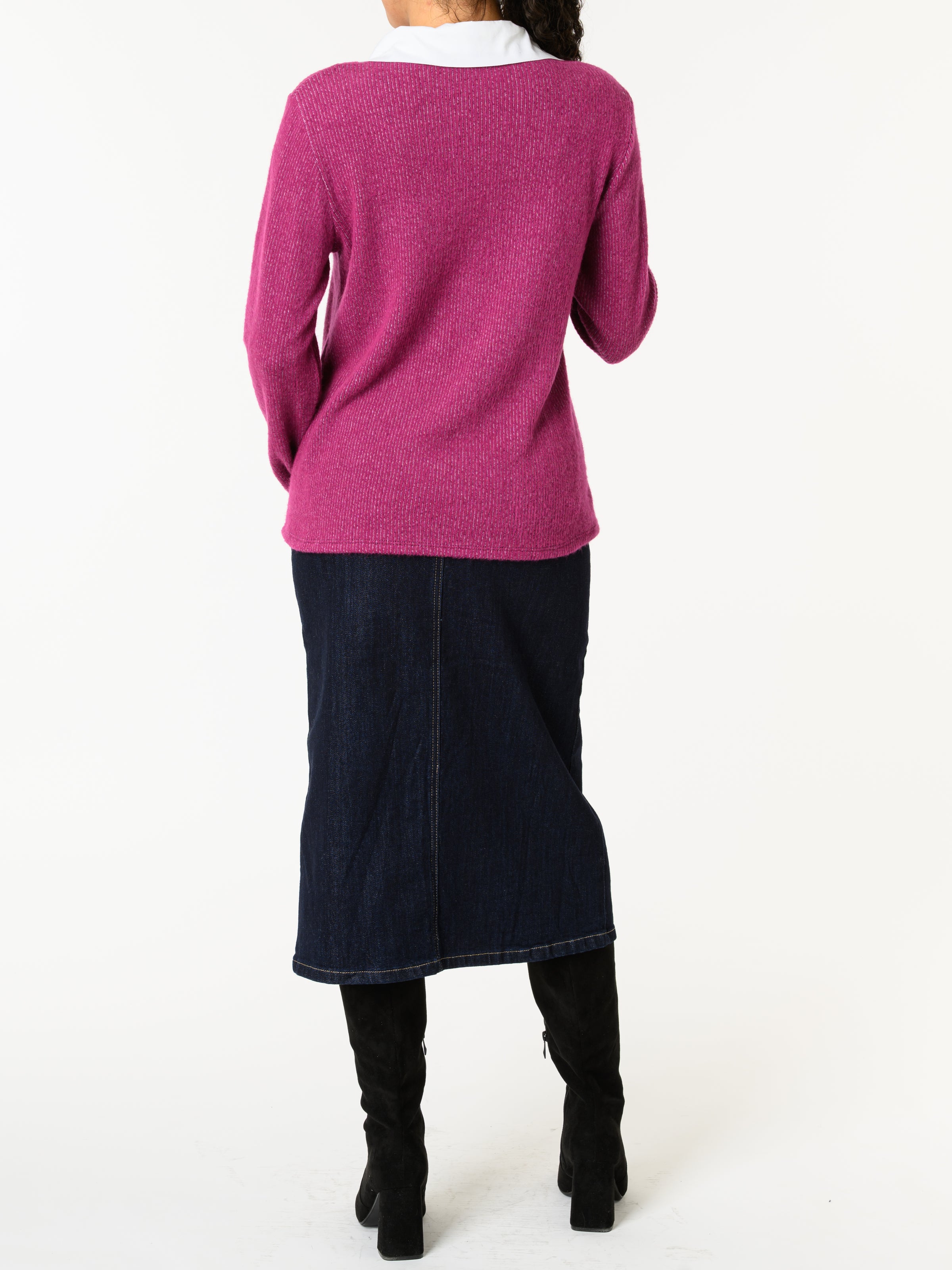 Découvrez notre chandail fuchsia avec col chemise. Ce modèle à manches longues comporte des rayures subtiles, le tout dans la même couleur. Il possède également un col de chemise blanche intégré dedans. Cette pièce allie style et tendance.