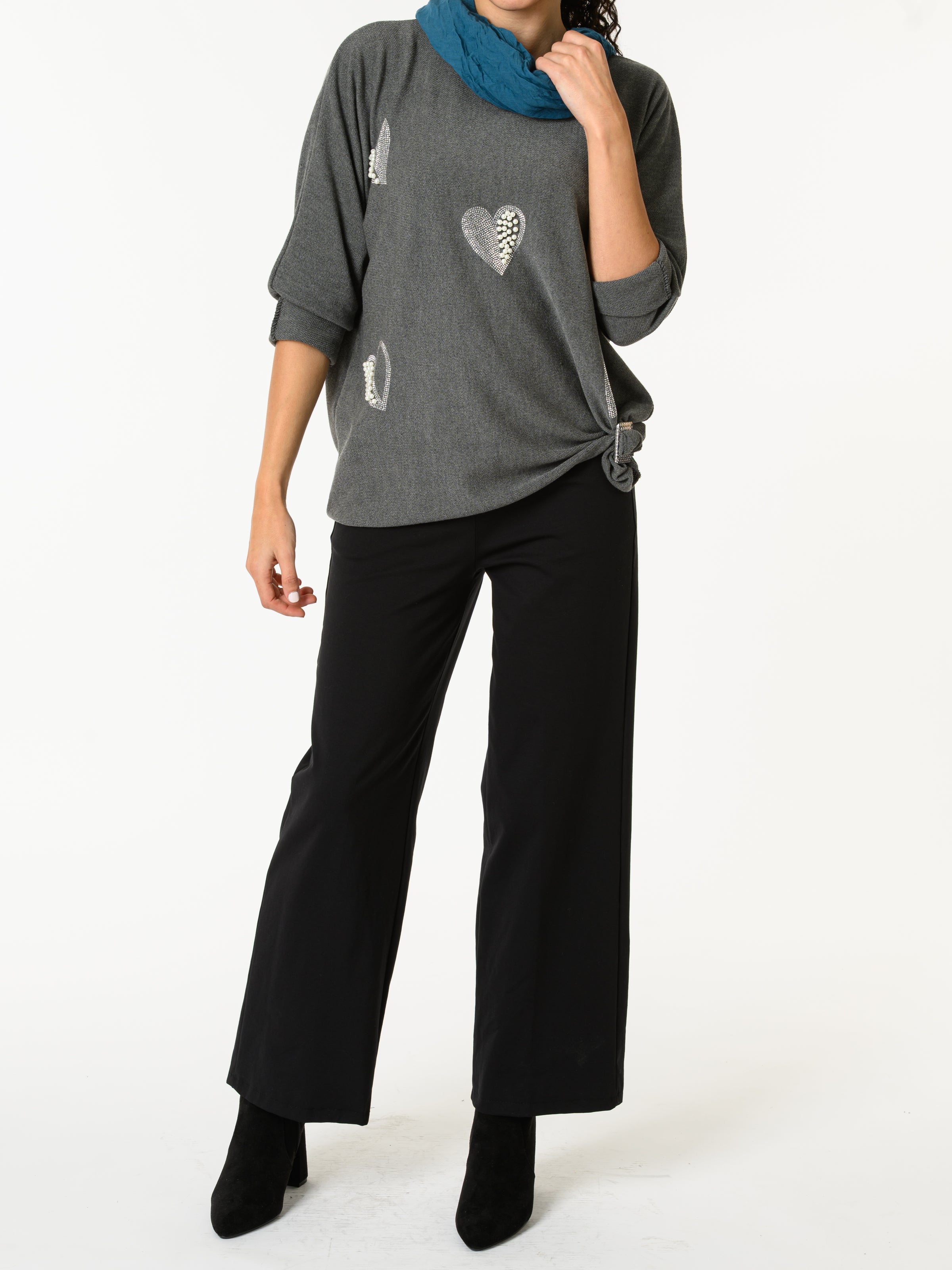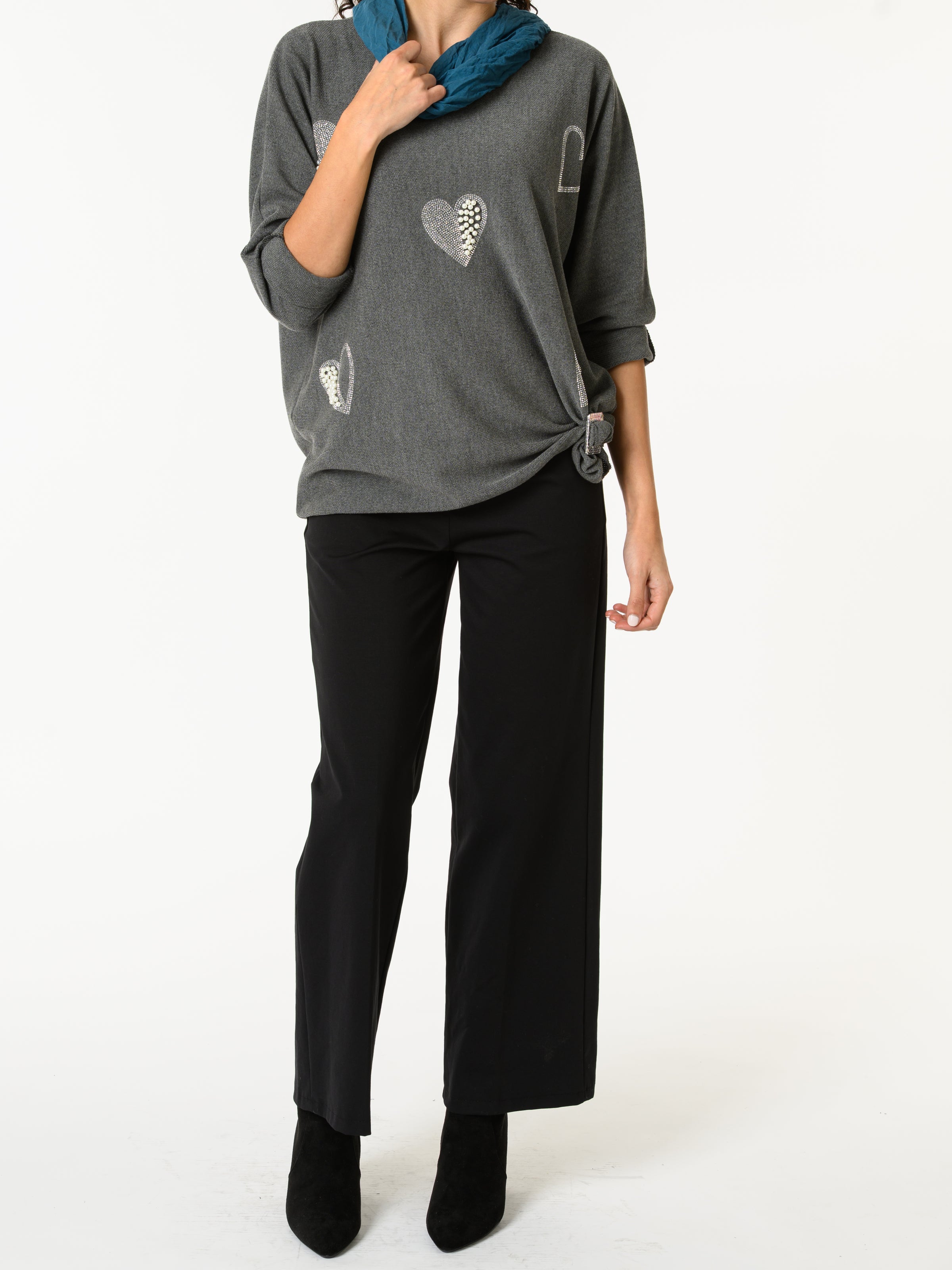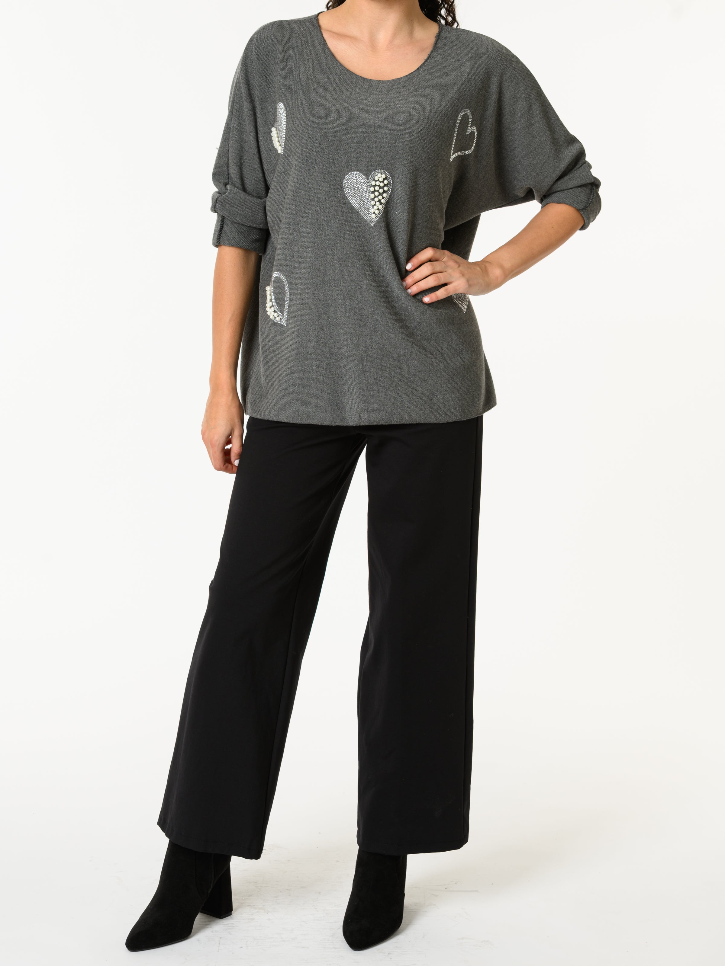 Découvrez notre chandail gris avec cœurs argentés. Ce modèle à manches longues est orné de cœurs composés de perles et de pépites brillantes. Avec sa couleur unie et ses touches de brillant, ce chandail allie style féminin et tendance.