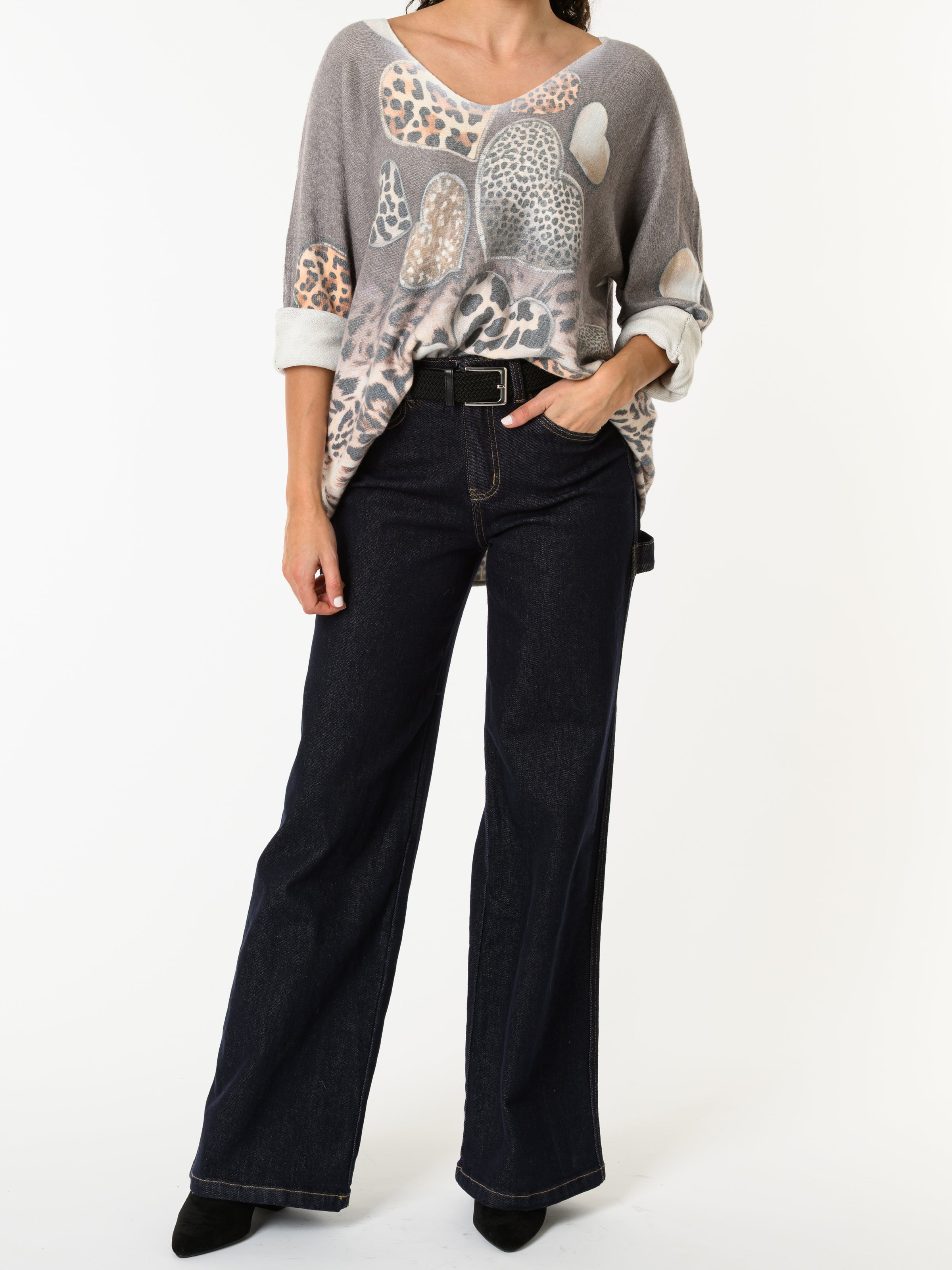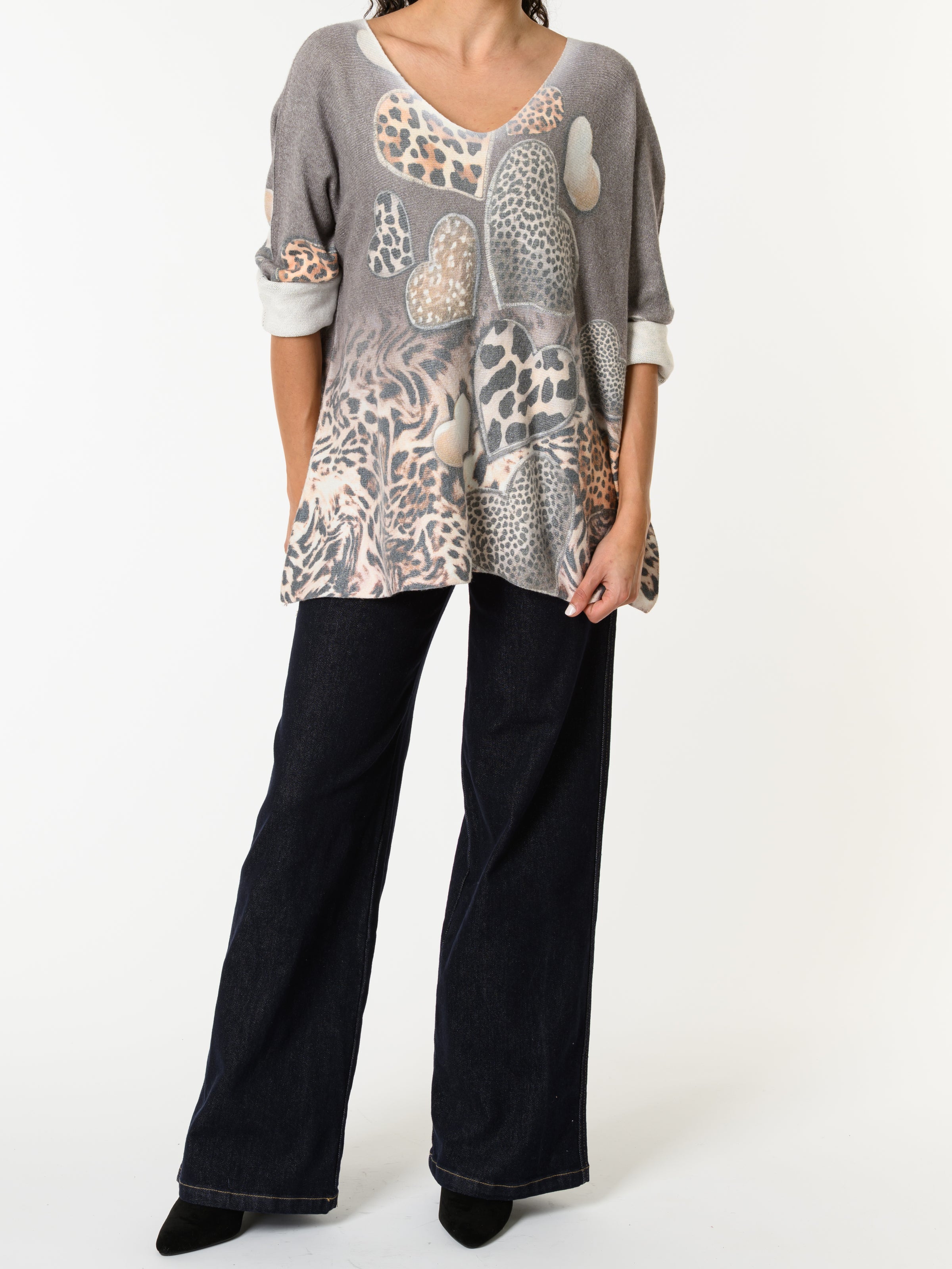 NEW - Chandail gris avec imprimé de cœurs léopard