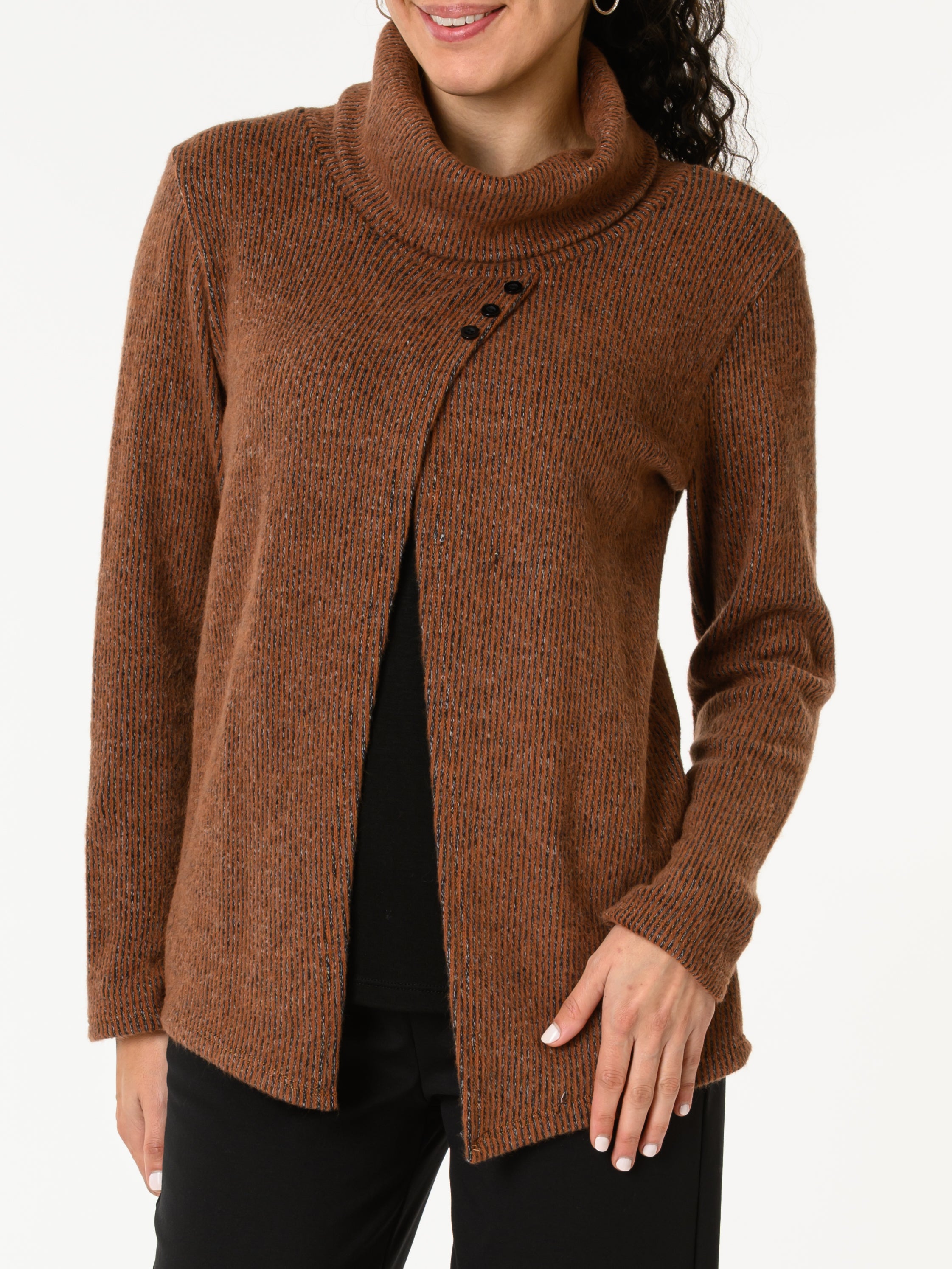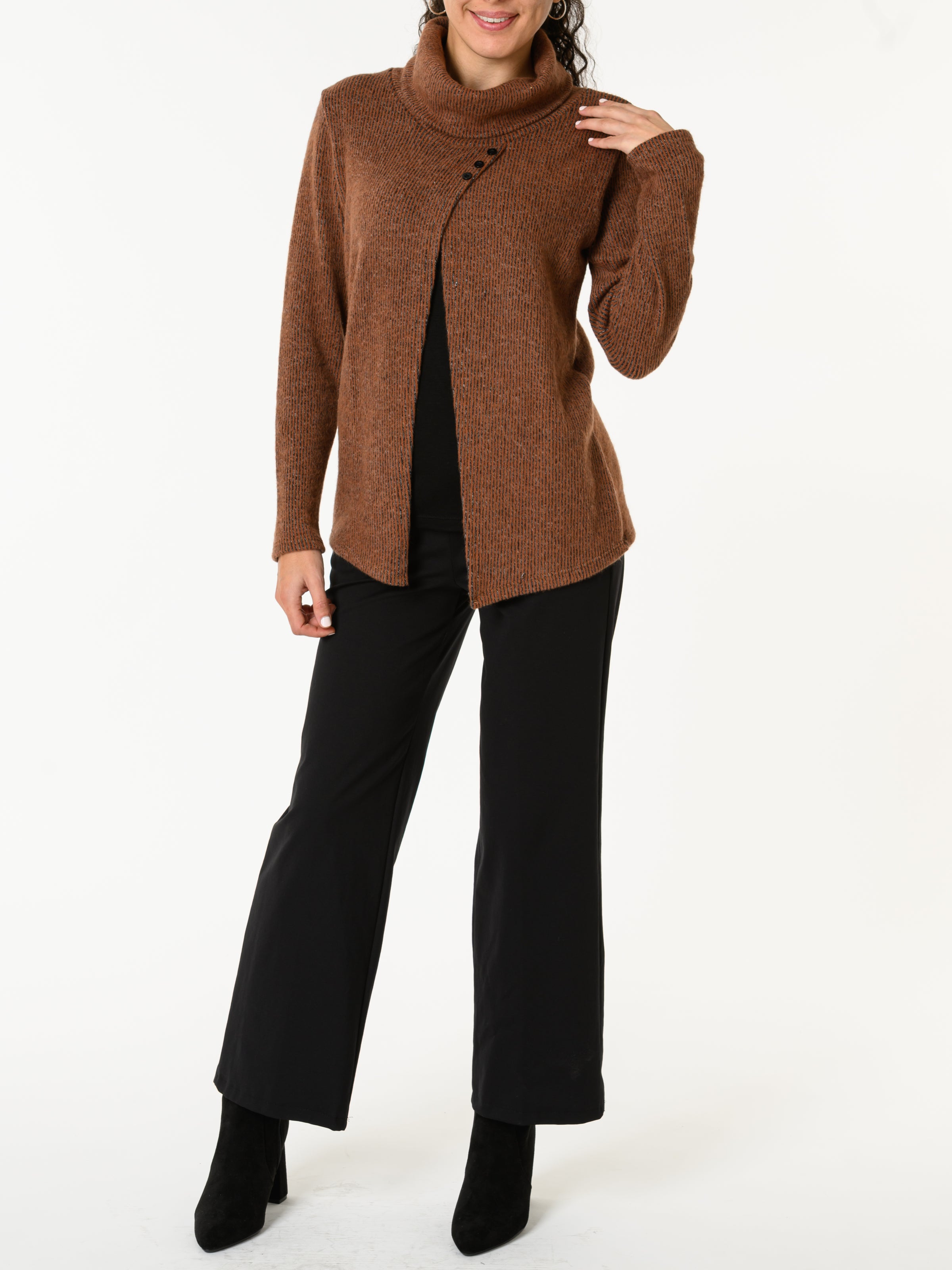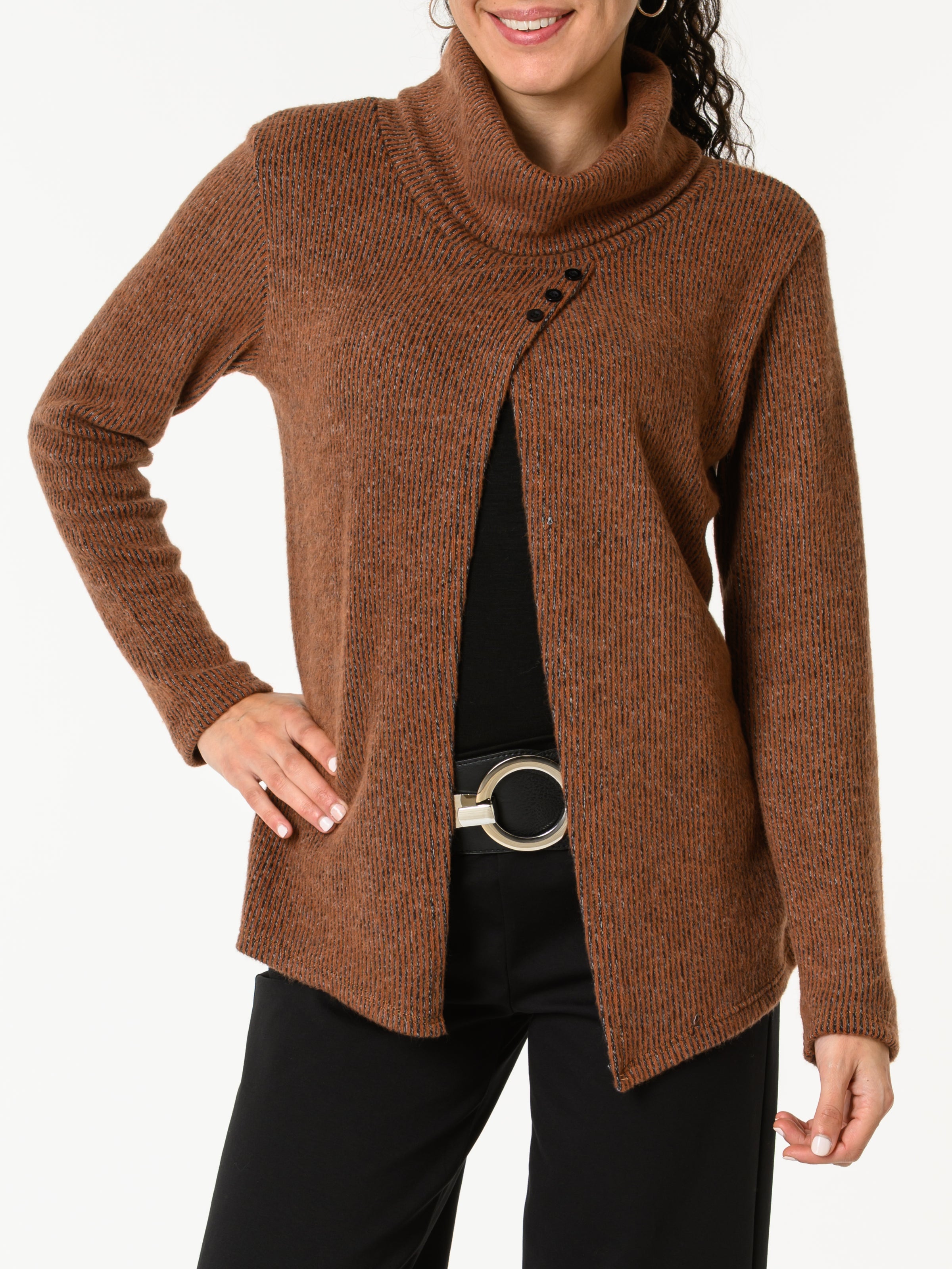 Découvrez notre chandail marron à col roulé. Ce modèle à manches longues comporte trois boutons décoratifs noirs, ainsi qu'une ouverture sur le devant. Il possède également une camisole noire intégrée dans le chandail. Ce modèle est chaud et confortable et il allie style et tendance.