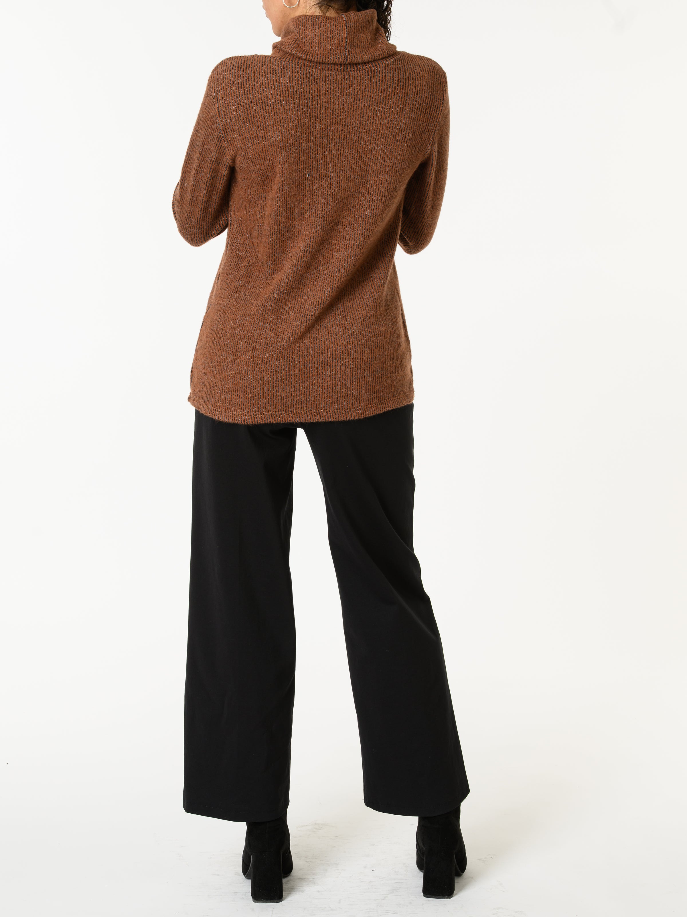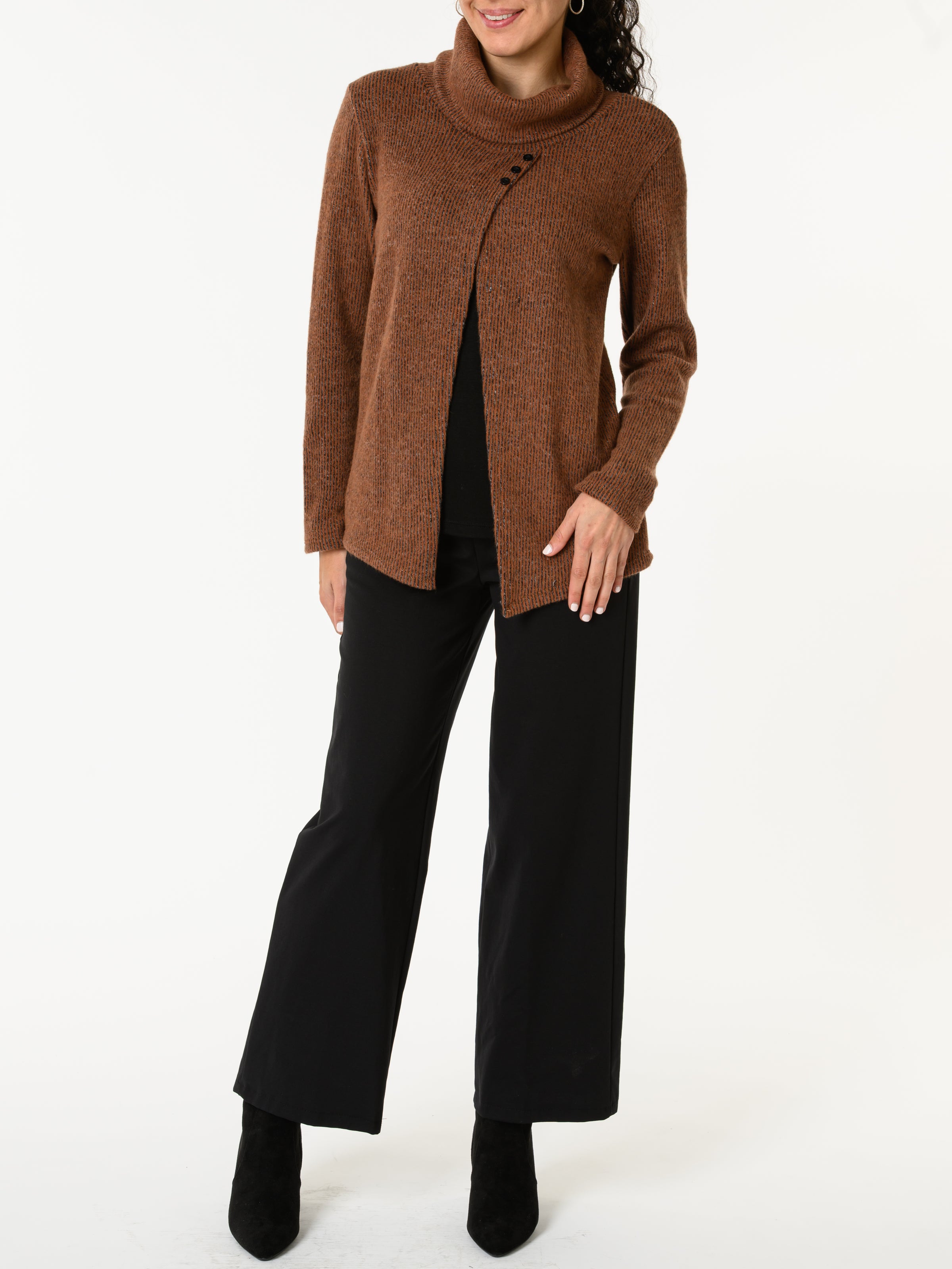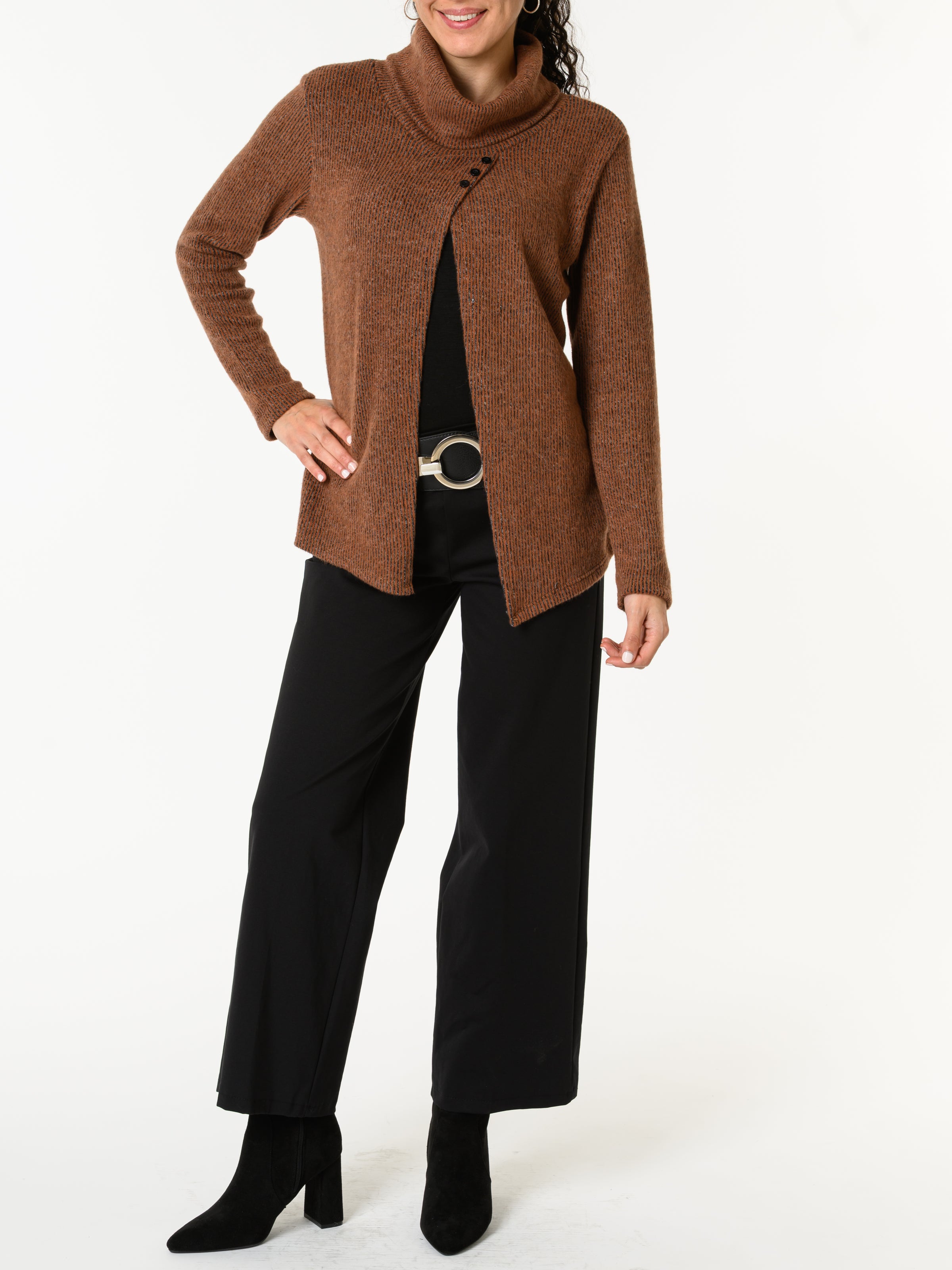 Découvrez notre chandail marron à col roulé. Ce modèle à manches longues comporte trois boutons décoratifs noirs, ainsi qu'une ouverture sur le devant. Il possède également une camisole noire intégrée dans le chandail. Ce modèle est chaud et confortable et il allie style et tendance.