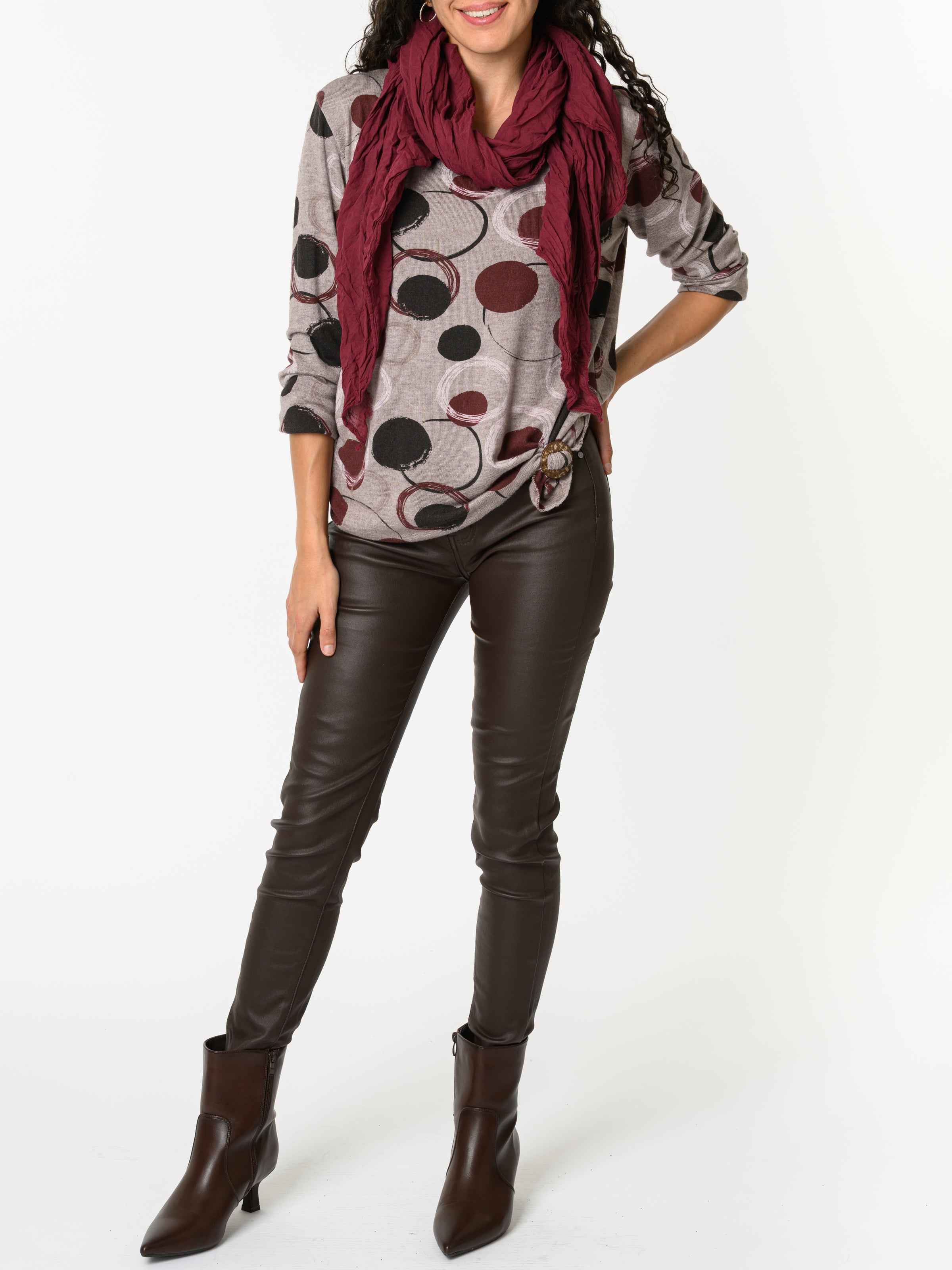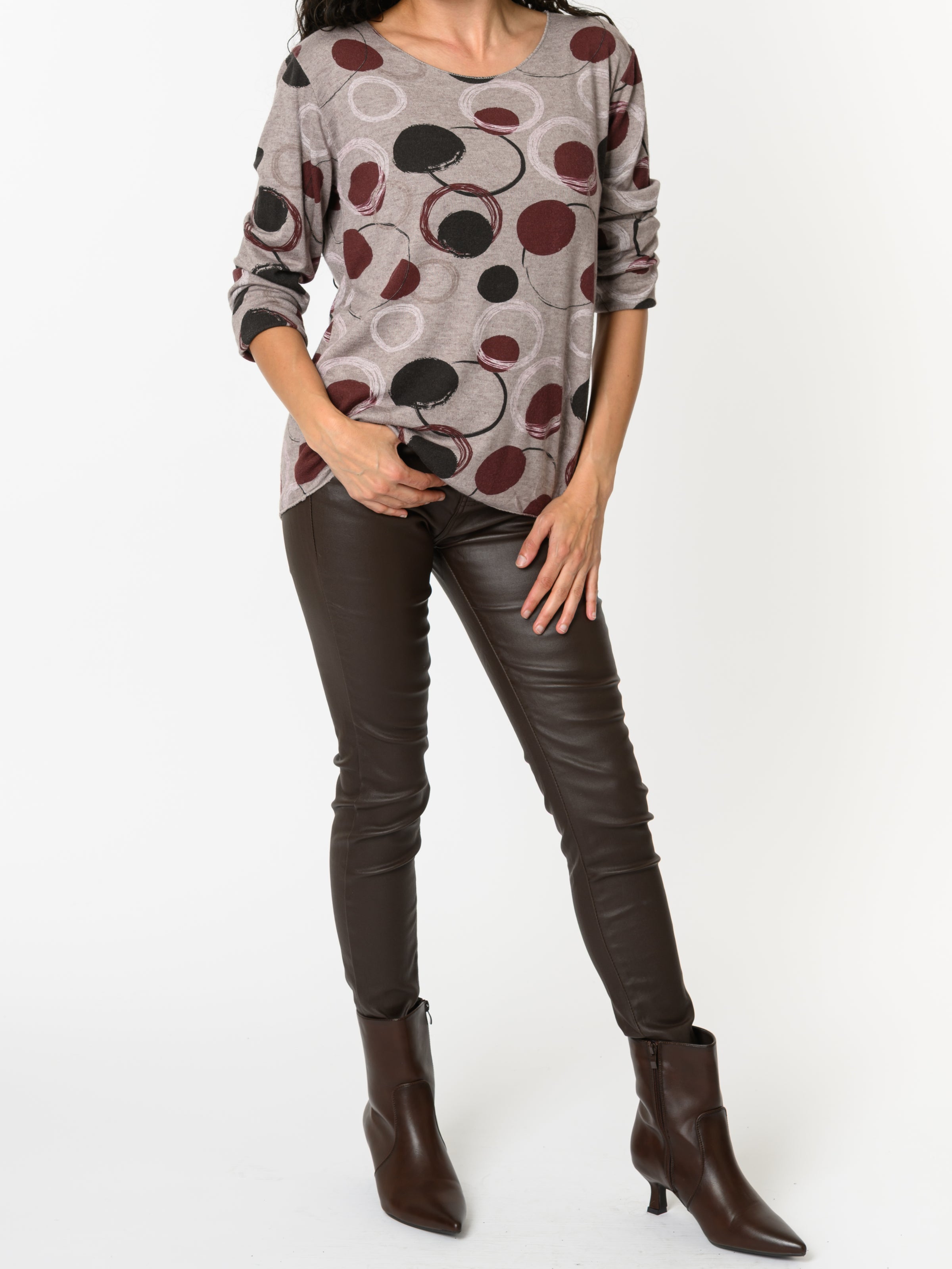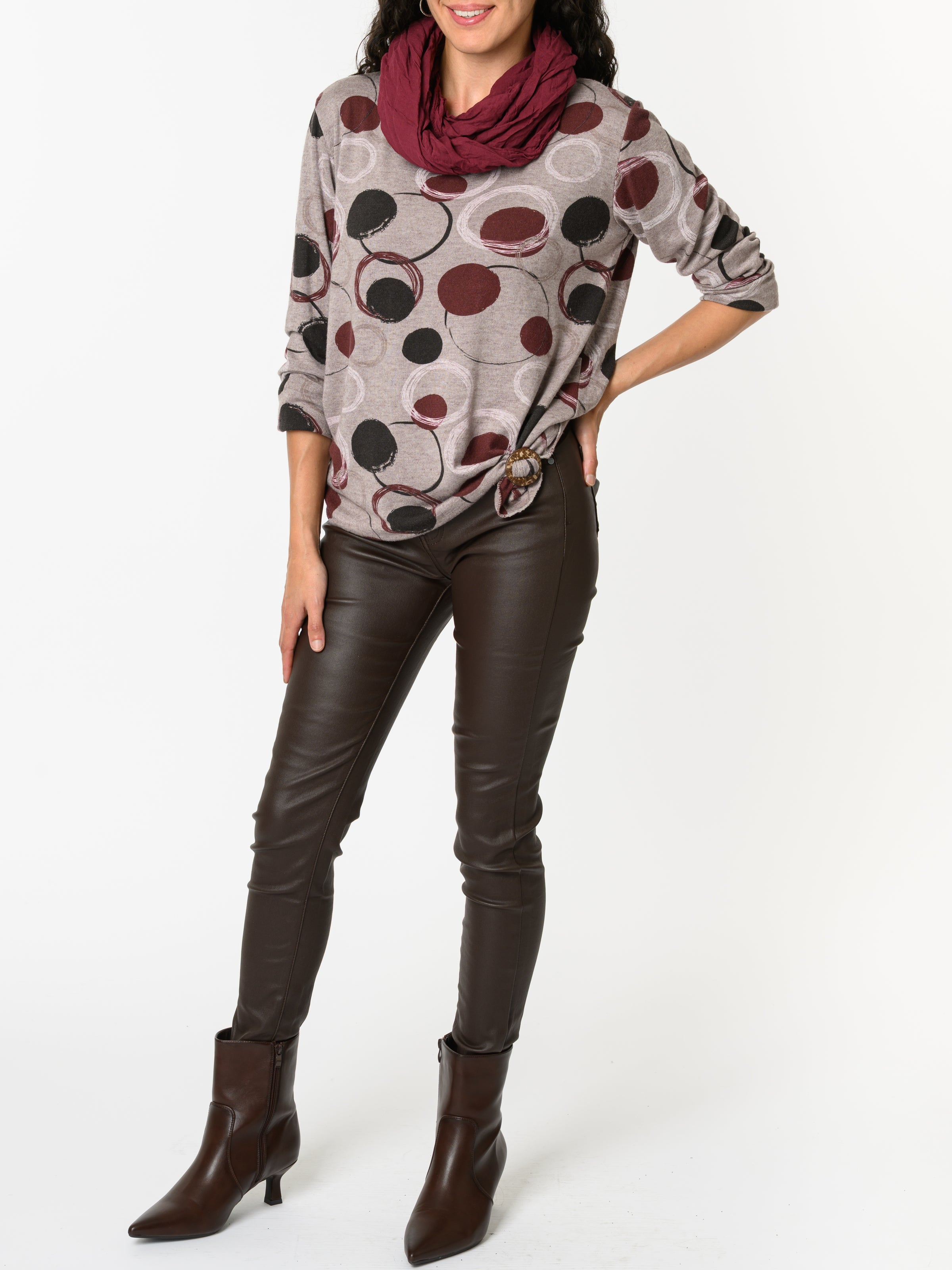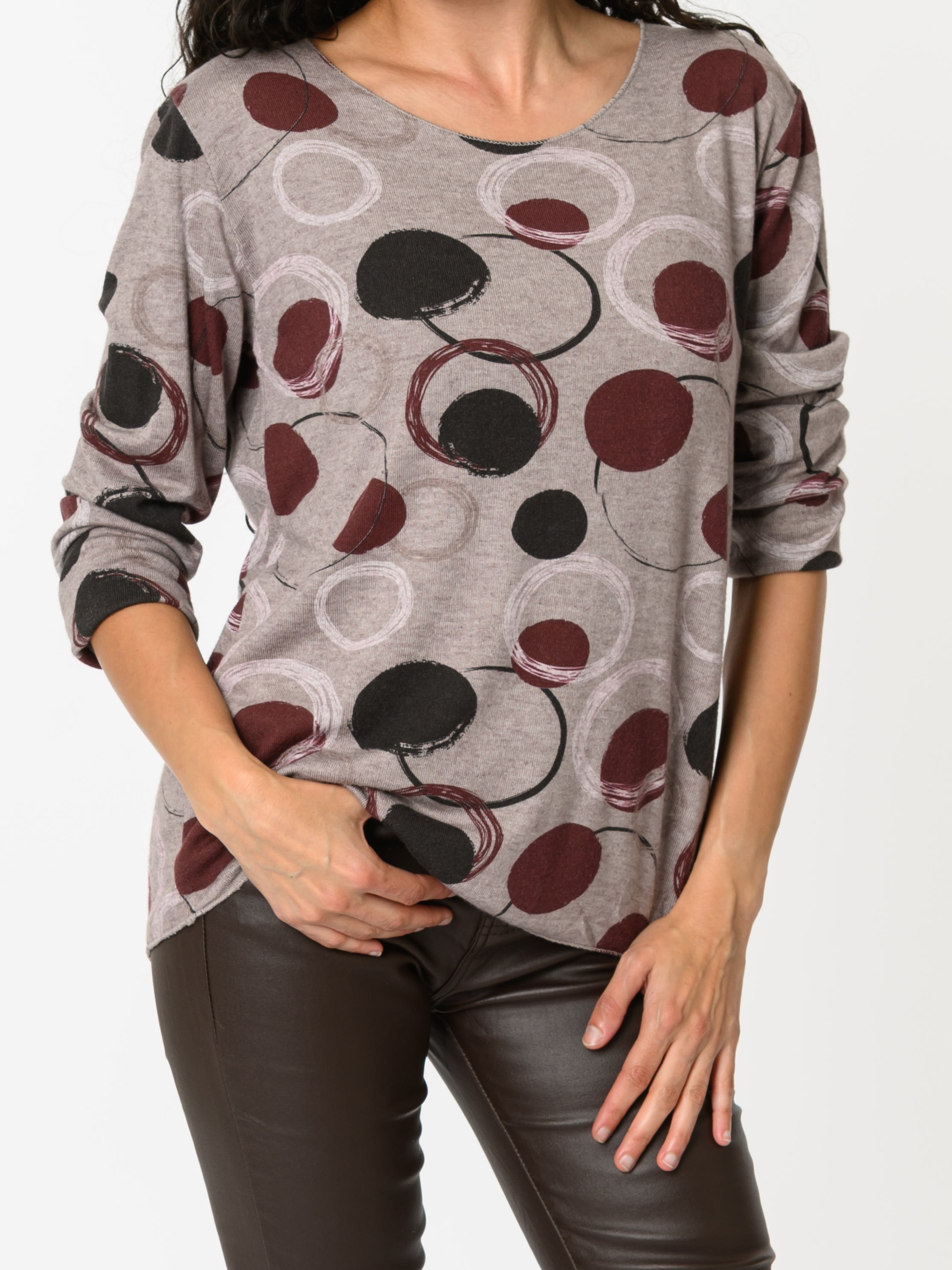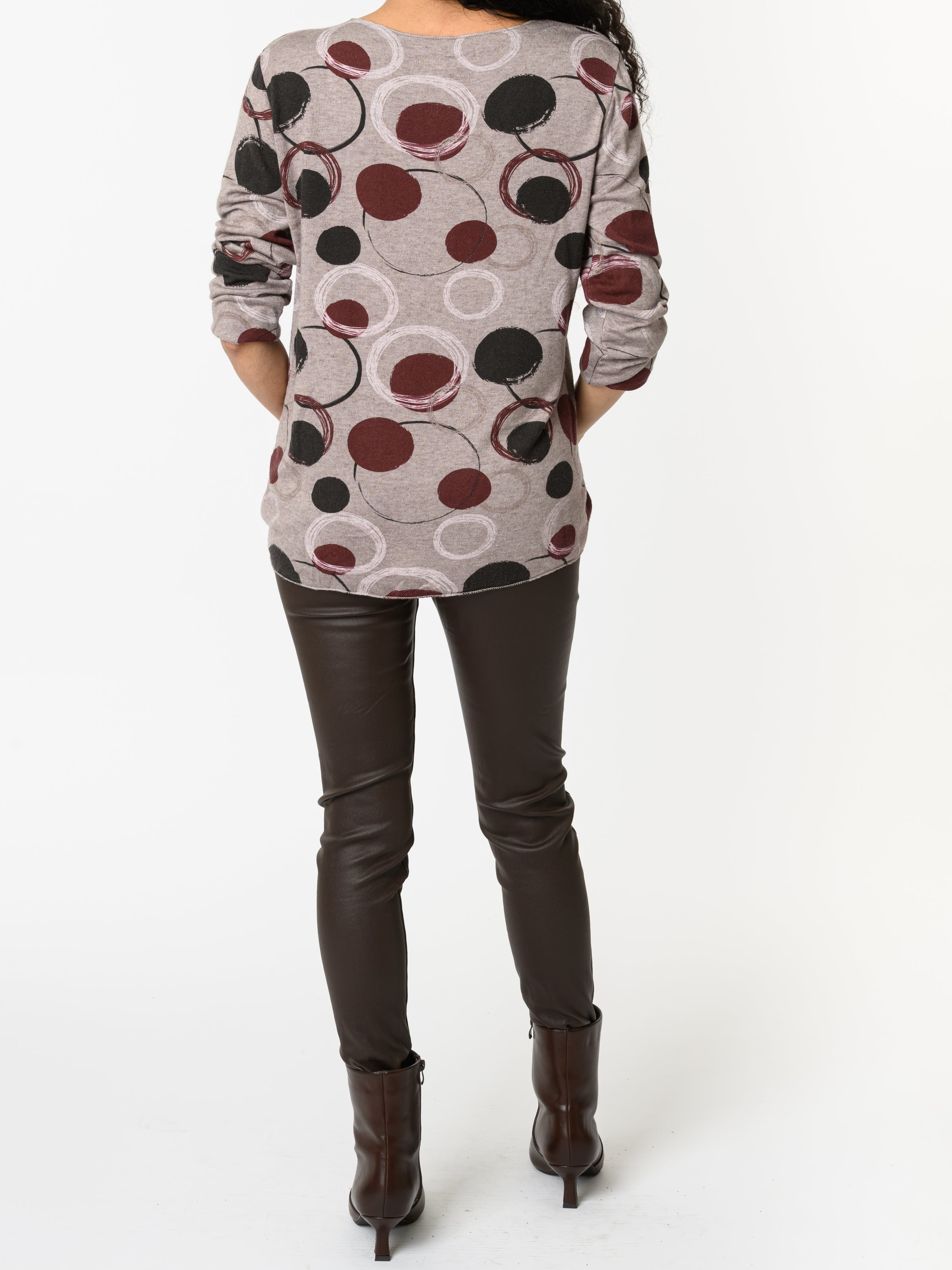 Découvrez notre chandail moka avec imprimé de cercles. Ce modèle à manches longues comporte un imprimé de cercles noirs, roses et bourgognes. Avec son design abstrait, cette pièce allie style décontracté et confort.