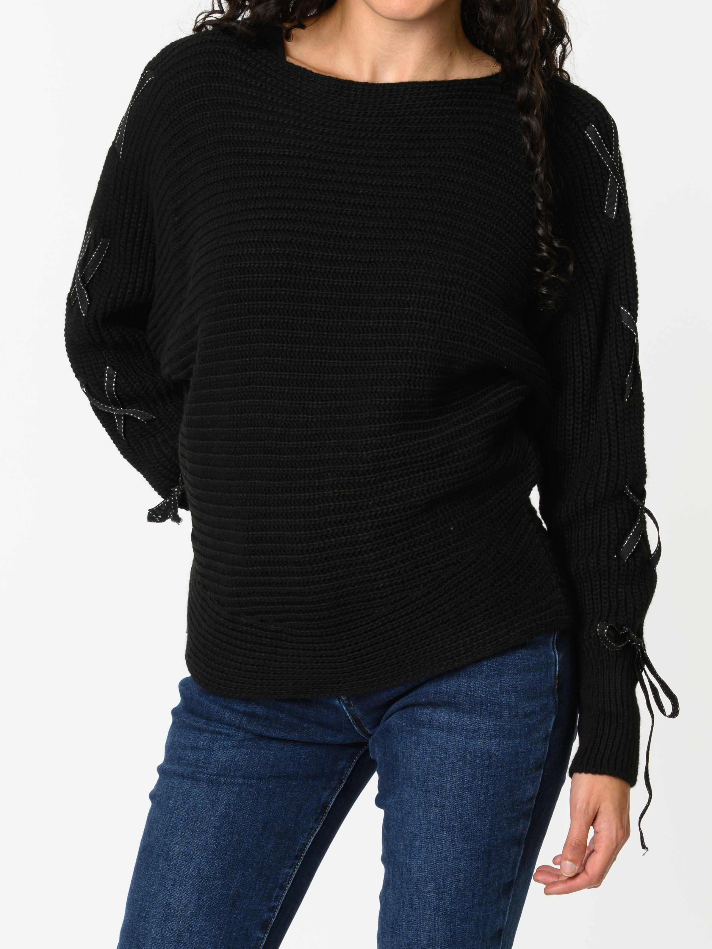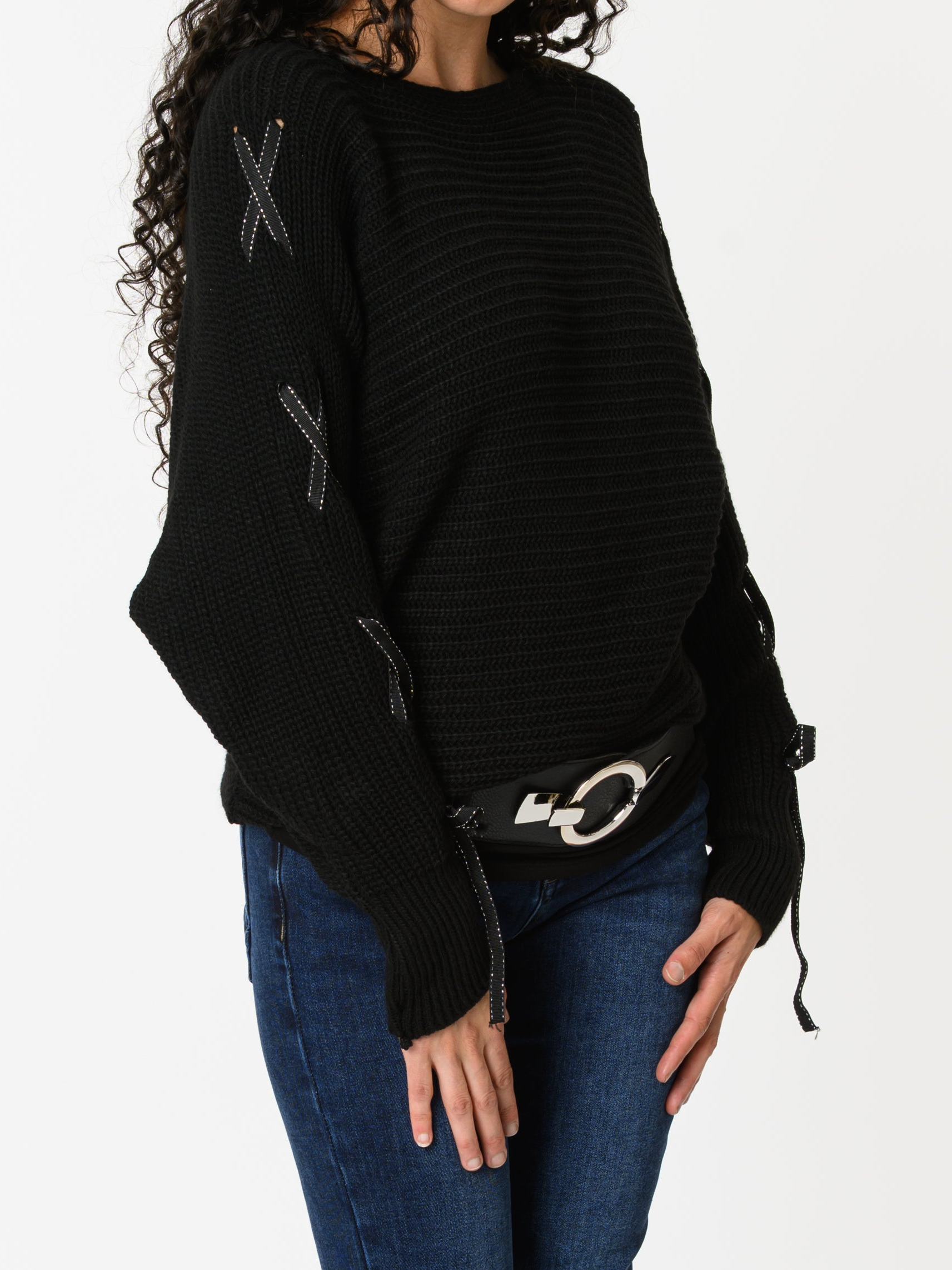 Découvrez notre chandail noir avec lacets sur les côtés. Ce modèle en tricot à manches longues est orné de lacets noirs et argent disposés en forme de X au niveau des manches. Il est idéal pour les journées froides et il allie style et confort.