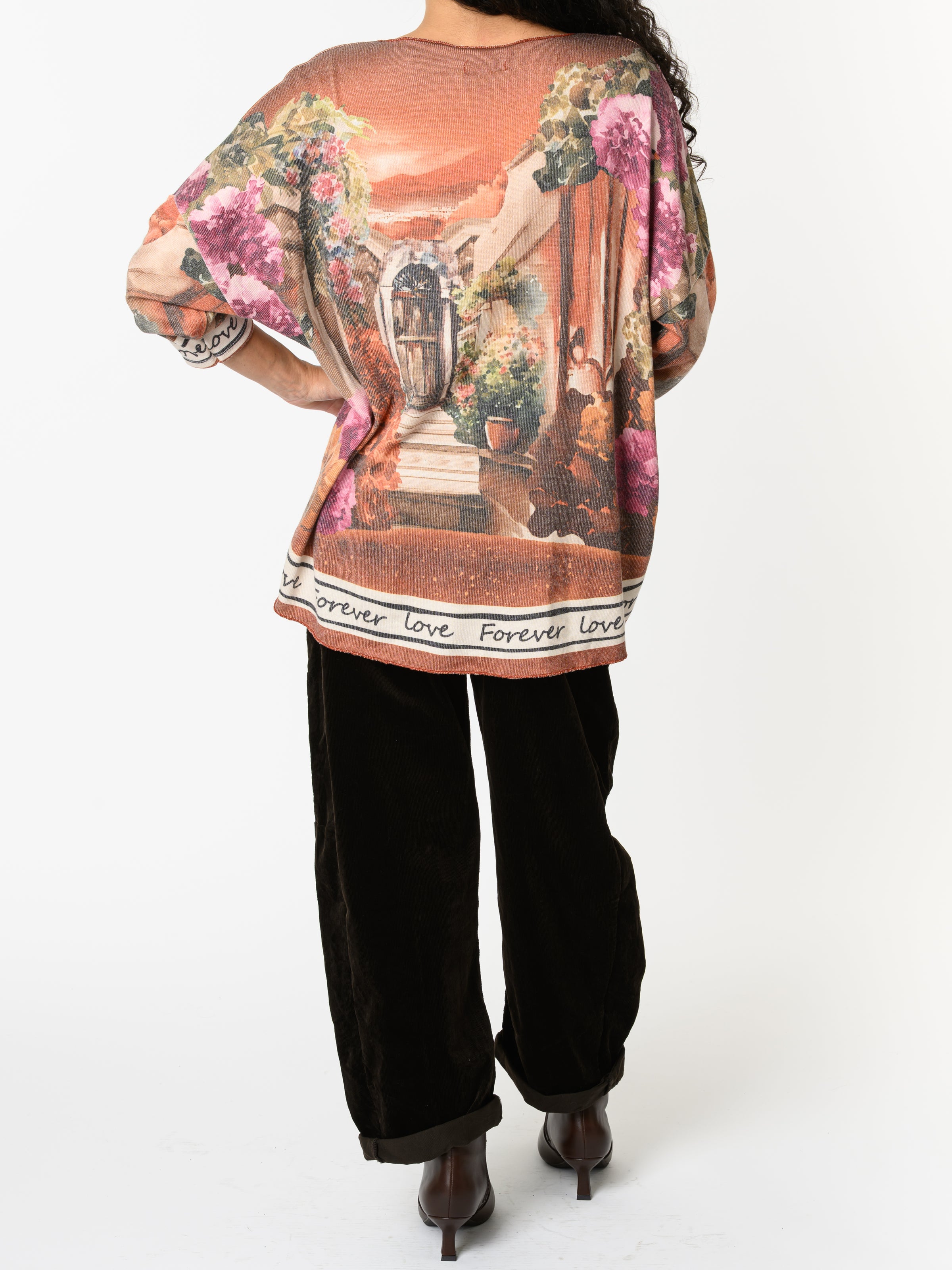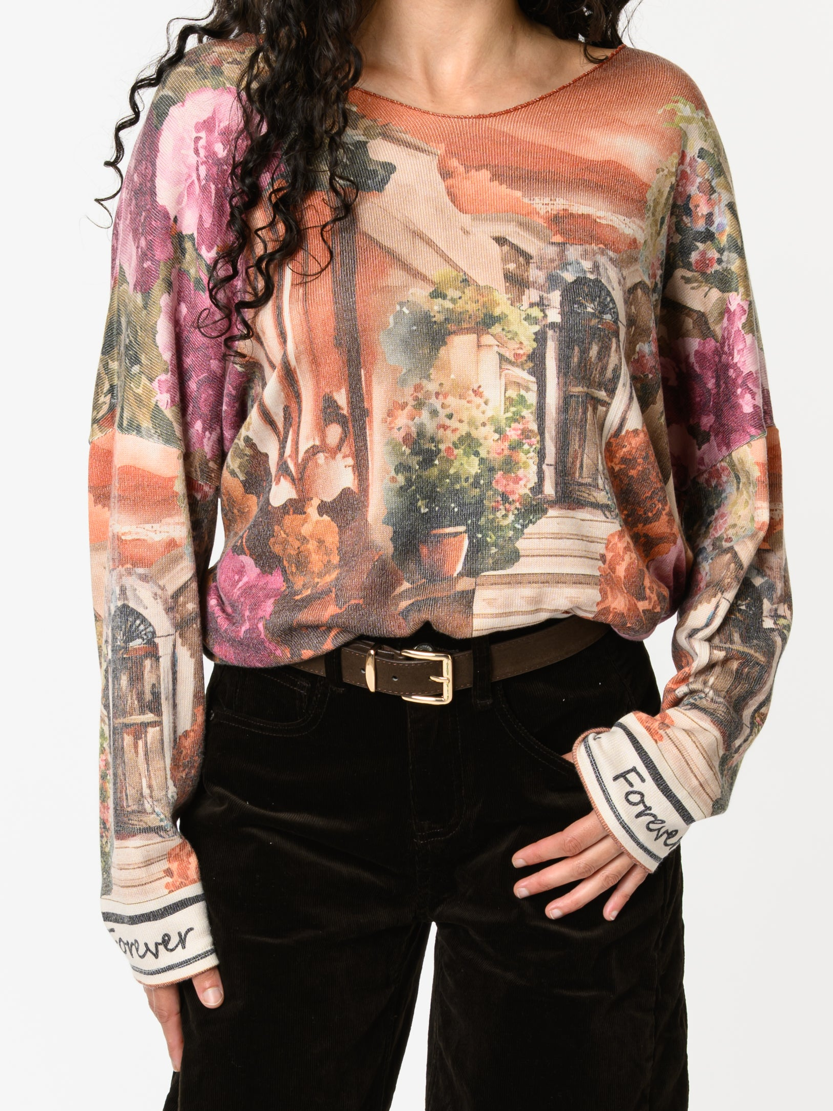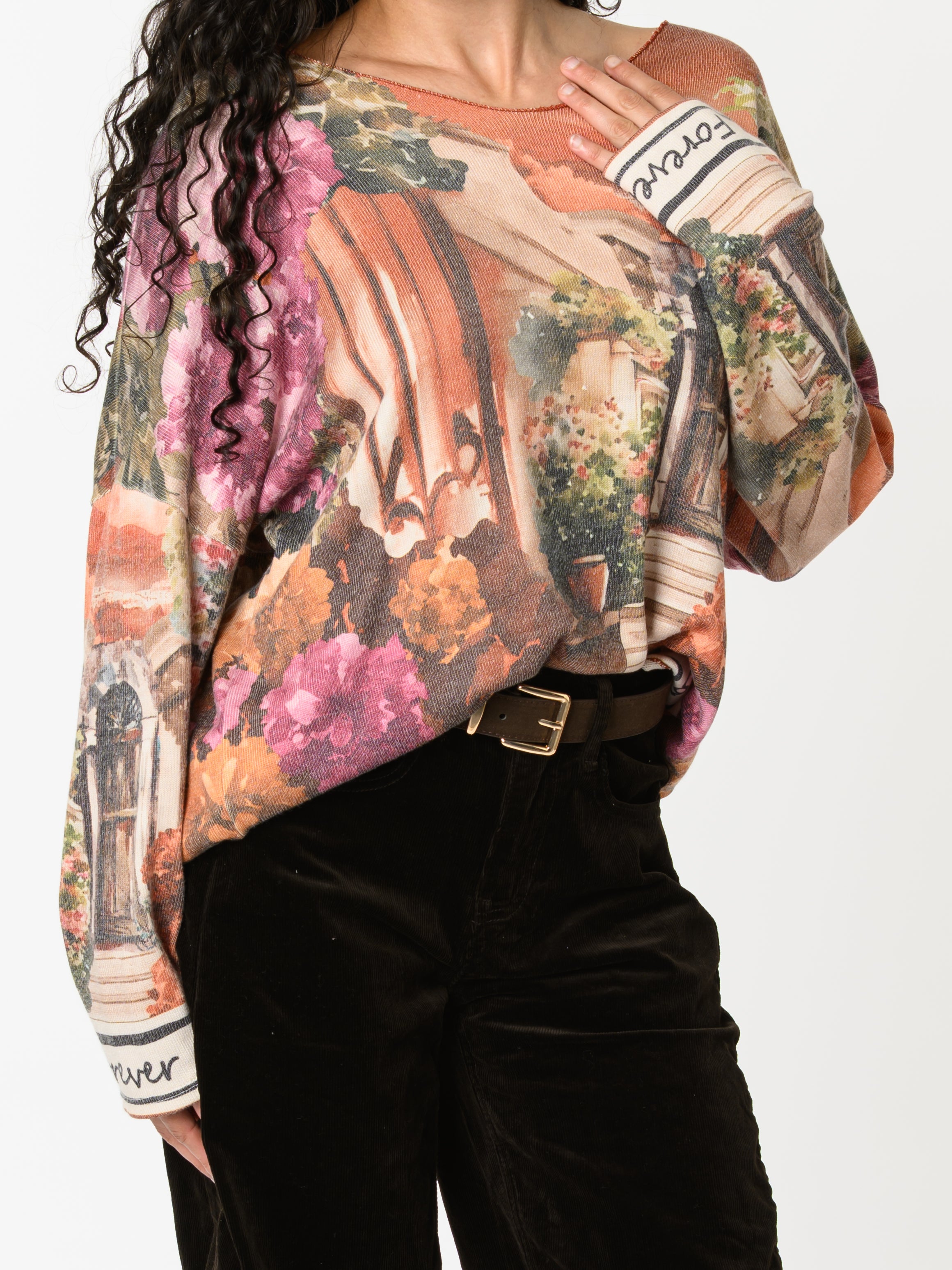 Découvrez notre chandail orange brique avec imprimé d'extérieur. Ce modèle à manches longues est orné d'un imprimé d'extérieur, ainsi que des fleurs. Avec son design coloré, cette pièce allie style et originalité.