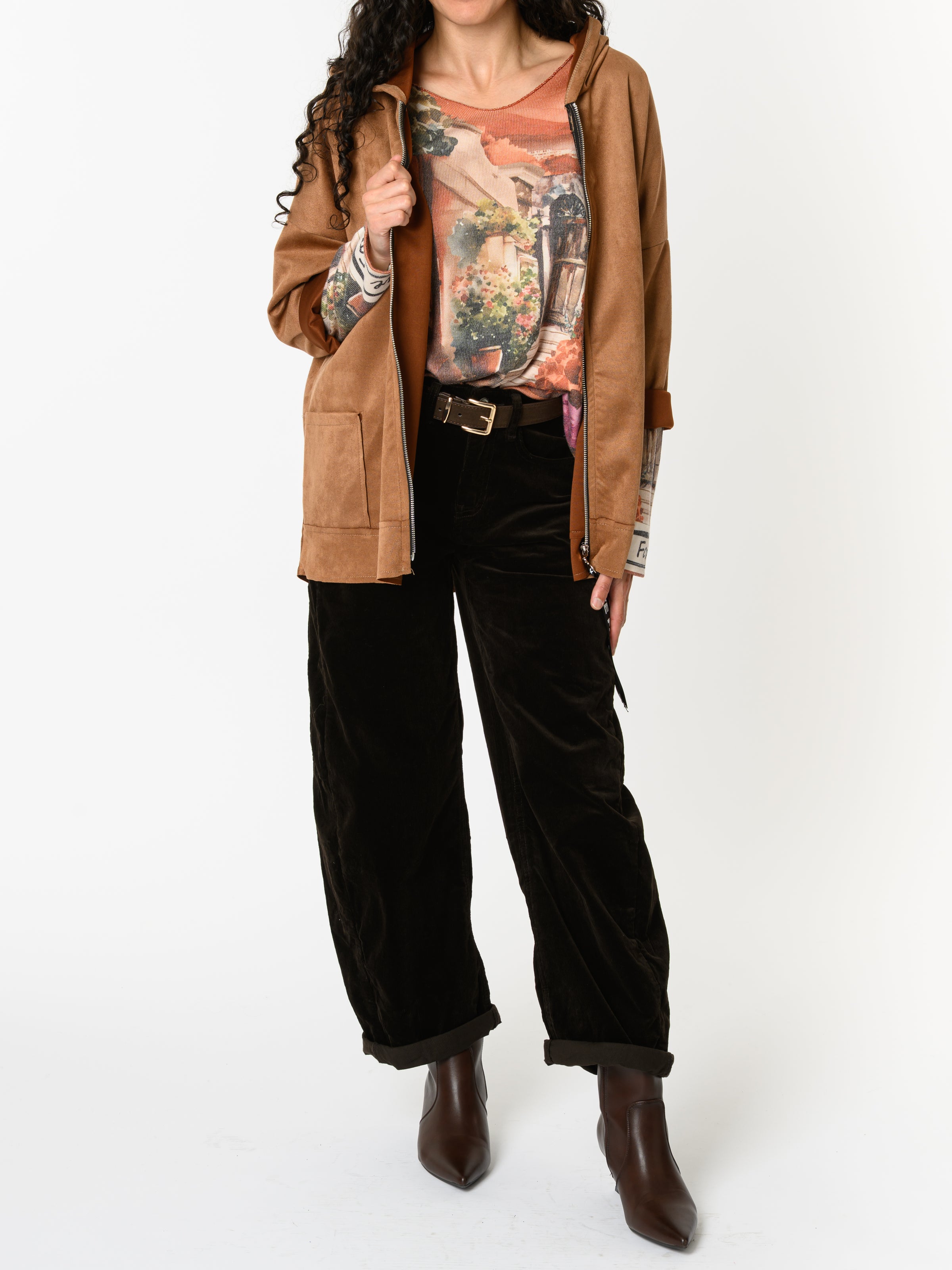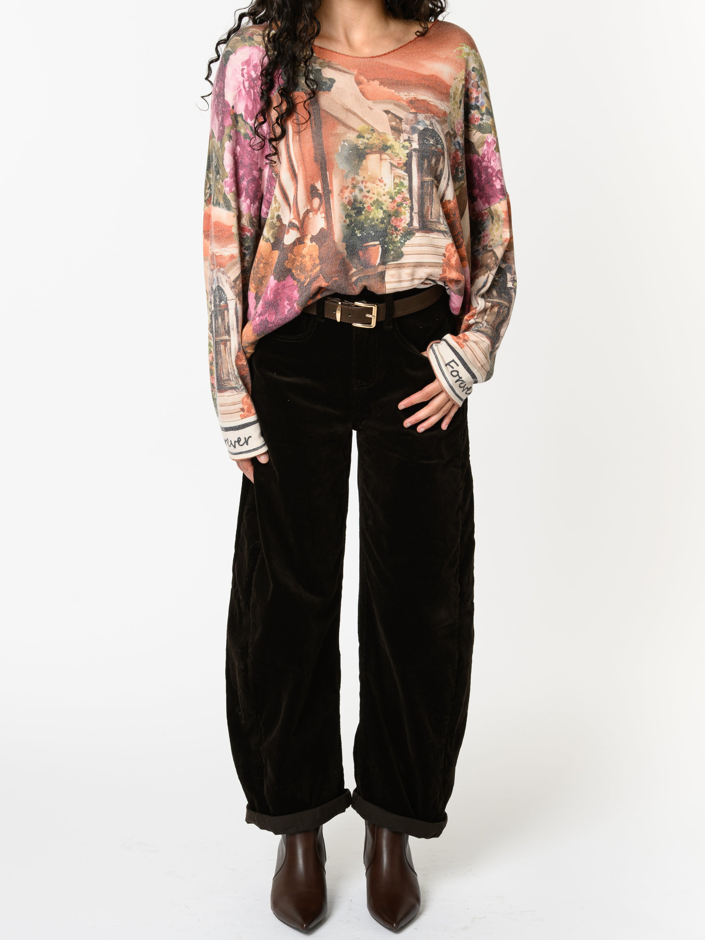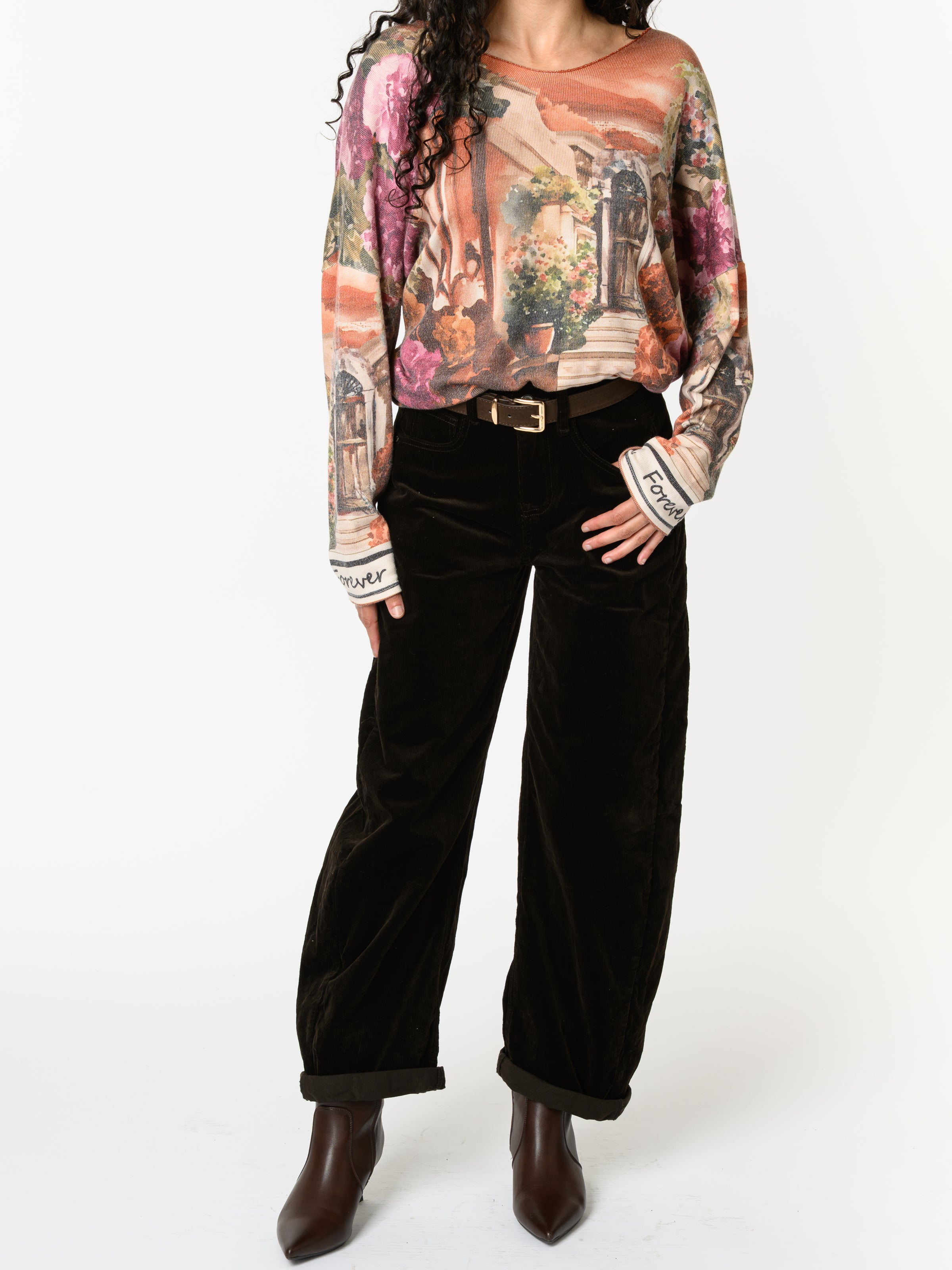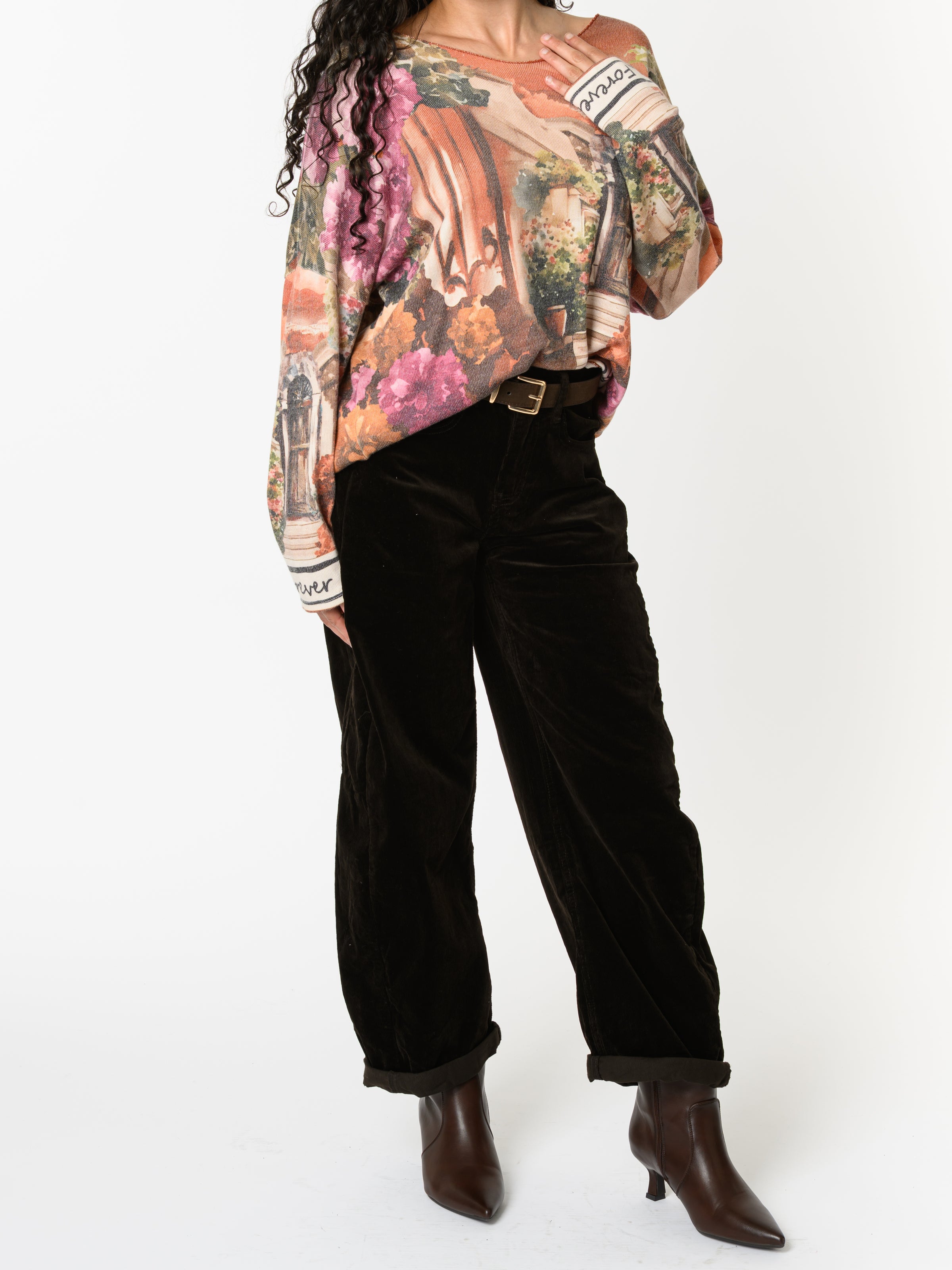 Découvrez notre chandail orange brique avec imprimé d'extérieur. Ce modèle à manches longues est orné d'un imprimé d'extérieur, ainsi que des fleurs. Avec son design coloré, cette pièce allie style et originalité.