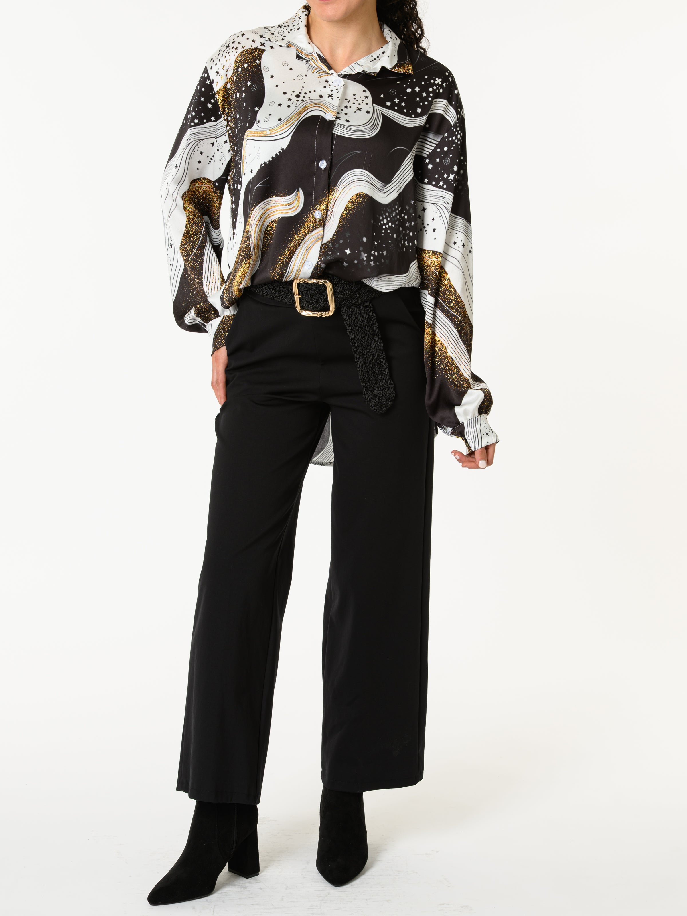 Découvrez notre chemise blanc et noir avec imprimé d'étoiles et galaxie. Ce modèle à manches longues comporte un imprimé d'une galaxie abstraite avec des étoiles. Le tout des couleurs contrastantes, comme le noir, le blanc et le jaune. Cette pièce allie style original et élégance.