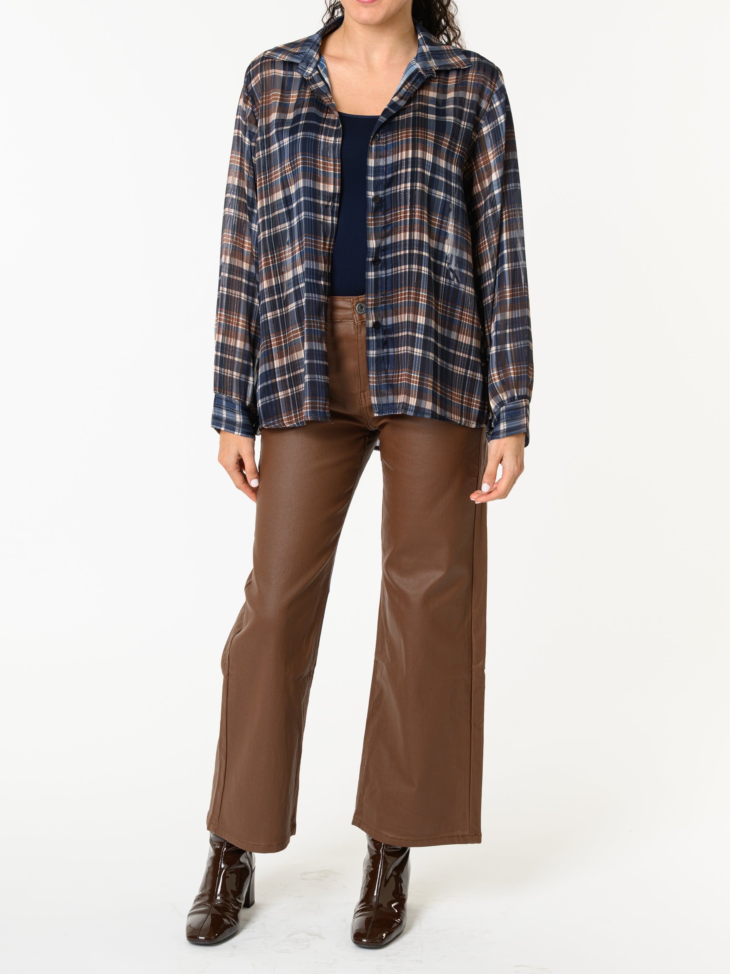 Découvrez notre chemise bleue à carreaux bruns et beiges. Ce modèle à manches longues est orné de motifs de carreaux bruns et beiges, ainsi que d'une brillance argentée subtile. Cette pièce allie style et tendance.