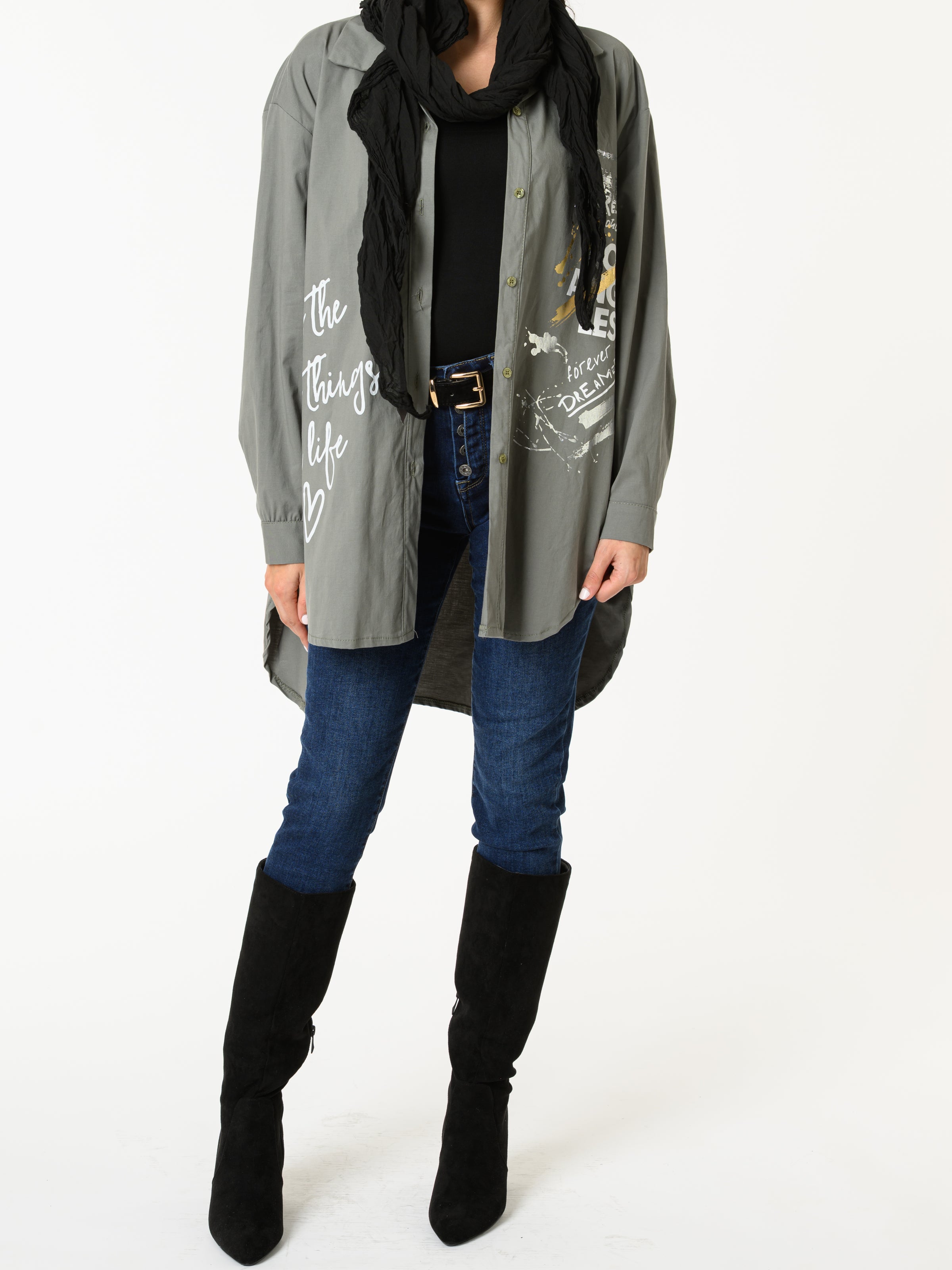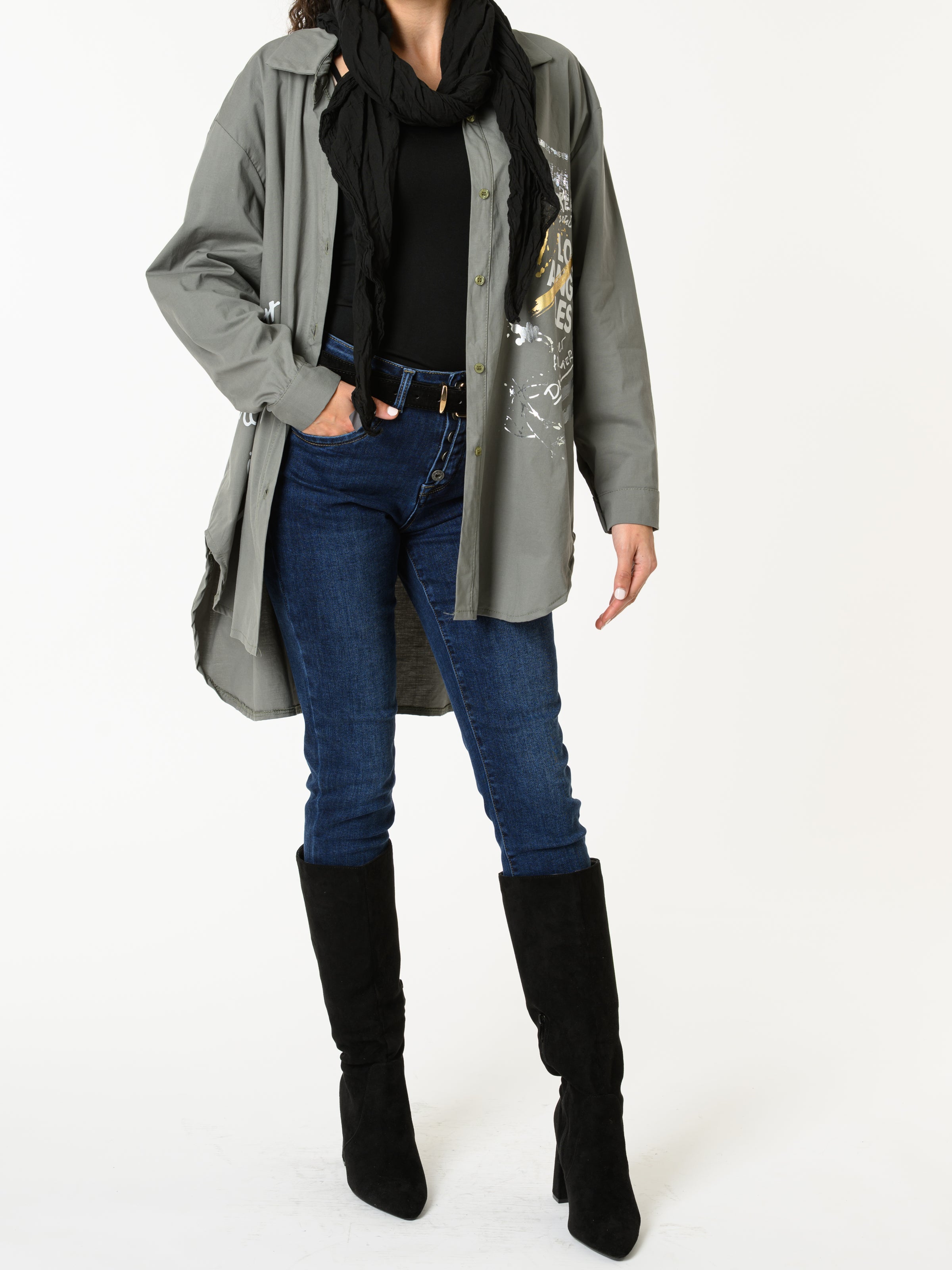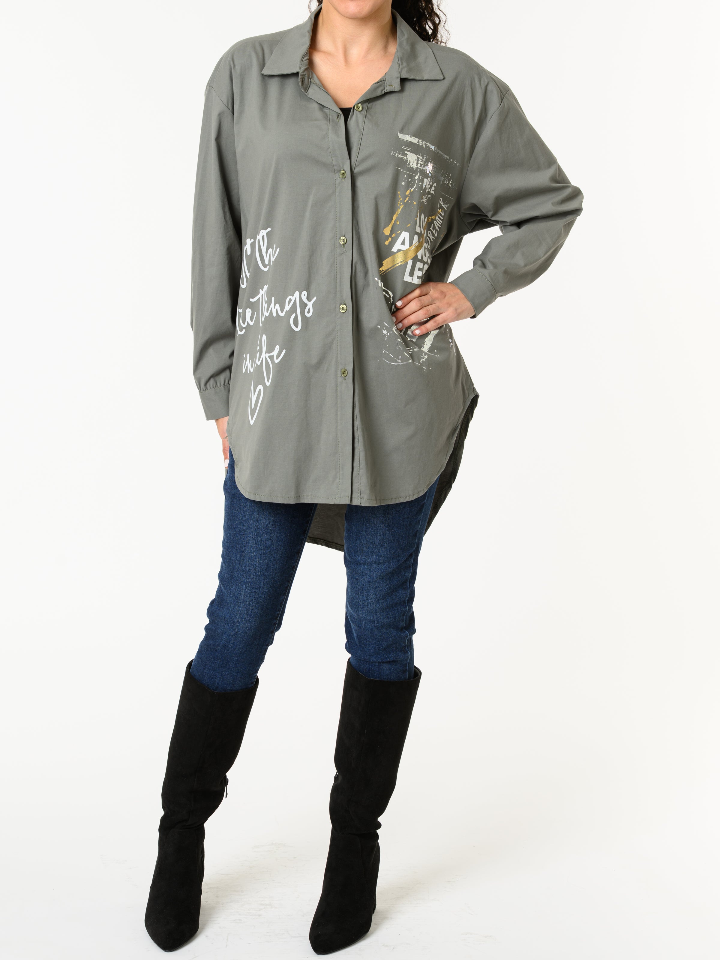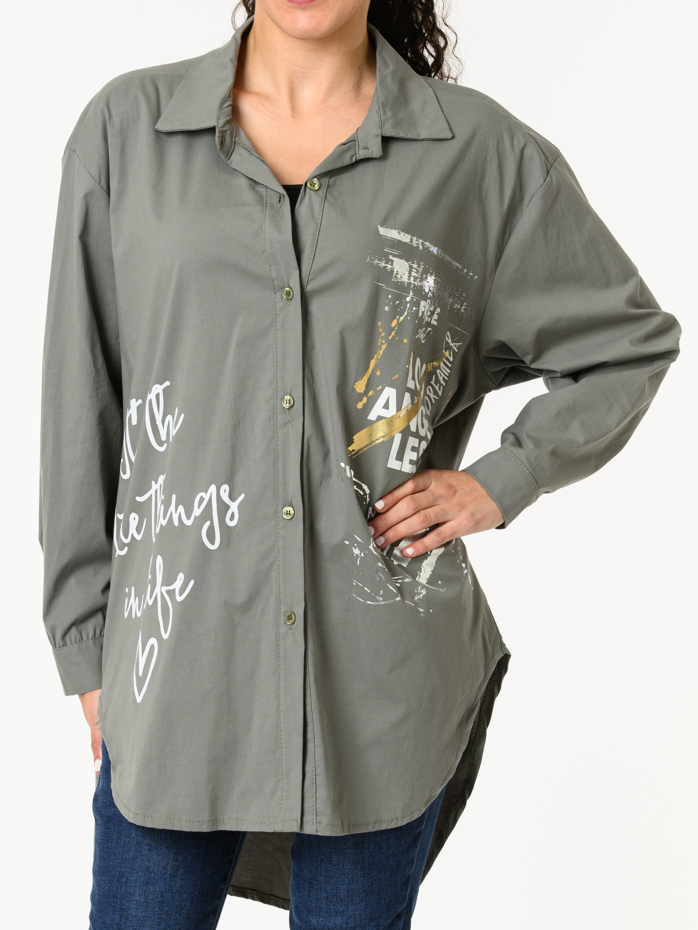 Découvrez notre chemise kaki avec imprimé d'écritures blanches. Ce modèle à manches longues est orné d'un imprimé d'écritures blanches, ainsi que des touches dorées et argentées. Cette pièce allie style décontracté et tendance.