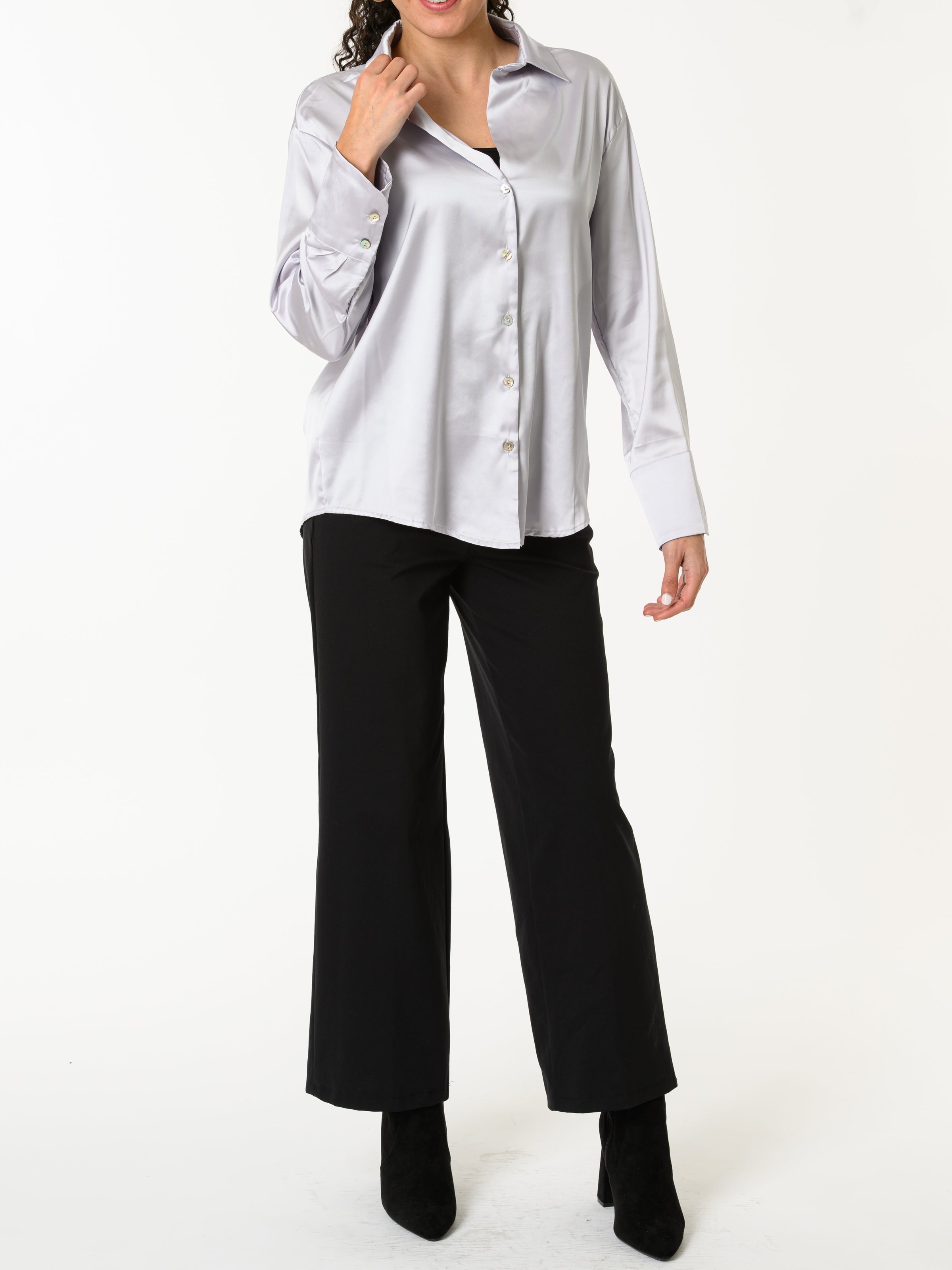 Découvrez notre chemise satinée grise à manche longue. Ce modèle de couleur unie comporte une texture satinée, ce qui apporte une touche d'élégance. Cette pièce allie style chic et tendance.