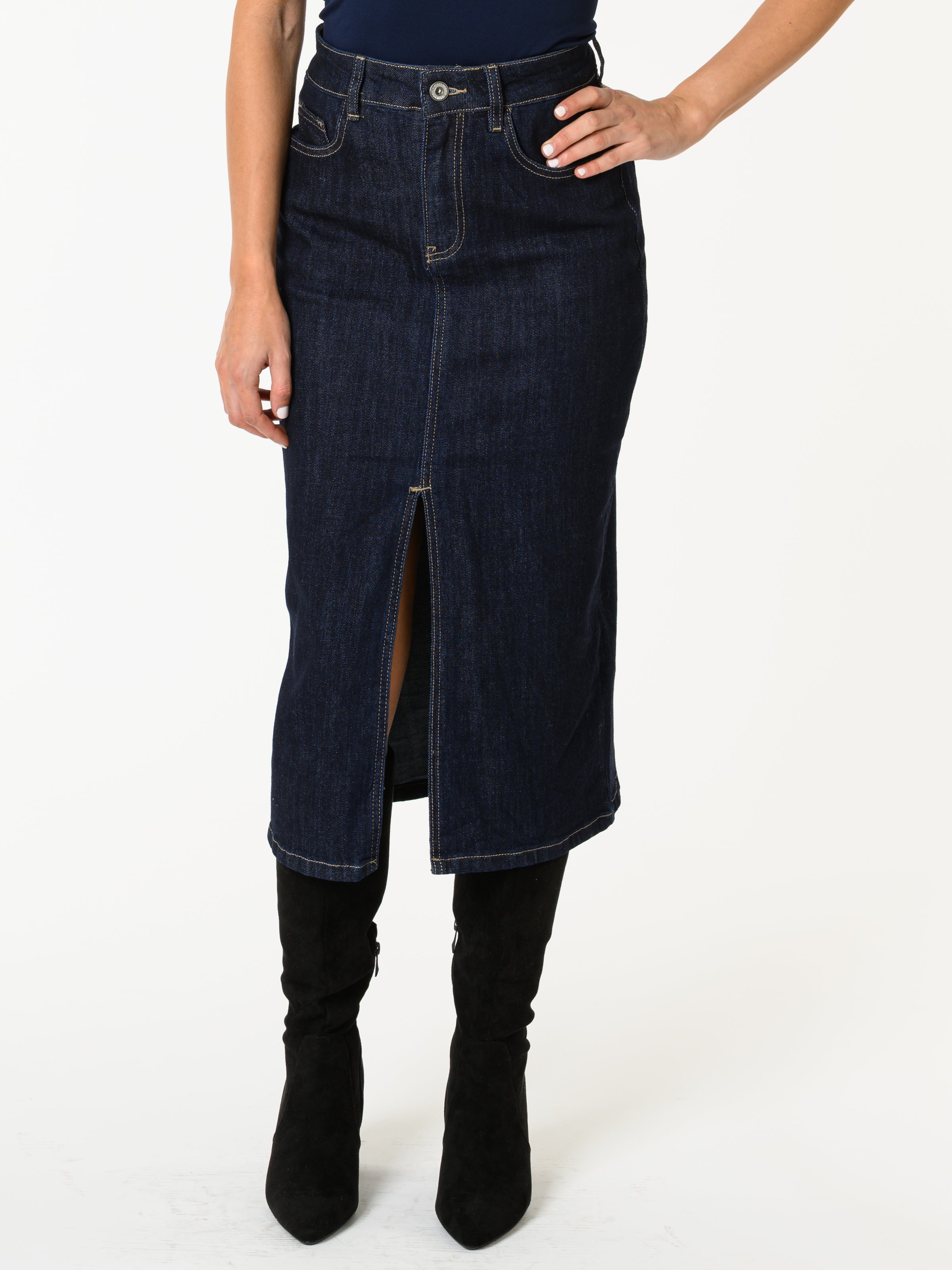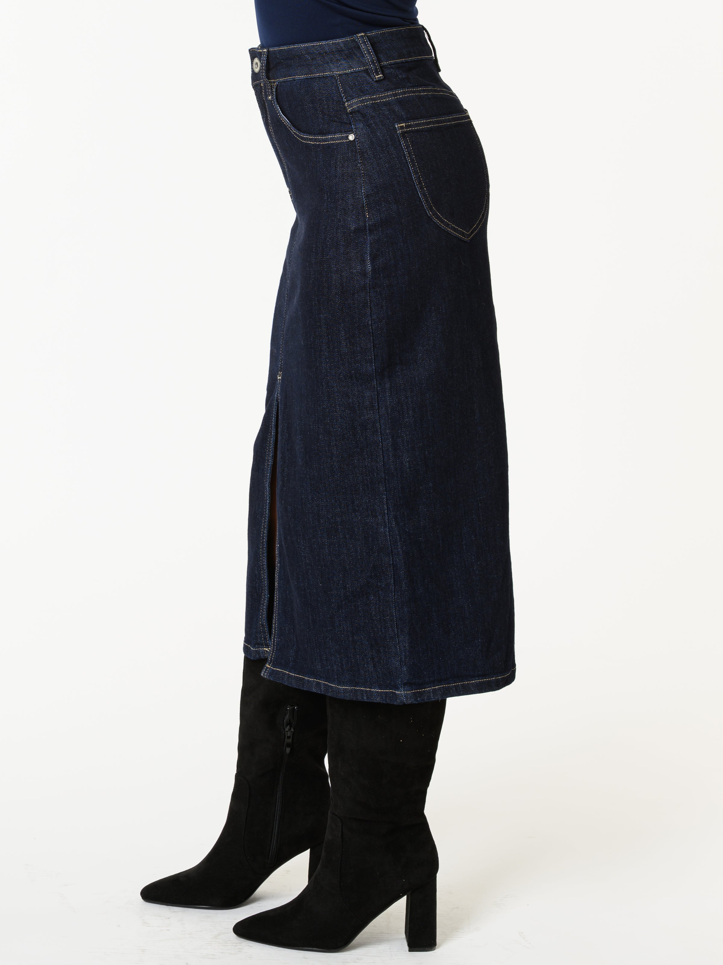 Découvrez notre jupe de jeans fendue en avant. Cette jupe de couleur bleu foncé comporte de poches pratiques en arrière en an avant. Avec sa coupe classique, ce modèle allie style et tendance. Elle fait environ 30 pouces de long.
