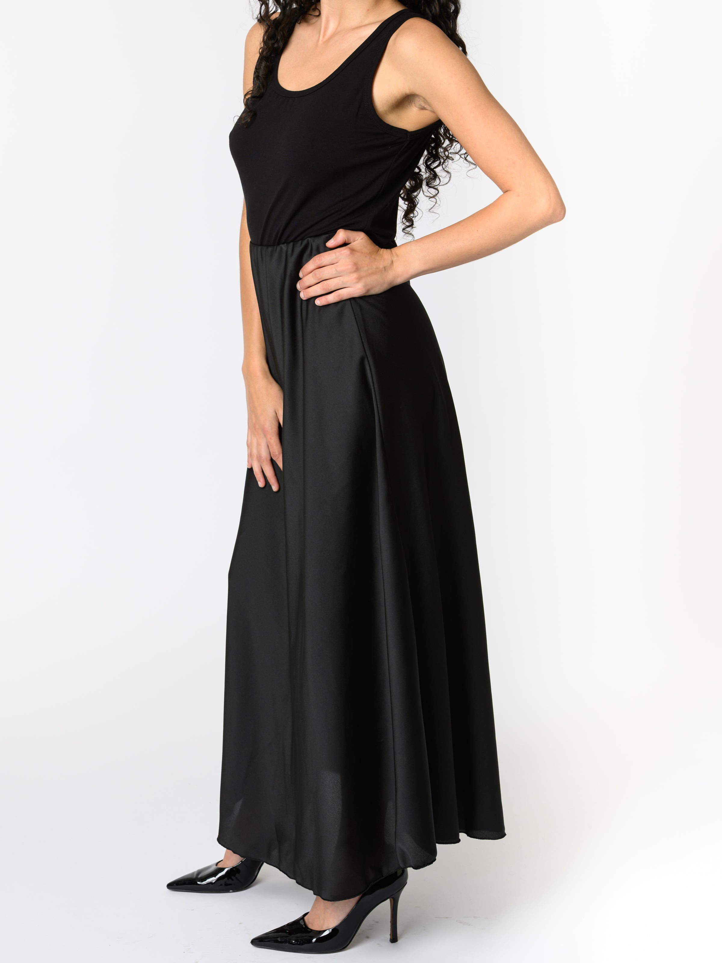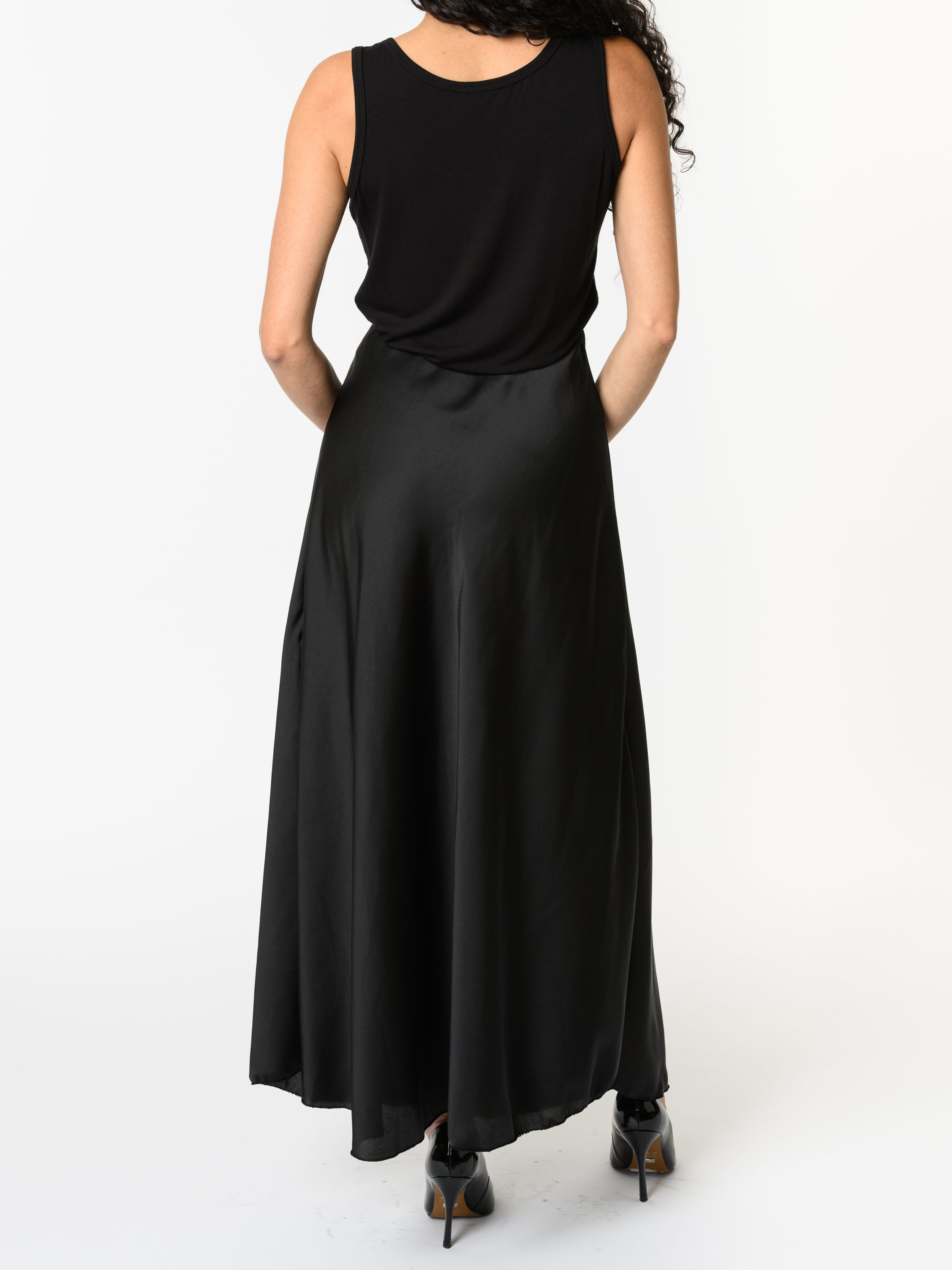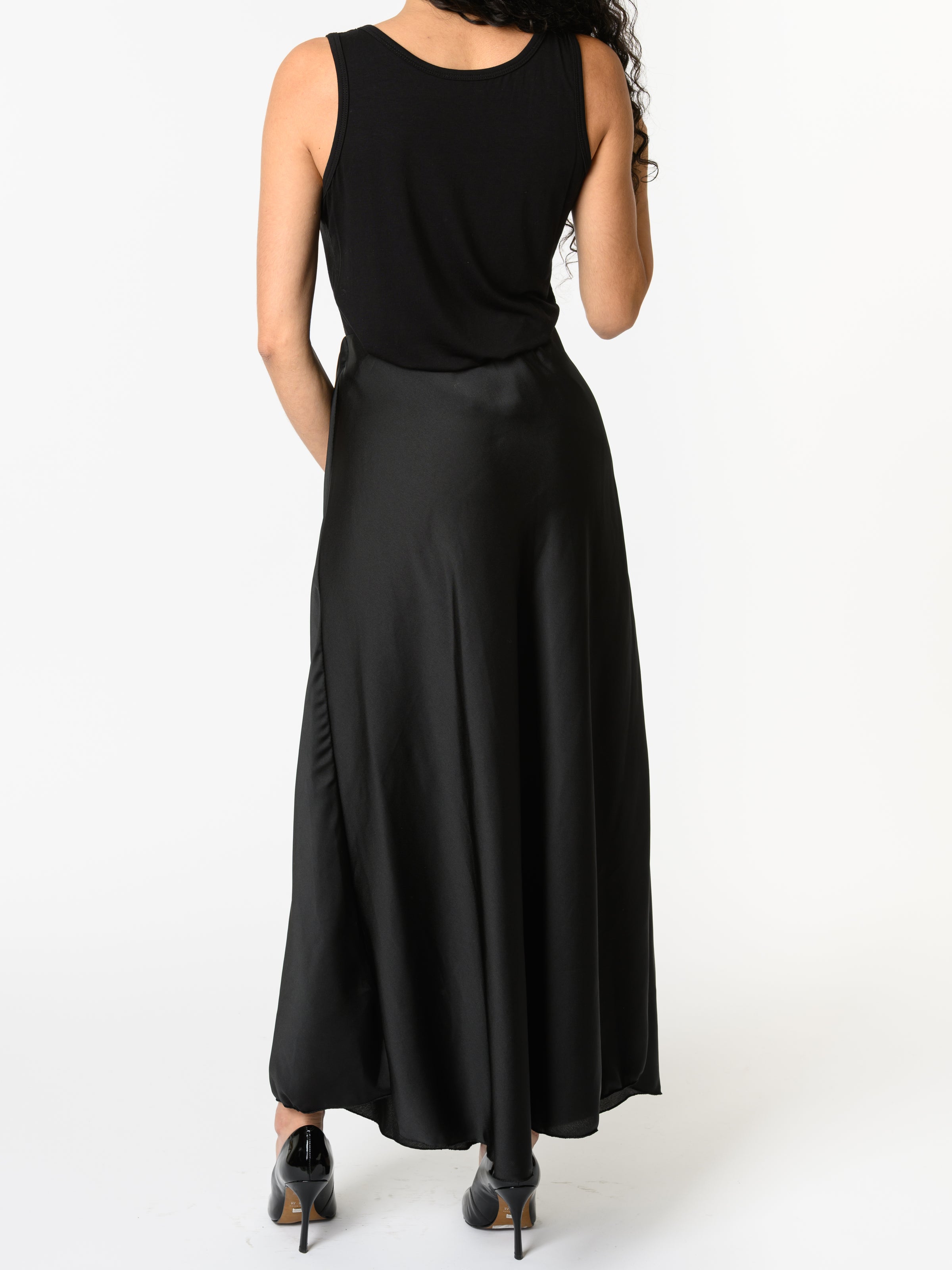 Découvrez notre jupe satinée noire. Cette jupe a une taille élastique qui s'ajuste à la silhouette. Avec sa texture lisse et sa couleur unie, cette pièce apporte une touche féminine et délicate. Elle fait environ 38 pouces de long et elle allie style sophistiqué et tendance.