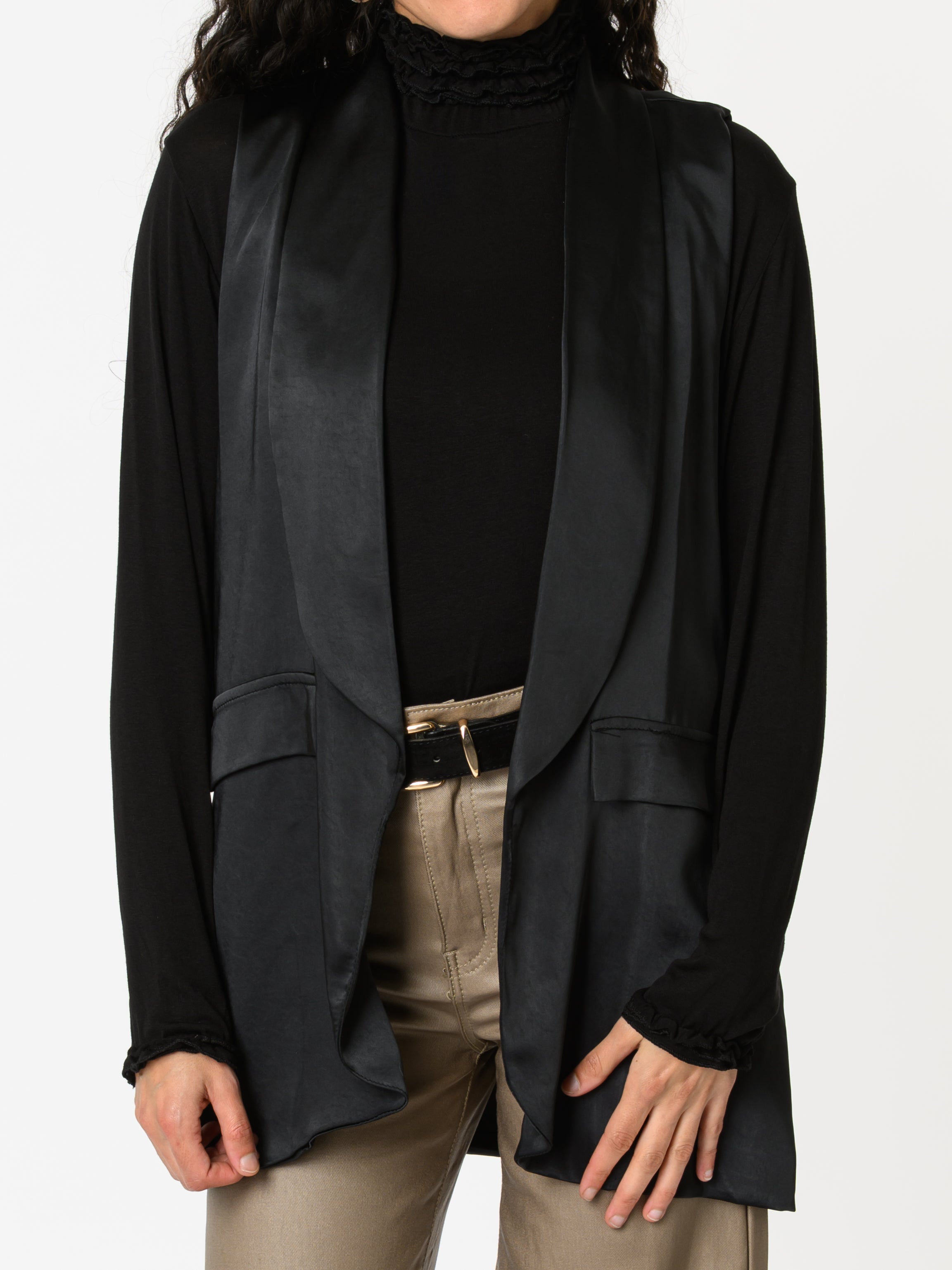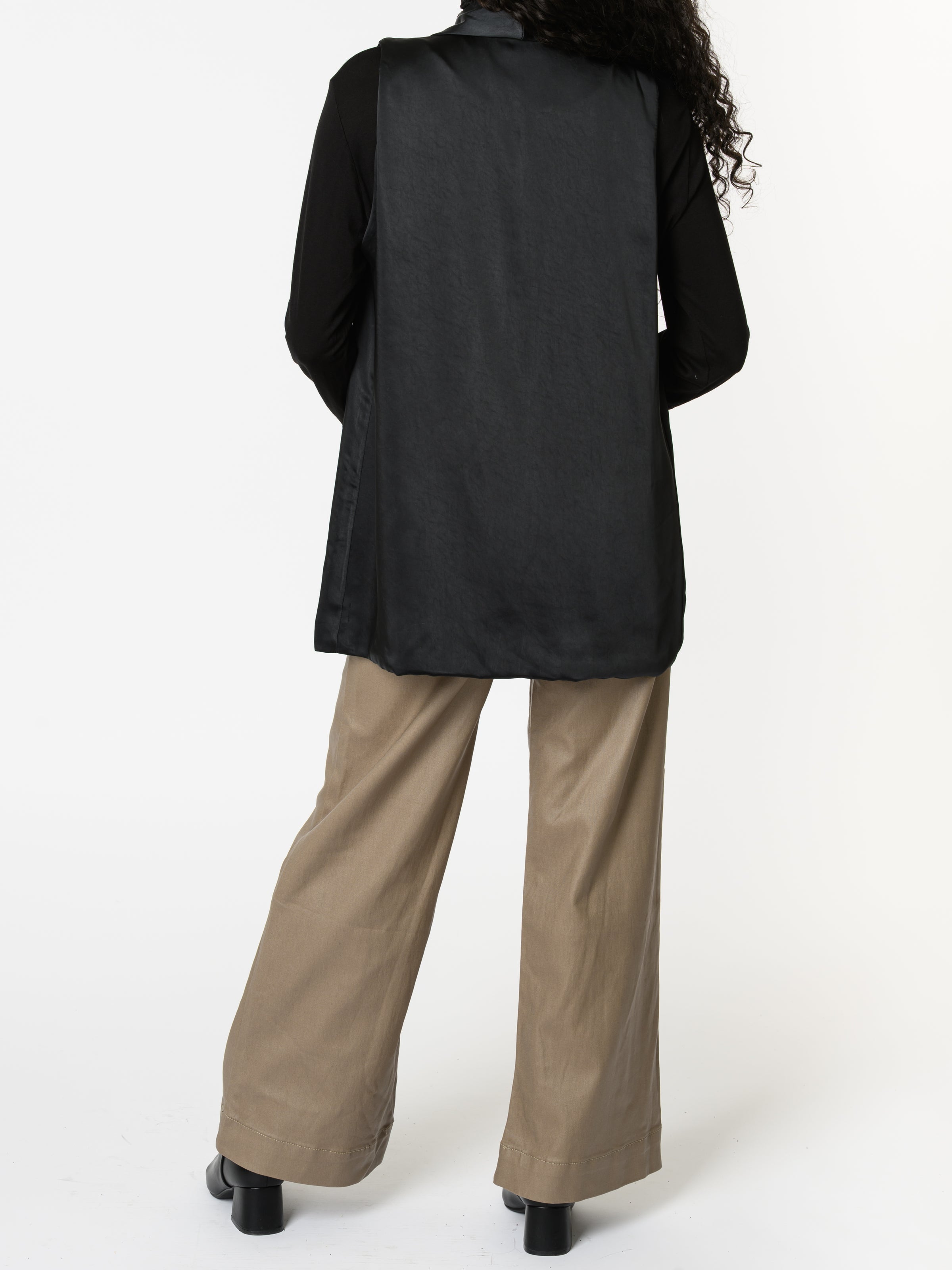 Découvrez notre vest noire en satin. Cette veste sans manches comporte deux poches décoratives en avant. Avec sa texture satinée, ce modèle apporte une touche chic aux looks. Cette pièce allie style et tendance.