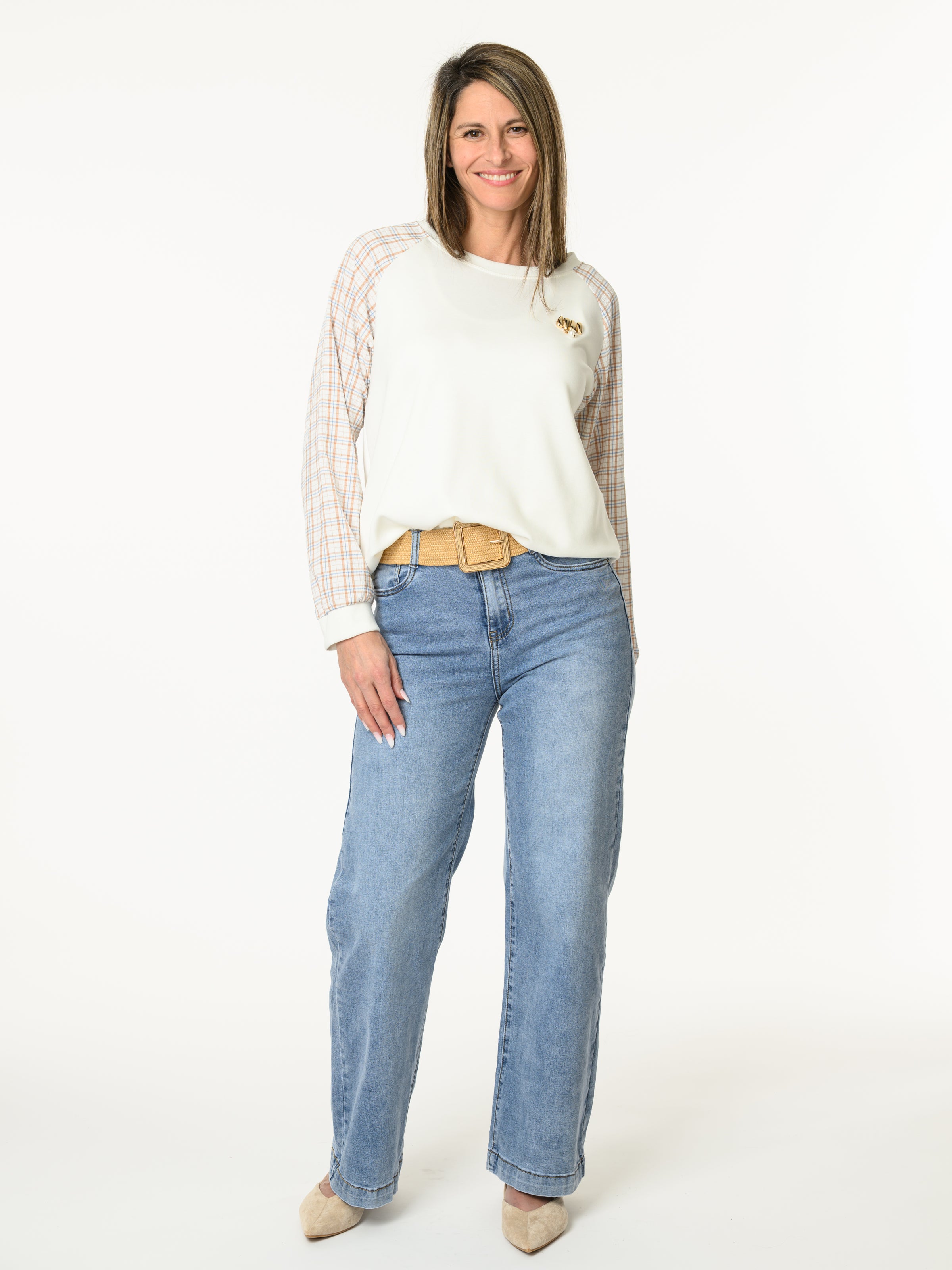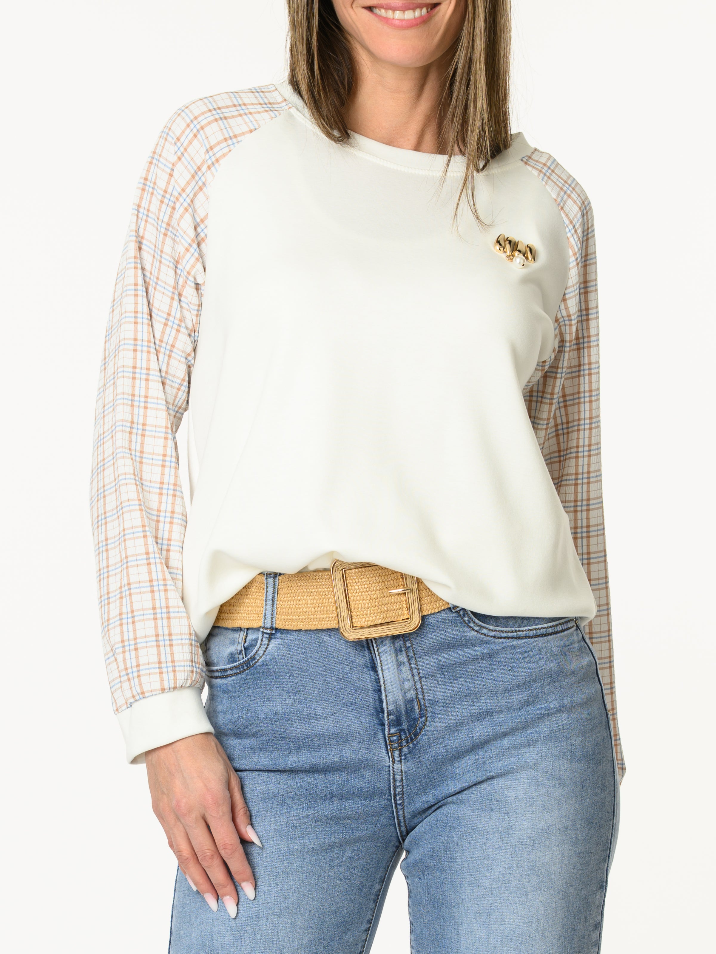 Découvrez notre chandail blanc crème avec manches à motifs de carreaux. Ce chandail à manches longues est orné de motifs de carreaux beiges, bleus et blancs. Il possède aussi une pince décorative dorée avec une perle blanche. Cette pièce allie style et confort.