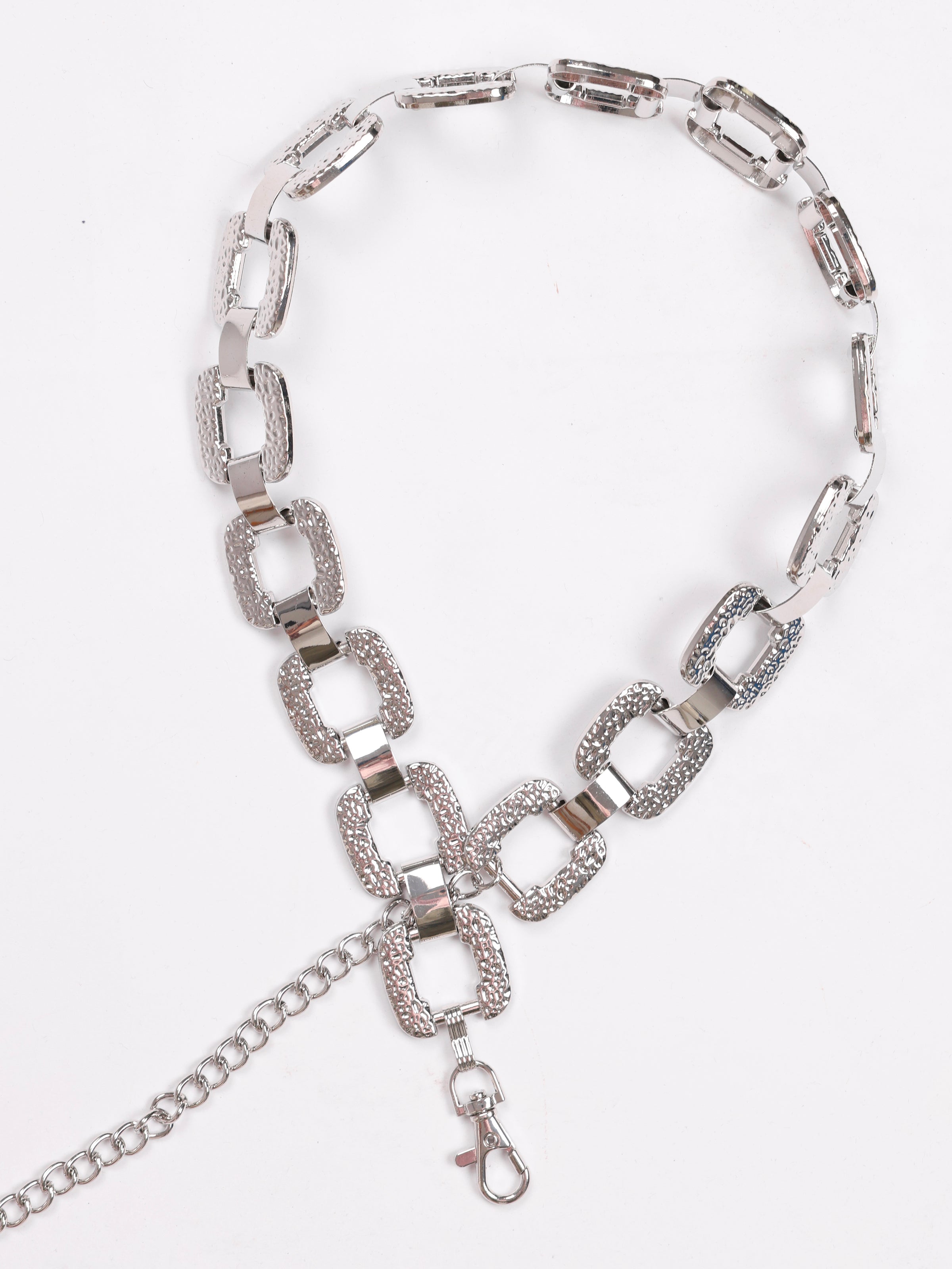 Découvrez notre ceinture argent en chaîne. Dotée de grands carreaux argentés texturés, cette ceinture crée un effet élégant et moderne. Ce modèle comporte une chaîne, ainsi qu'une fermeture ajustable pour s'adapter à la taille.  Elle habille les silhouettes 1-2-3.