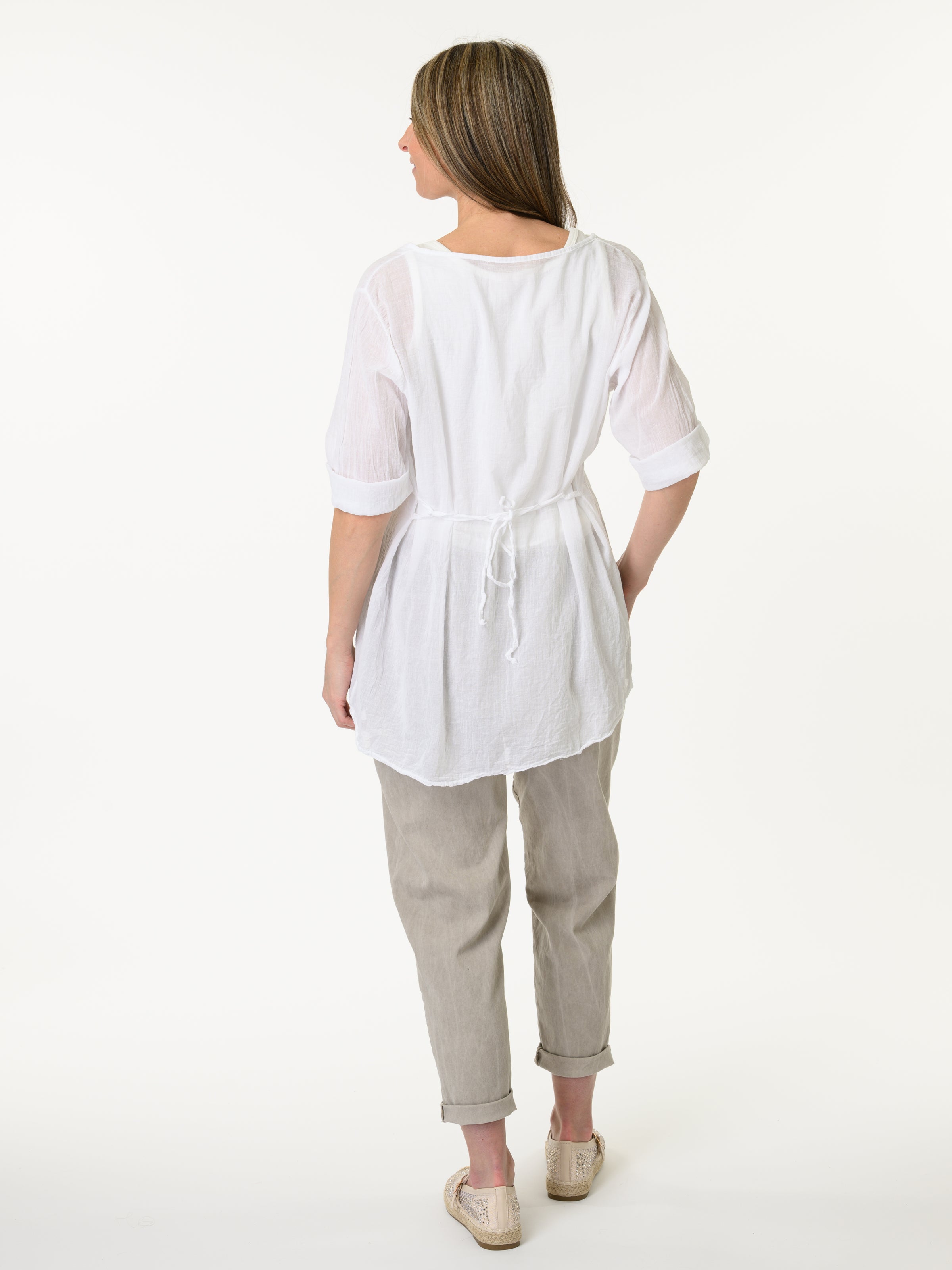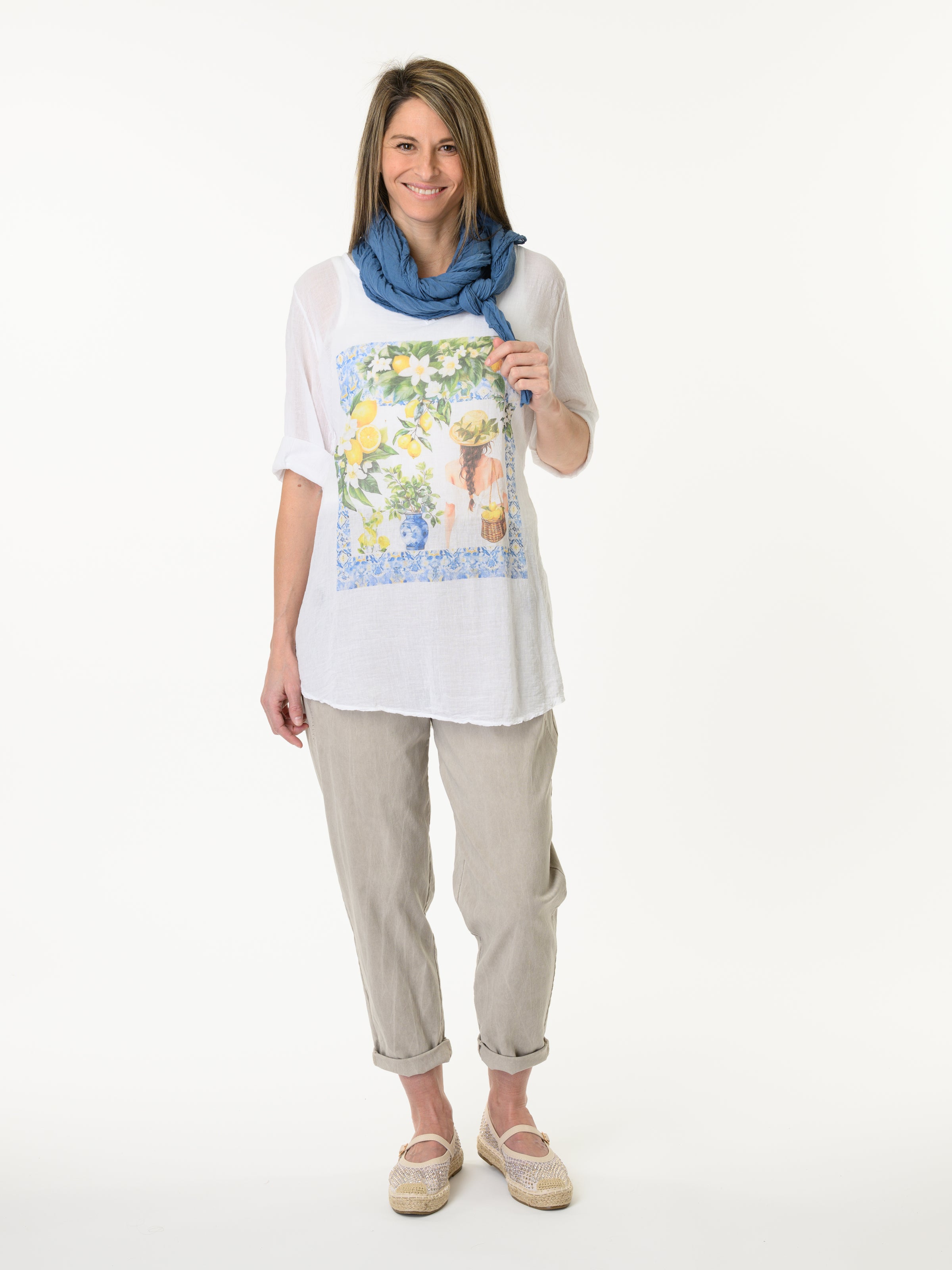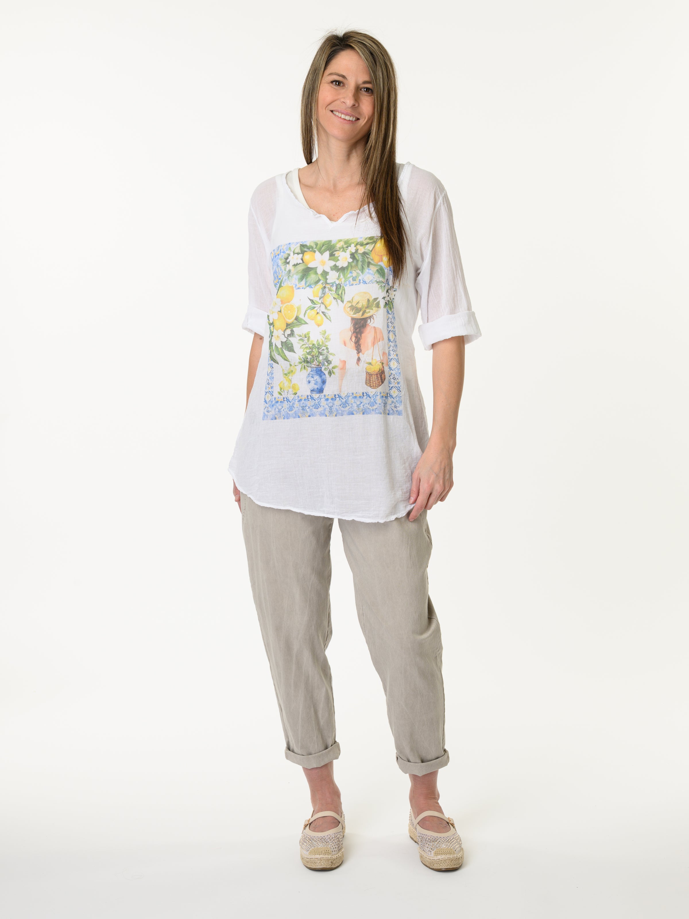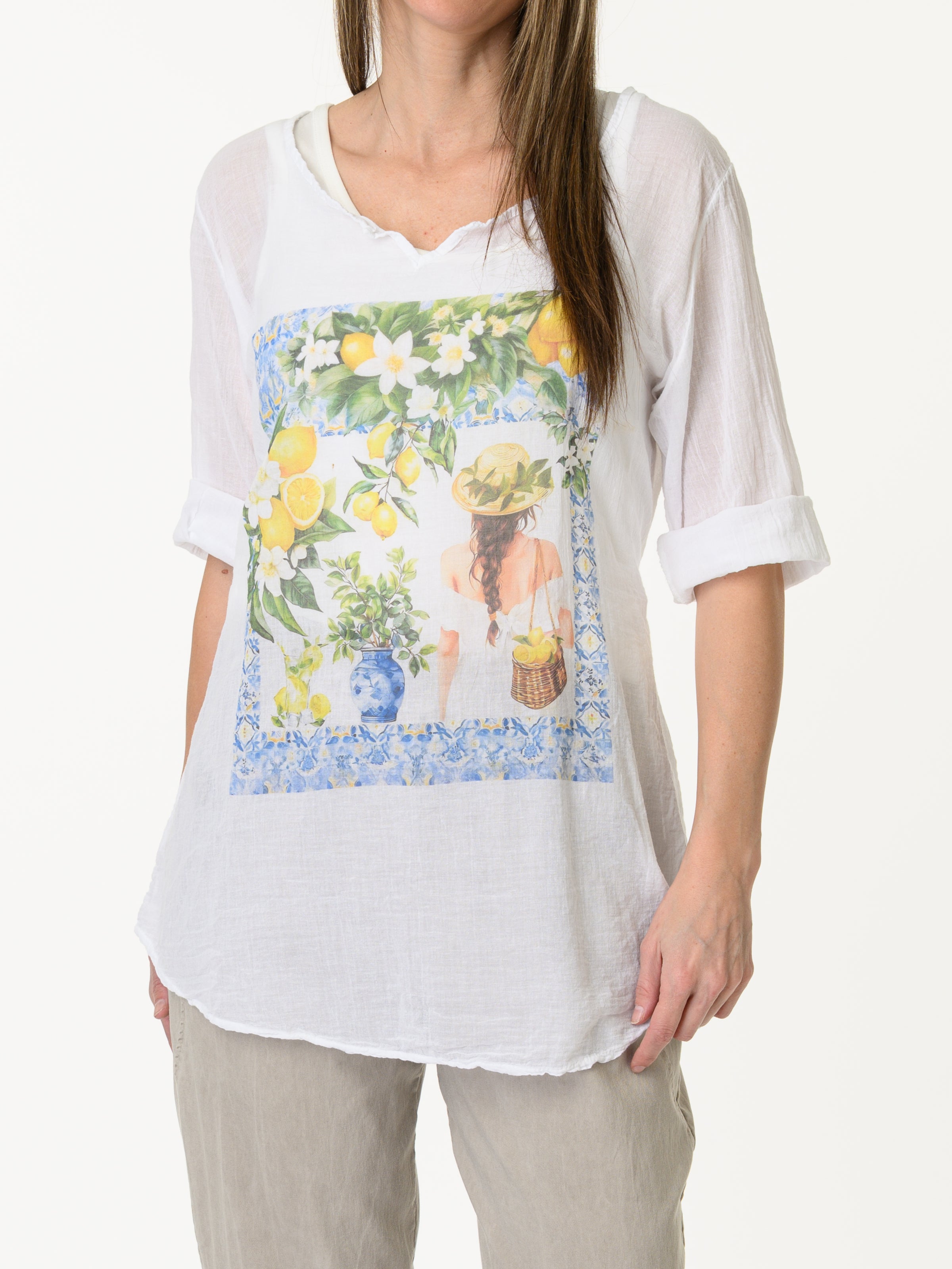 Découvrez notre chandail blanc avec imprimé de citrons et de feuilles. Ce modèle à manches 3/4 est orné d'un imprimé de citrons jaunes et de feuillage vert. Il comporte également un imprimé d'une femme de dos. Cette pièce allie style et tendance.