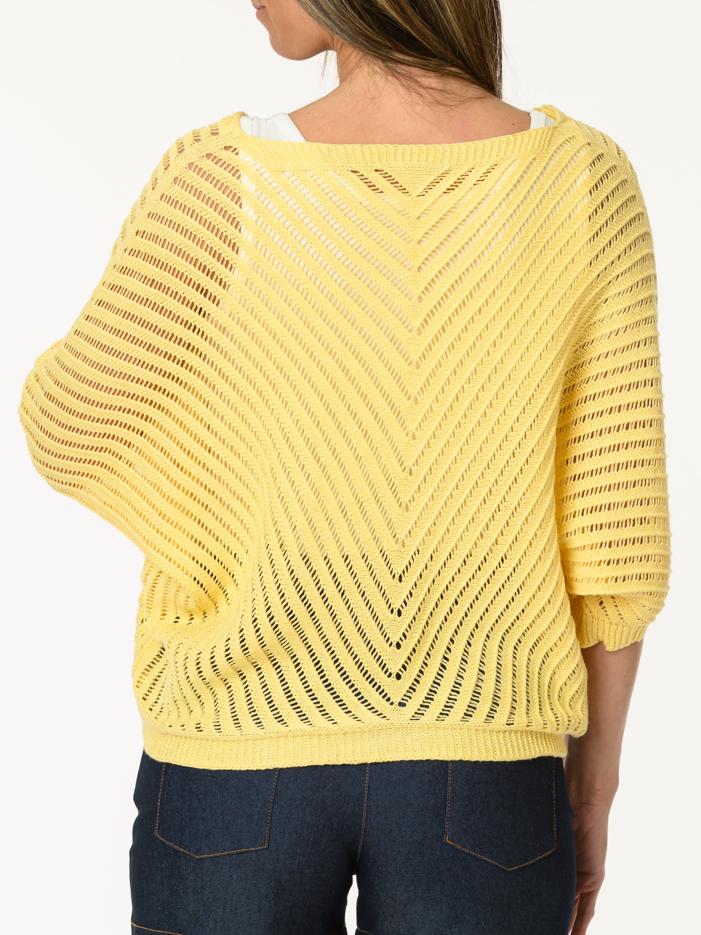 Découvrez notre chandail en mailles jaune. Ce chandail à manches chauve-souris comporte des rayures en diagonale qui forment un V au centre. Il est idéal pour être porté en superposition et il allie style et confort.