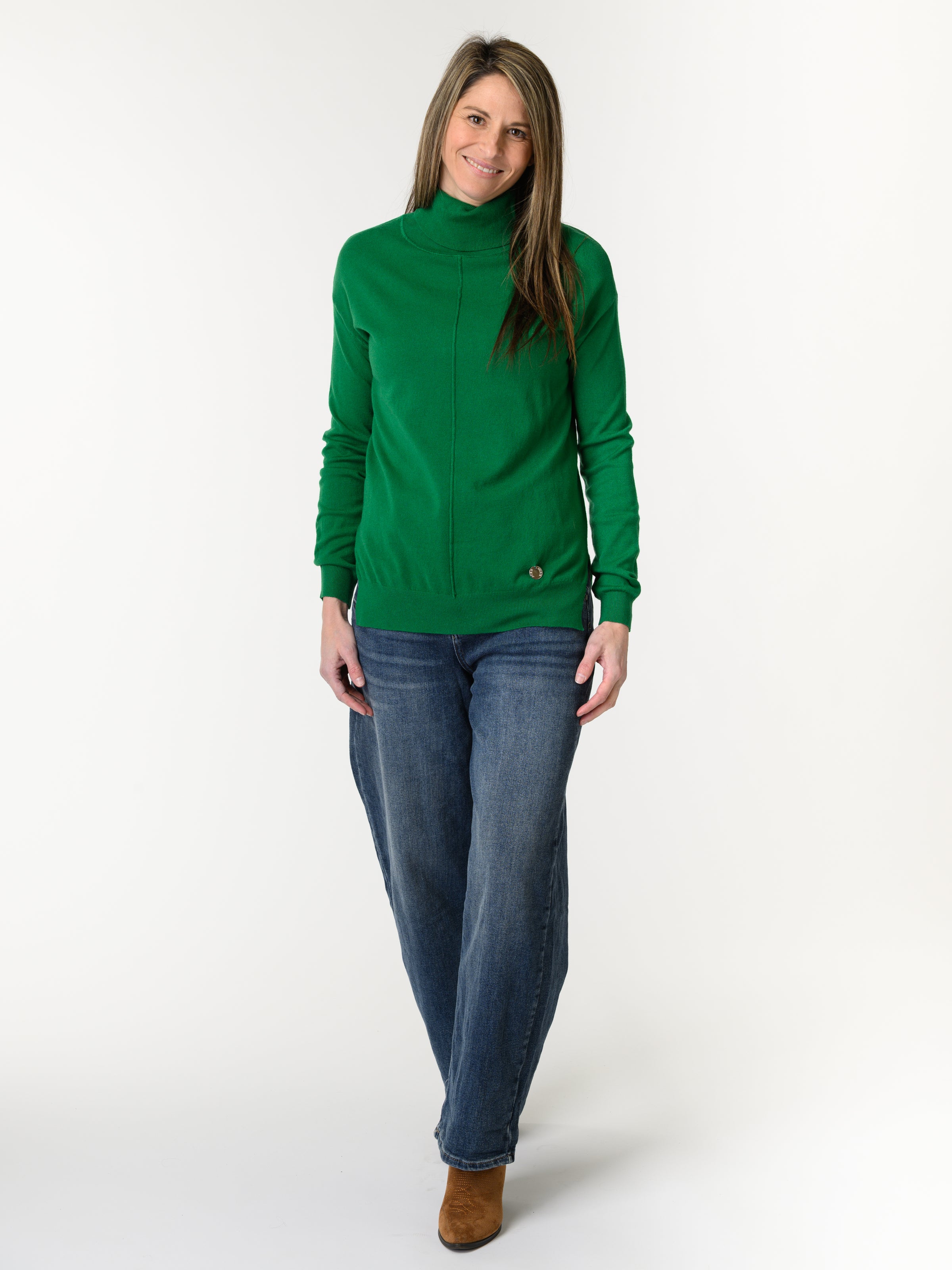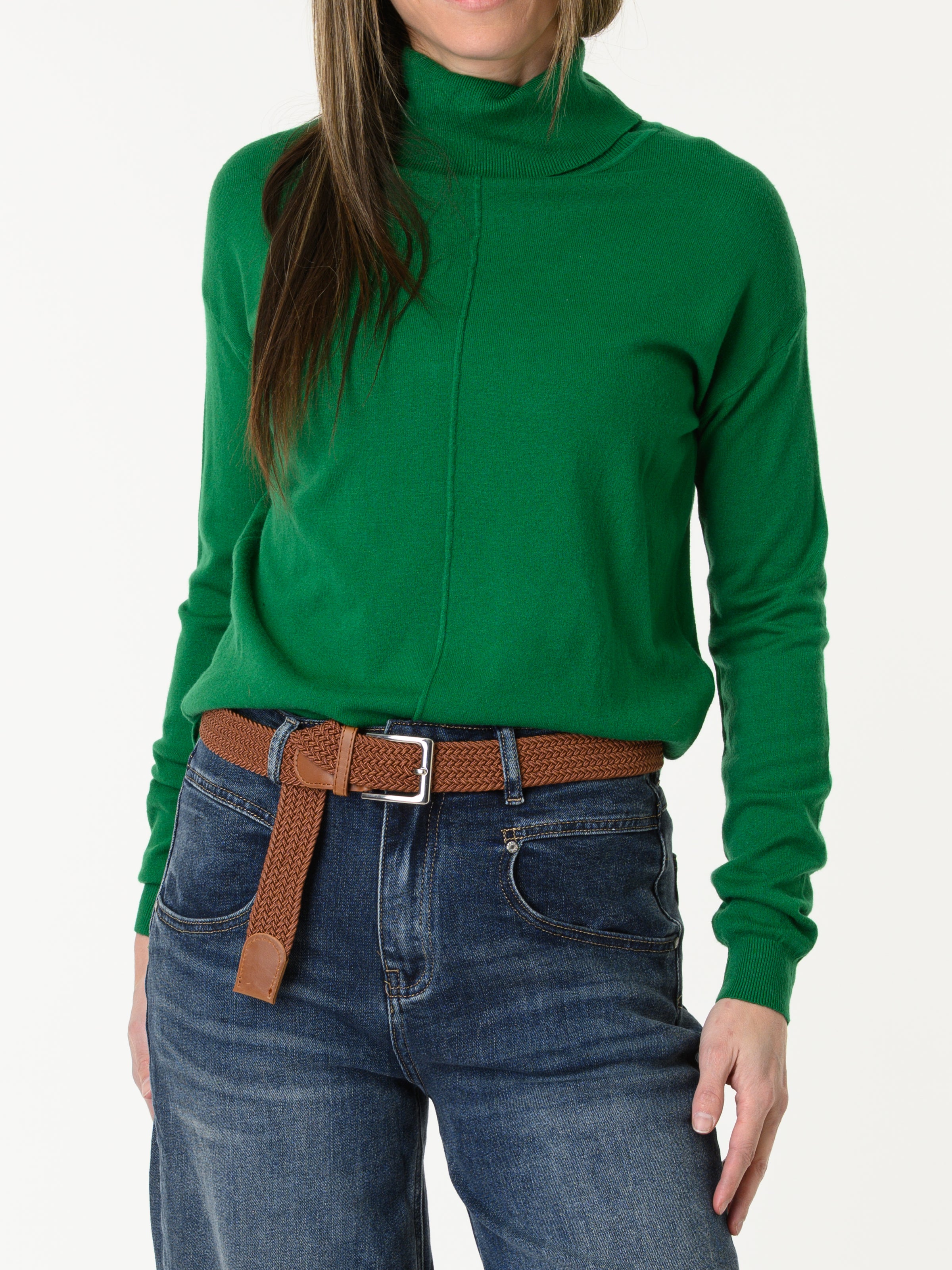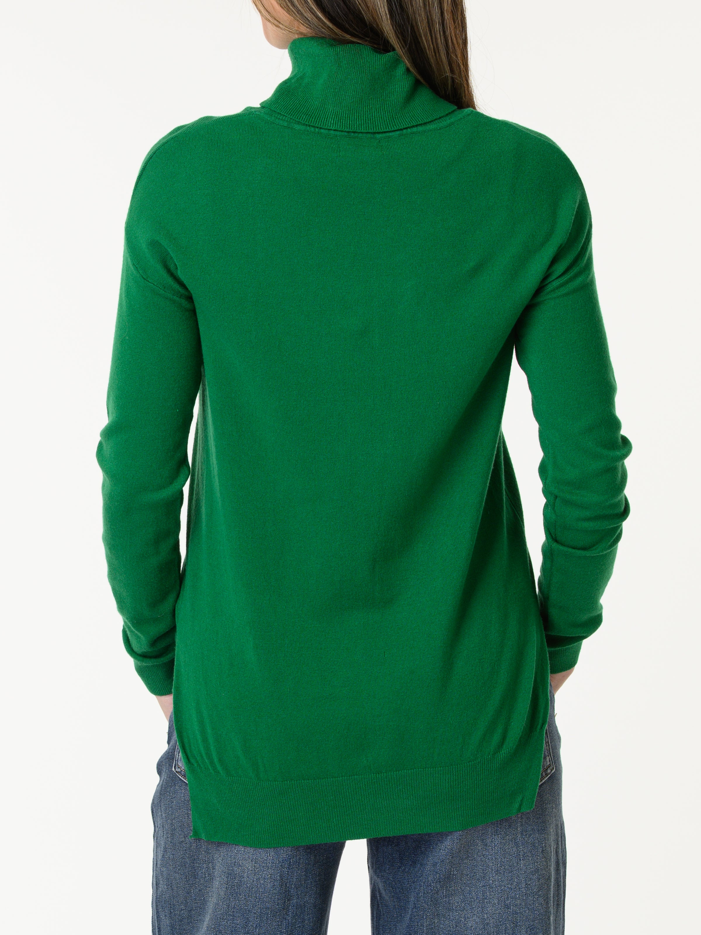 Découvrez notre chandail vert à col roulé manche longue. Ce modèle de couleur unie comporte un col roulé et il est orné d'une couture verticale au milieu. Ce chandail s'agence bien avec une variété de looks. Cette pièce ajoute une touche classique et allie style et confort.